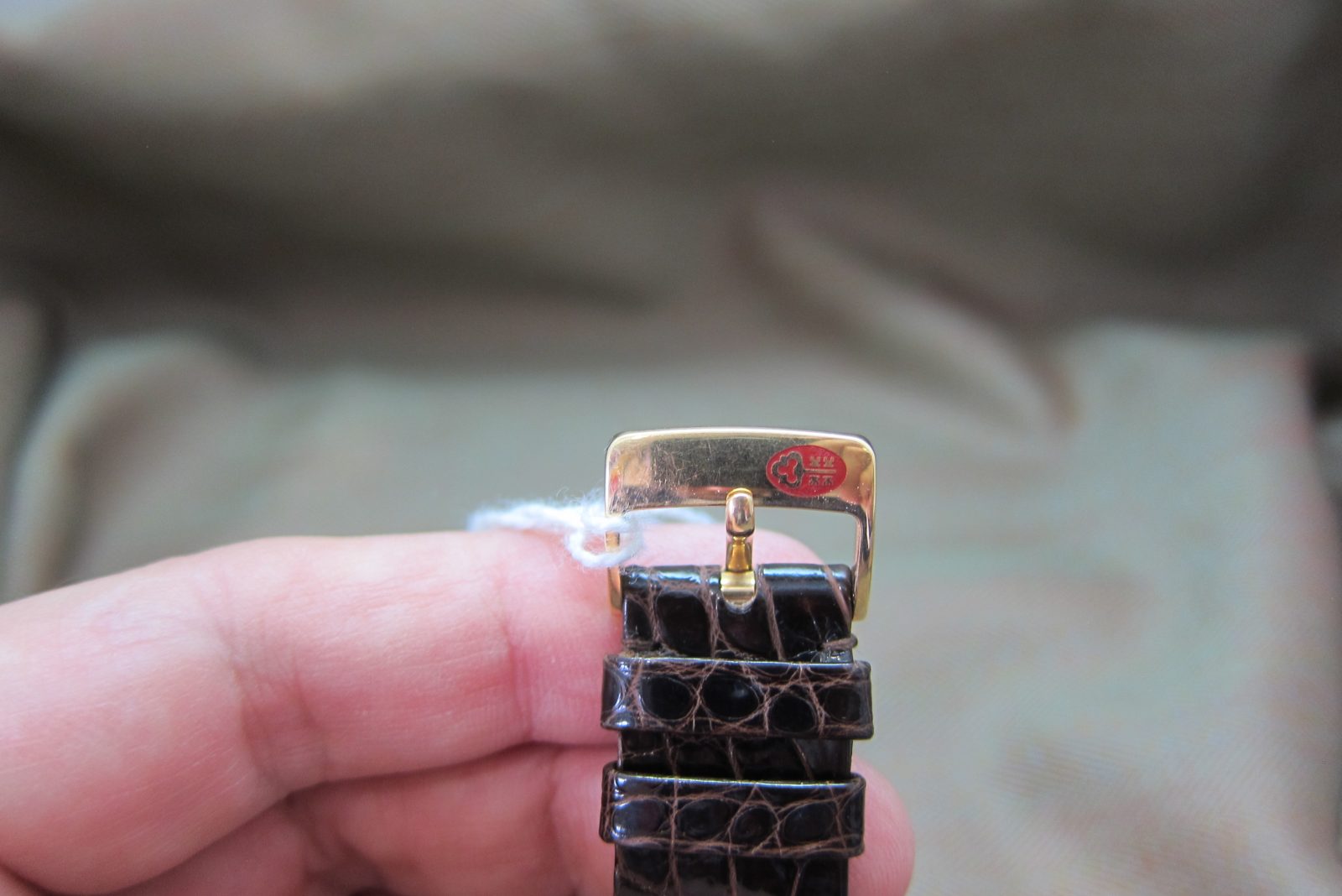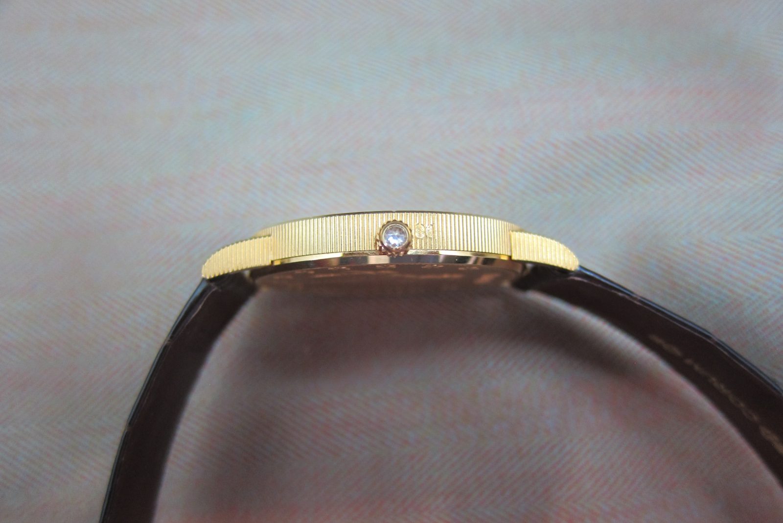 The 18k gold case measures 35 mm and is in mint condition, with a clean bezel and defined coin edge finish on the sides.
