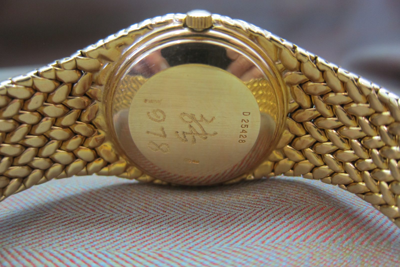 The 18k case measures 34 mm and is in excellent condition, featuring a hallmark on the caseback and a personalized engraving.