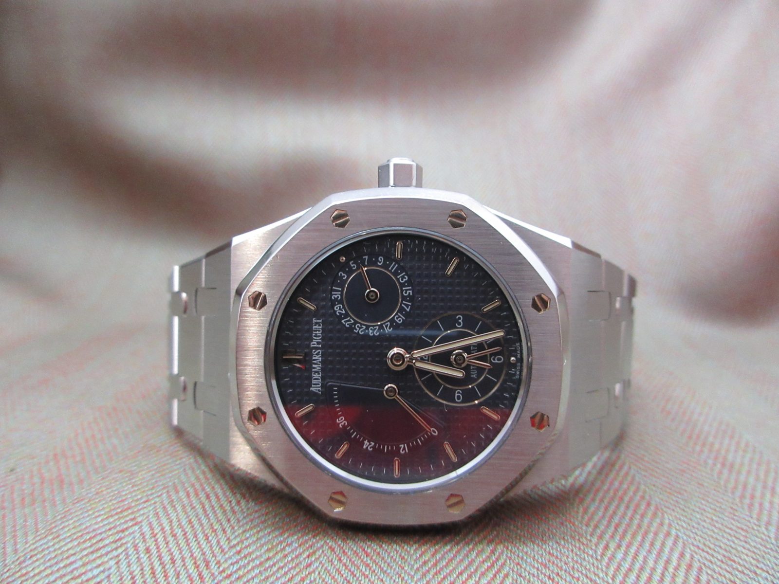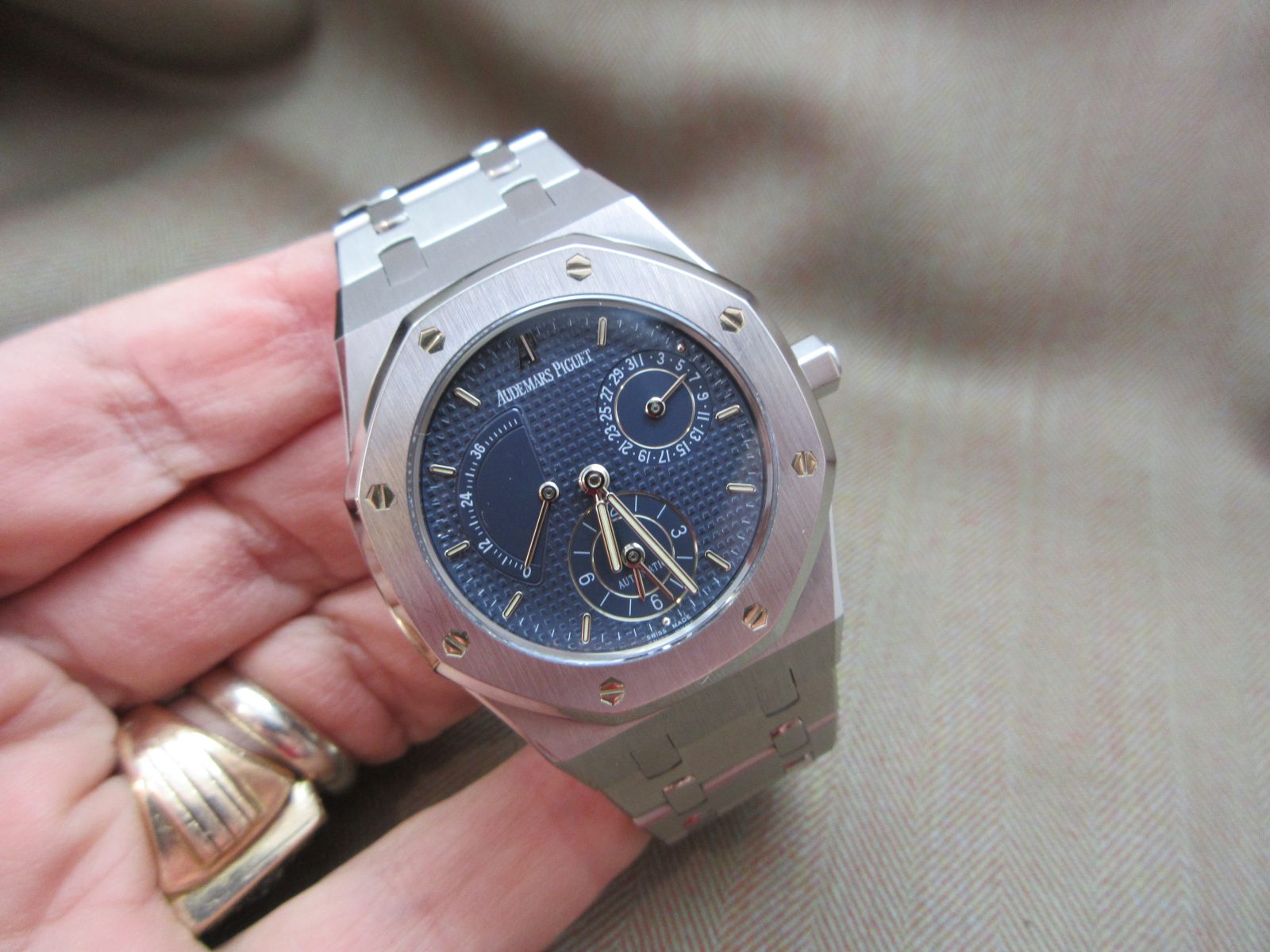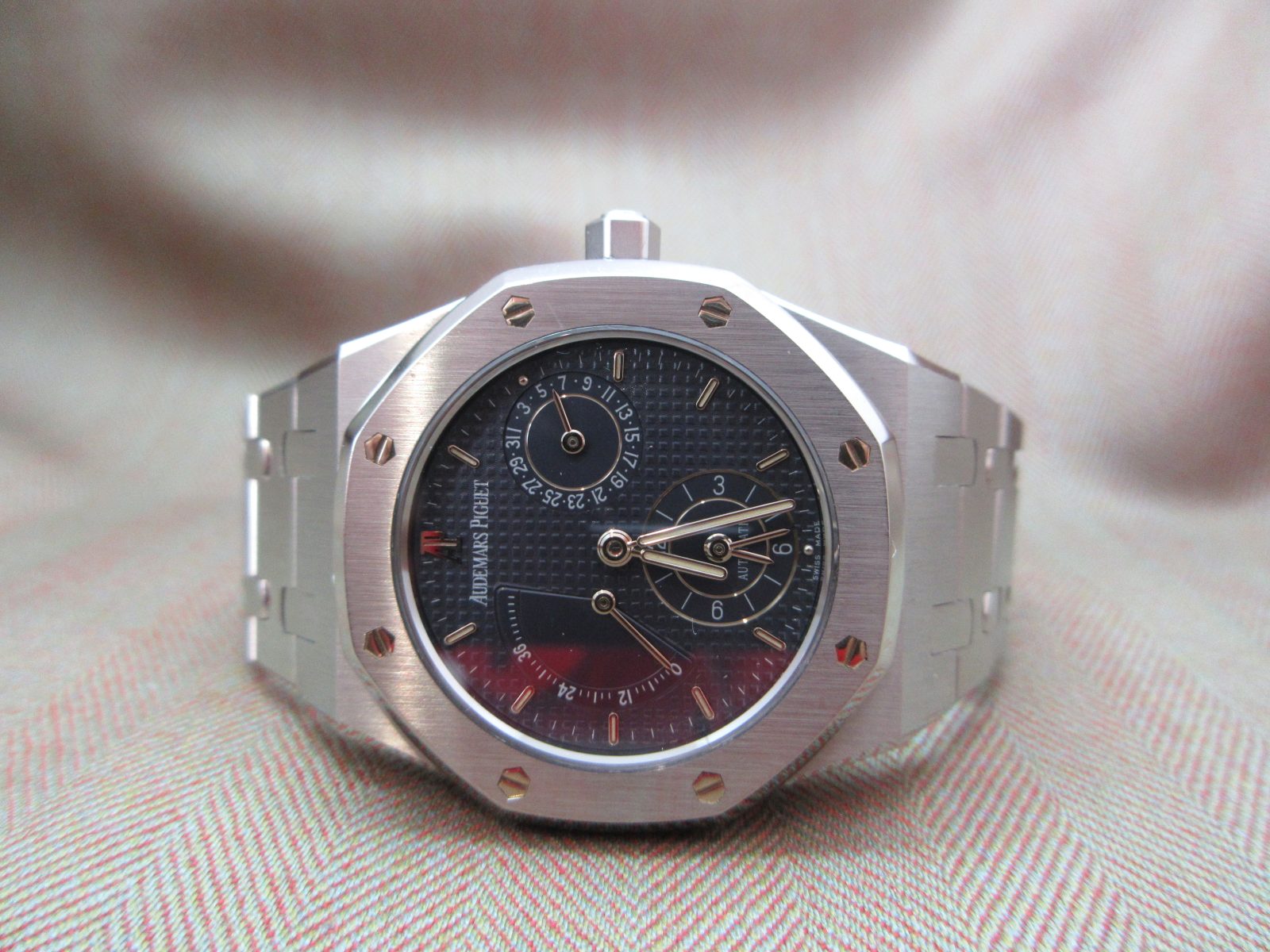 Audemars Piguet Vintage Royal Oak Dual Time Power Reserve Ref. 25730 in ultra-mint condition. Featuring the dual time and power reserve complication, this example is exceptionally well preserved. Comes with service and archive papers, inner and outer octagonal box. A rare find for collectors seeking a pristine, complicated vintage Royal Oak.