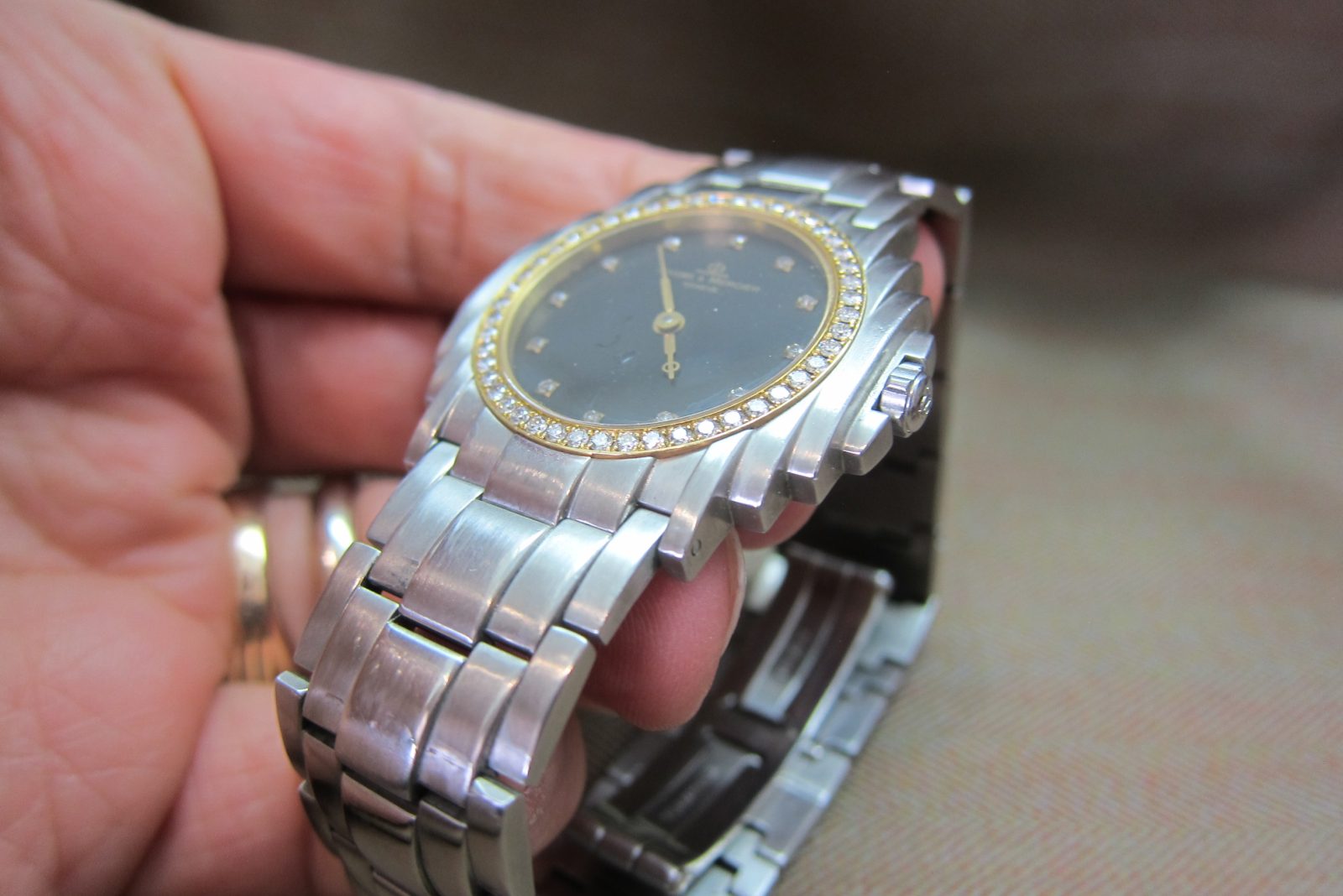 Baume & Mercier Vintage Steel Shogun featuring a rare black diamond dial and diamond bezel—a standout piece that combines elegance with daring design.