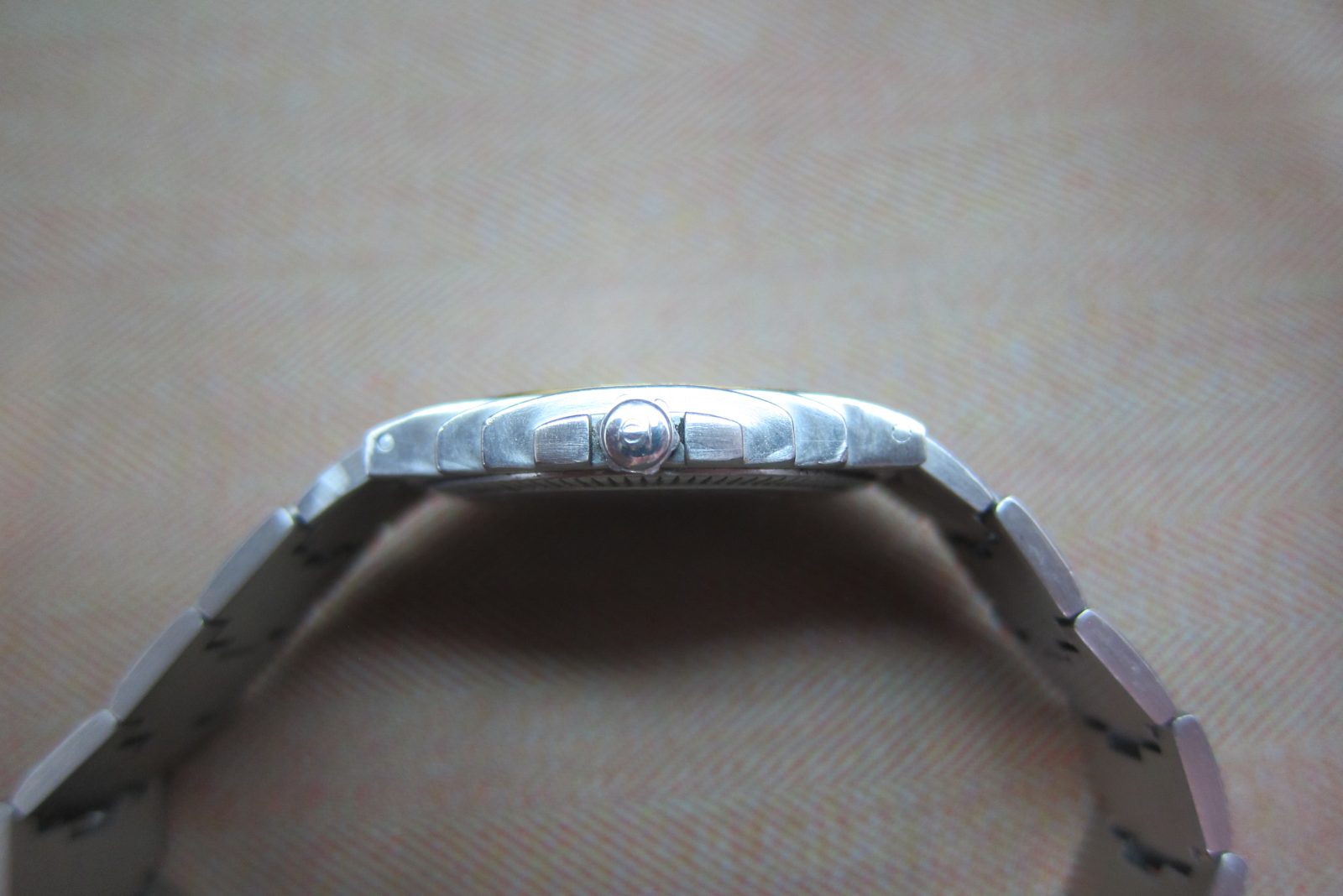On its original steel bracelet and original steel clasp with removable links. Fits a size 7.