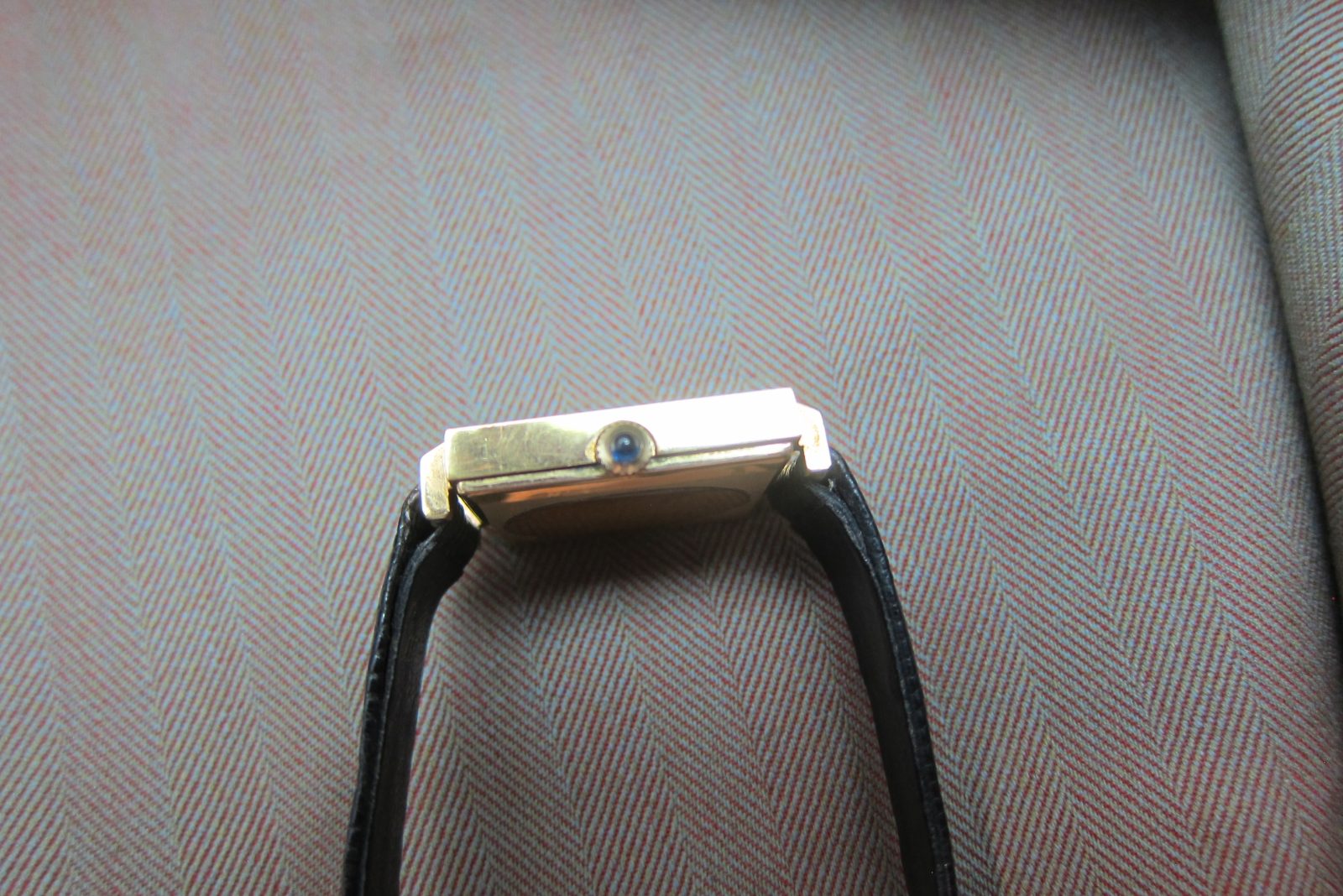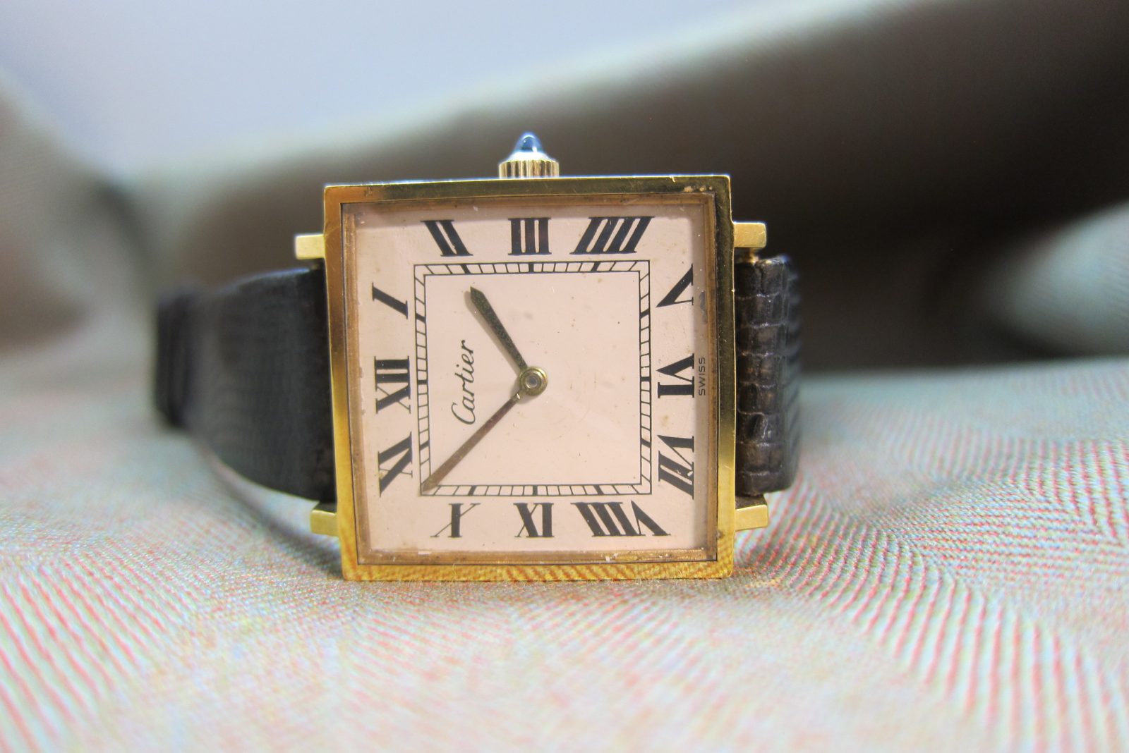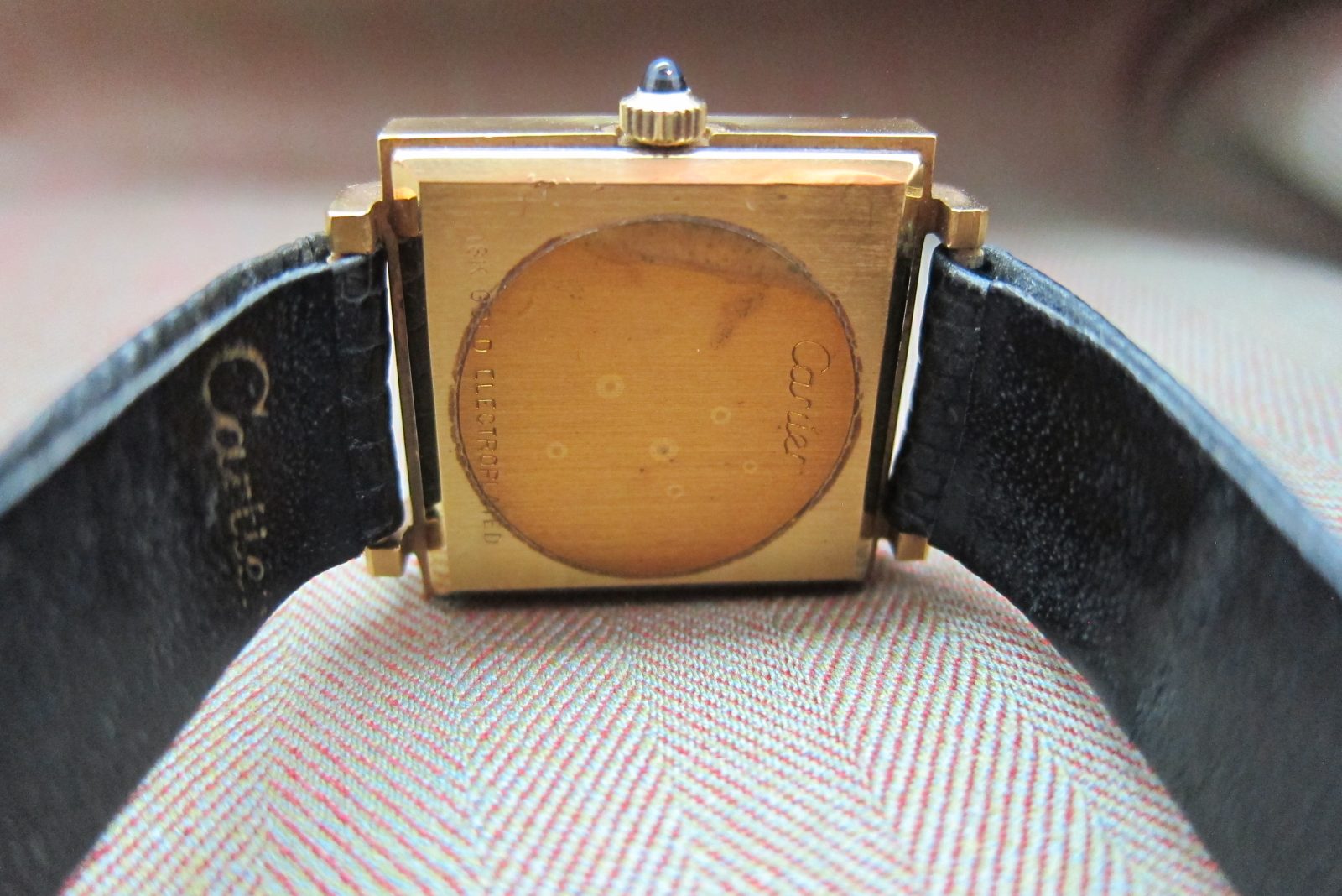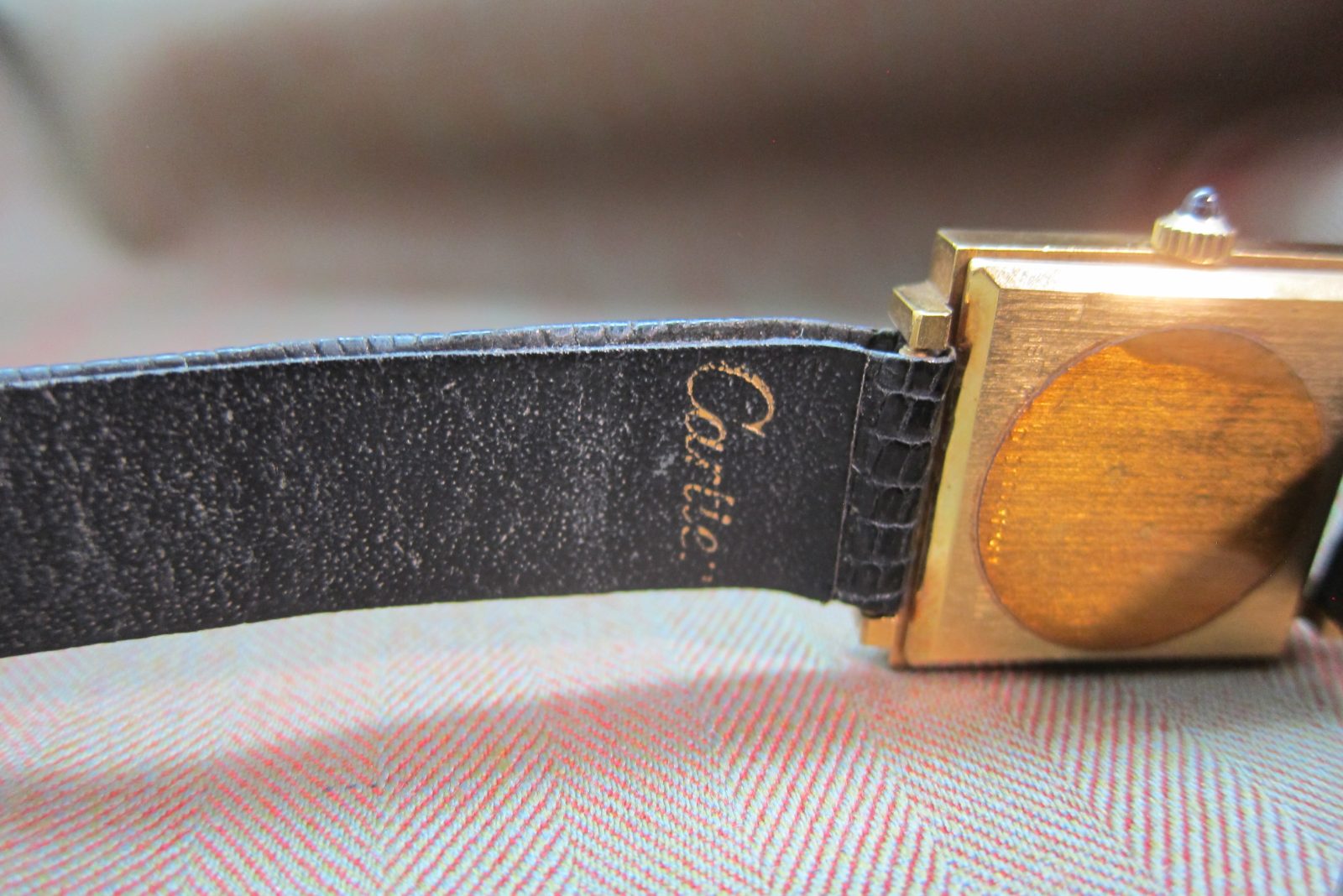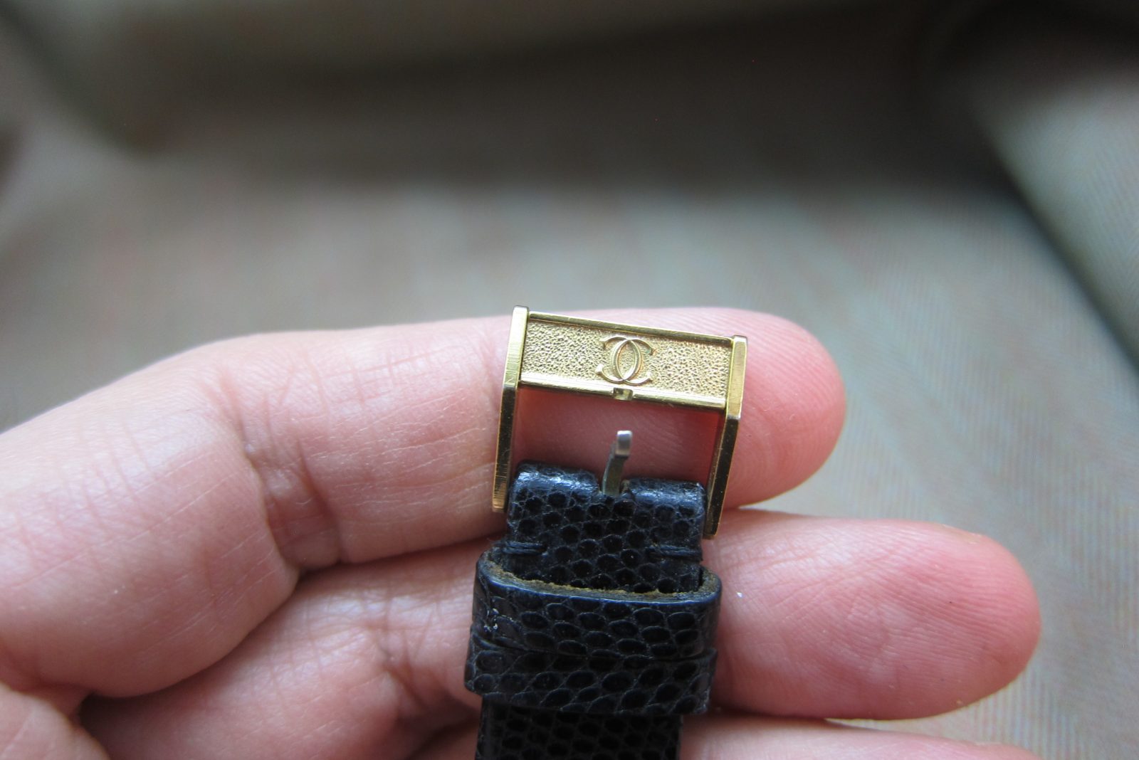 On its original Cartier strap secured by the original Cartier buckle.