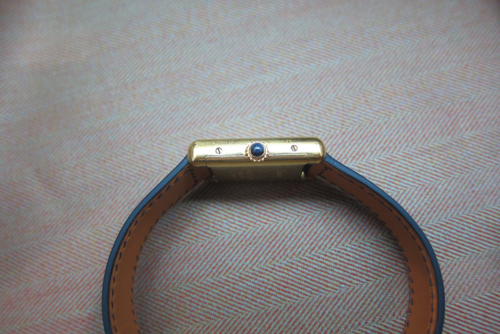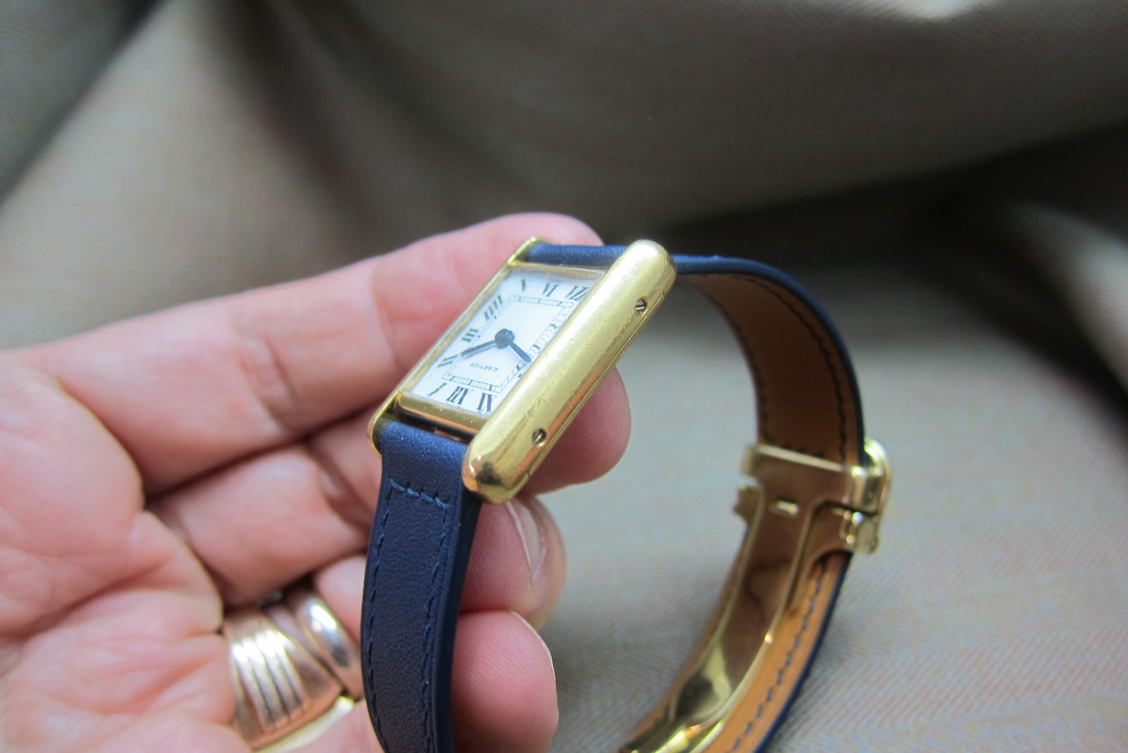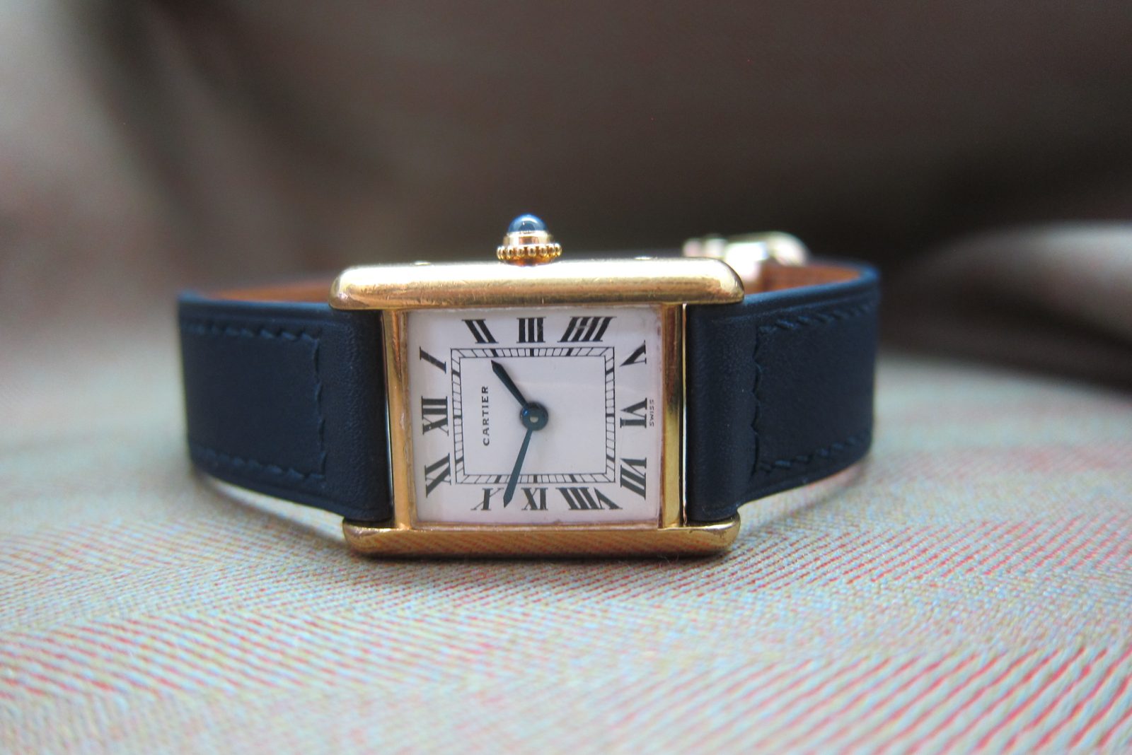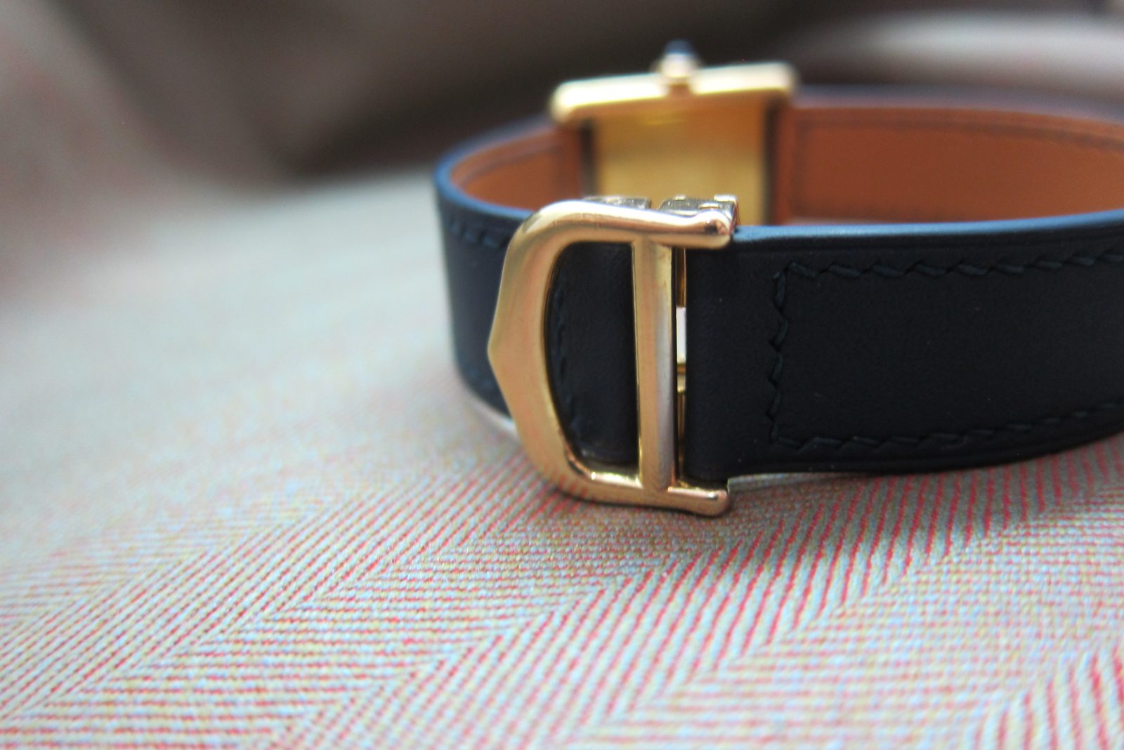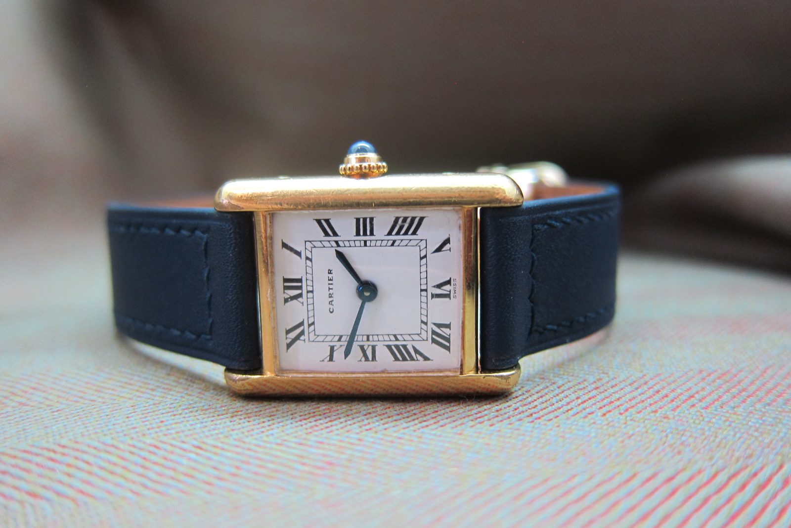 On a generic strap secured by the original gold-plated Cartier deployant buckle.