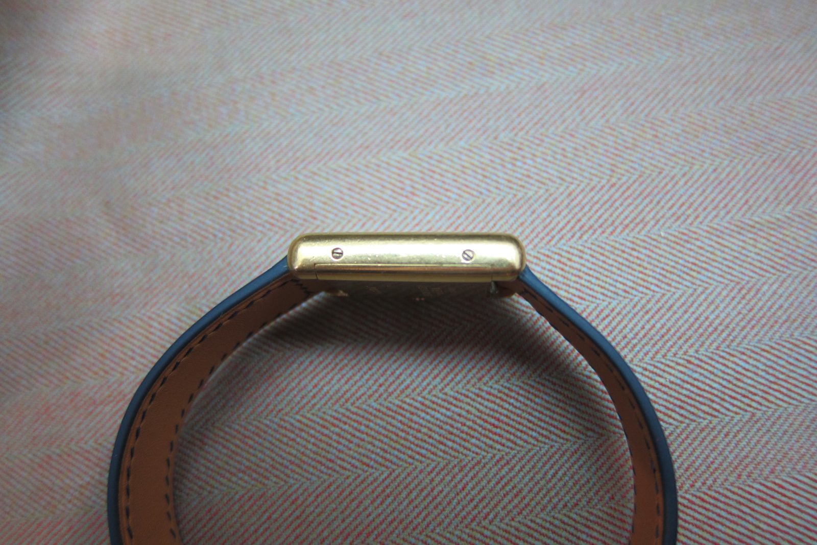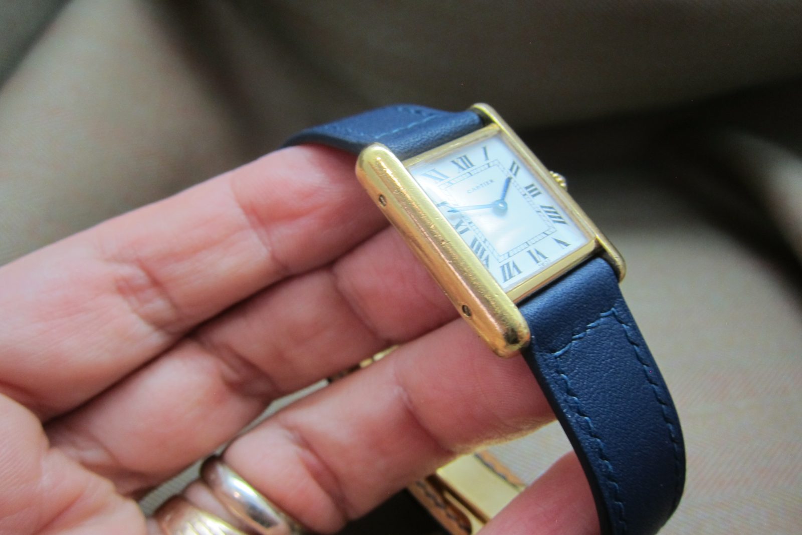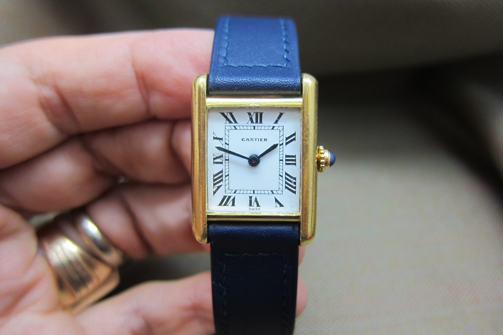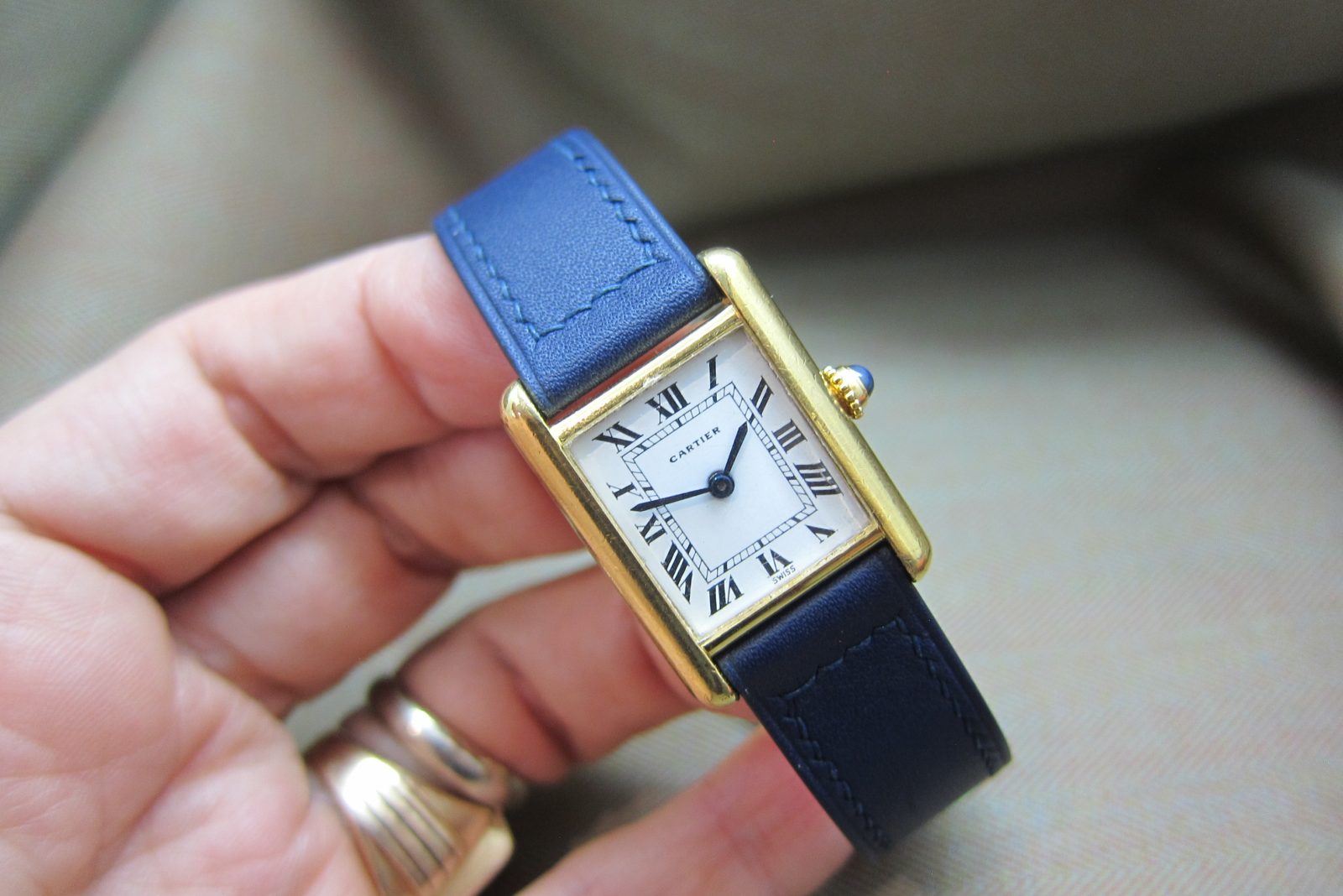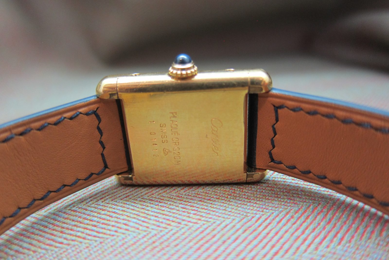 On a generic strap secured by the original gold-plated Cartier deployant buckle.