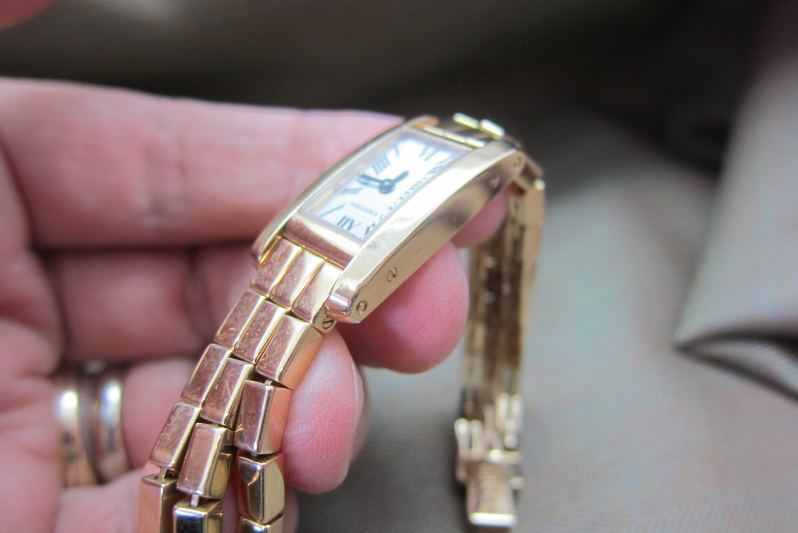 The 18k rose gold case measures 14 x 24 mm and is in excellent condition, with well-defined edges and clear hallmarks on the caseback.