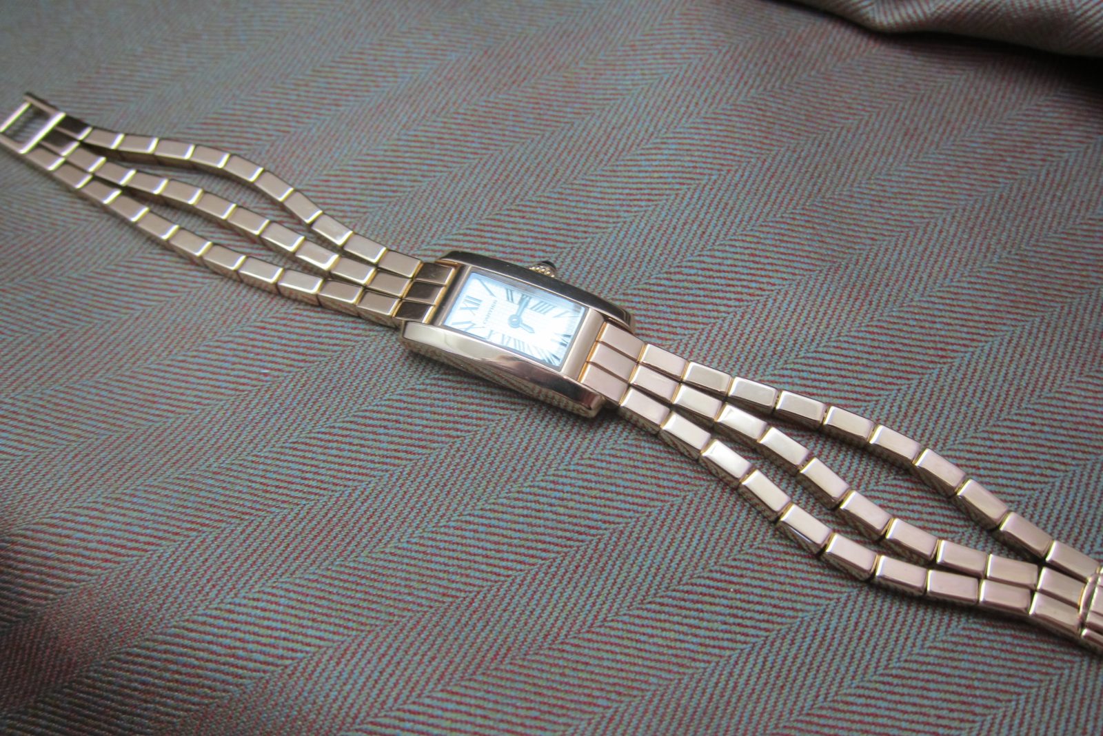 On its On its original 18k rose gold Lanières bracelet, measuring 6.6 inches in total length and secured by the original 18k clasp.
