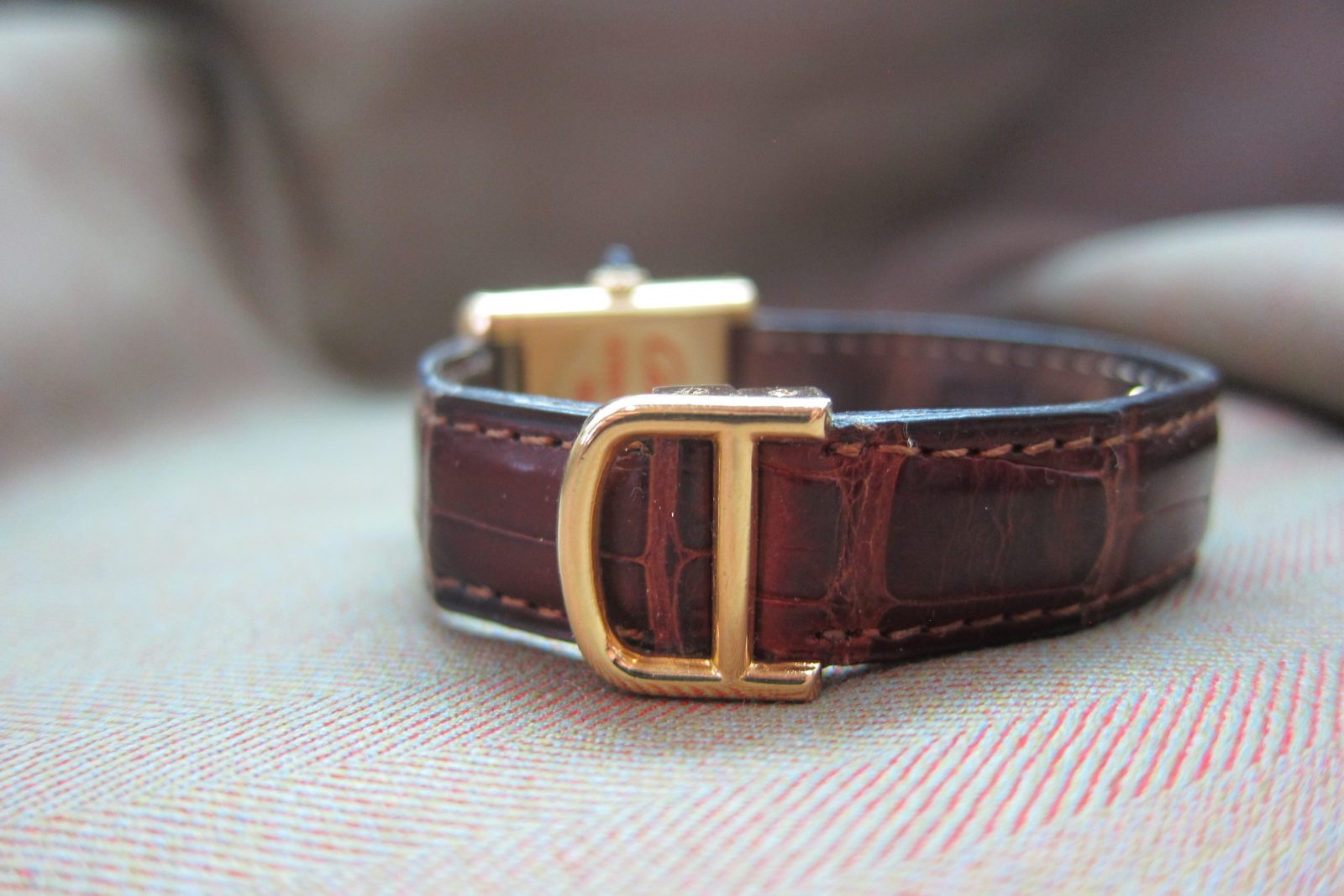 On a generic strap secured by the original 18k Cartier deployant clasp. Fits a size 6.