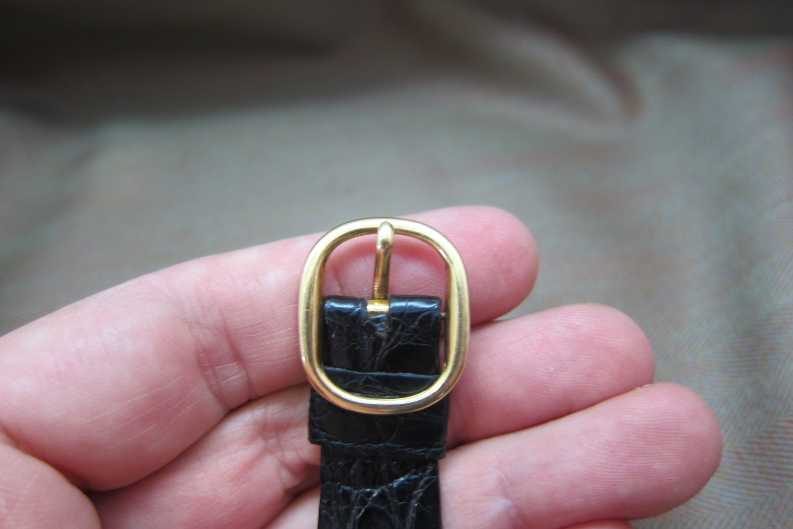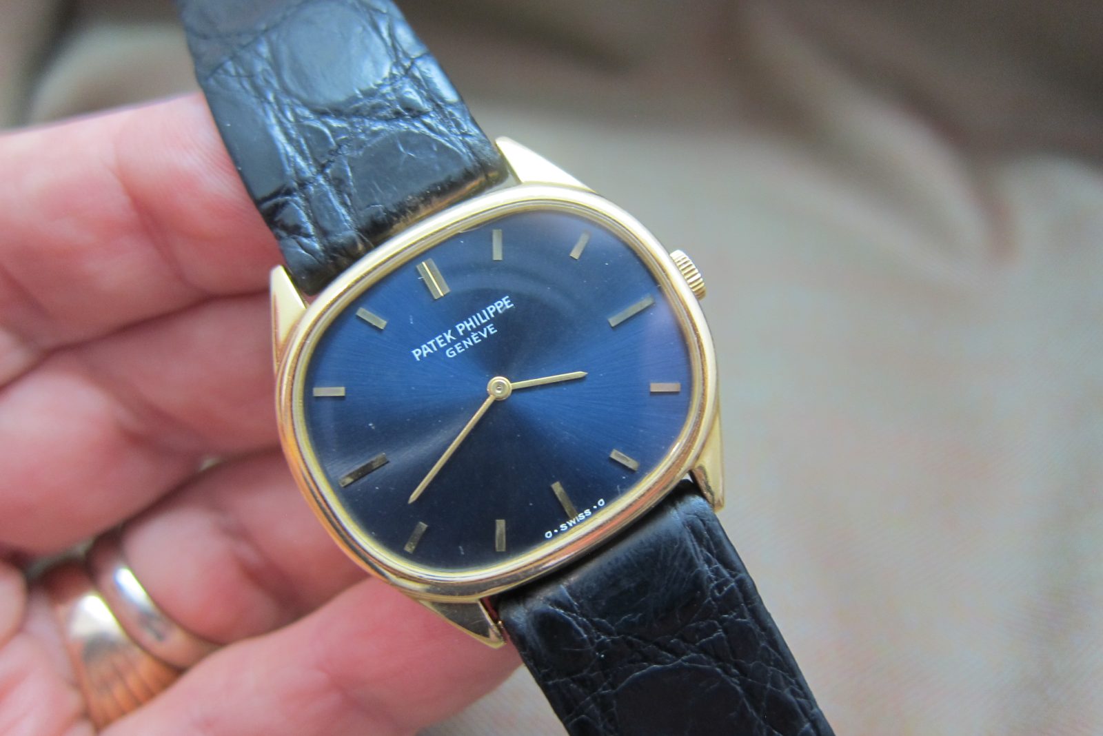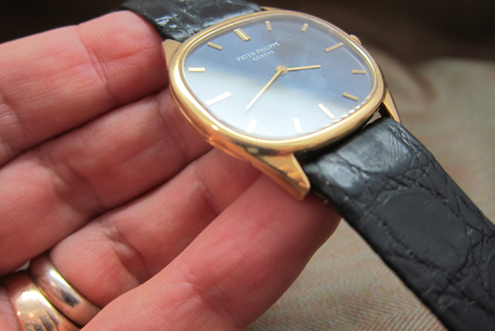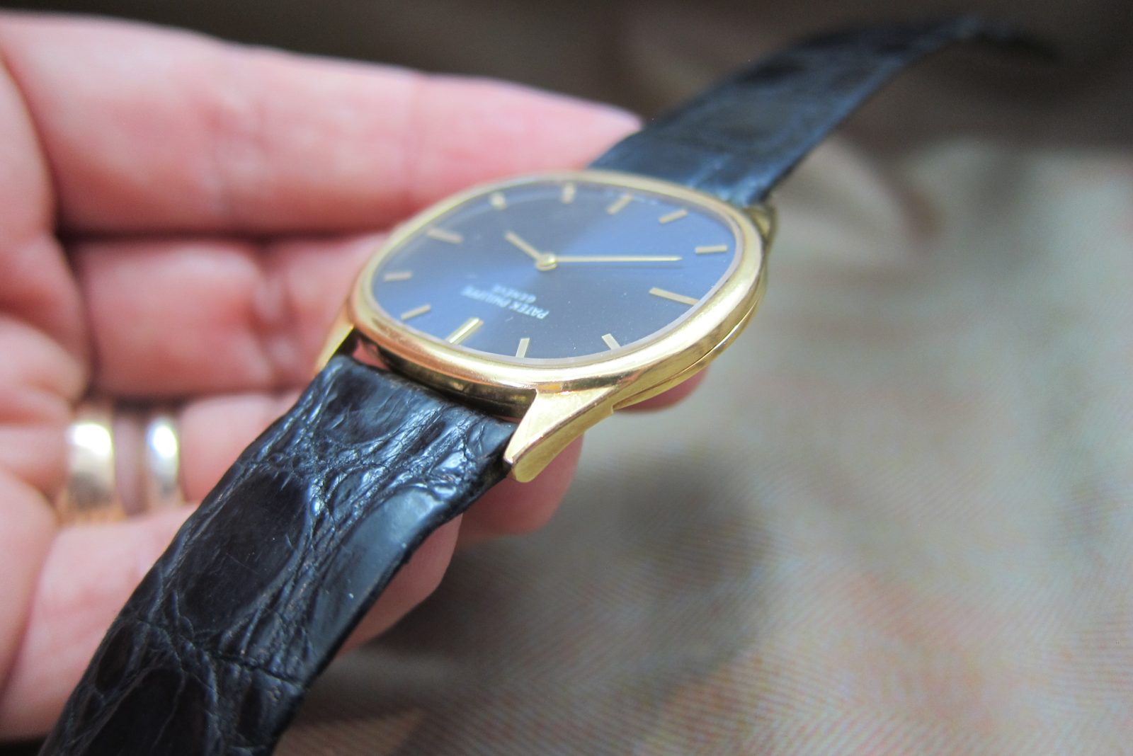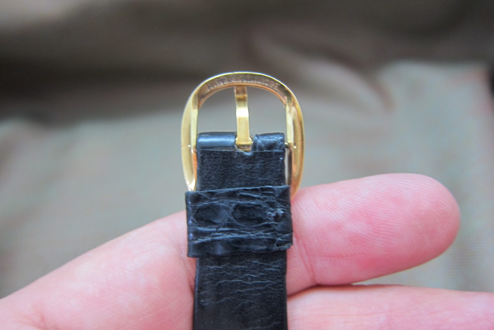 On an alligator skin strap secured by the original 18k Patek Philippe buckle.
