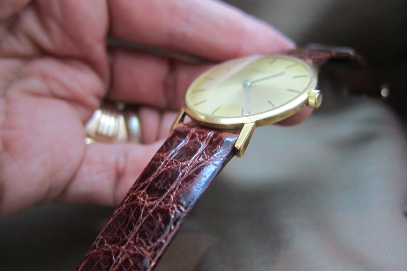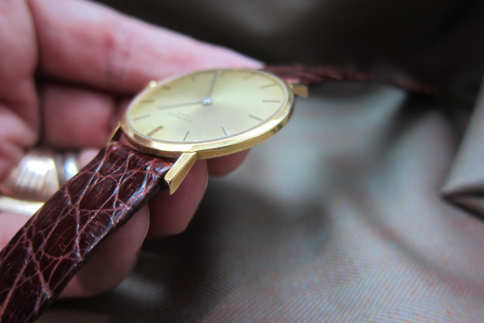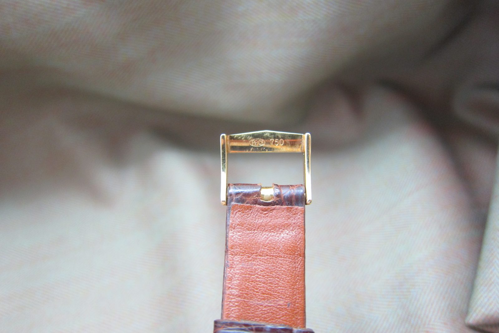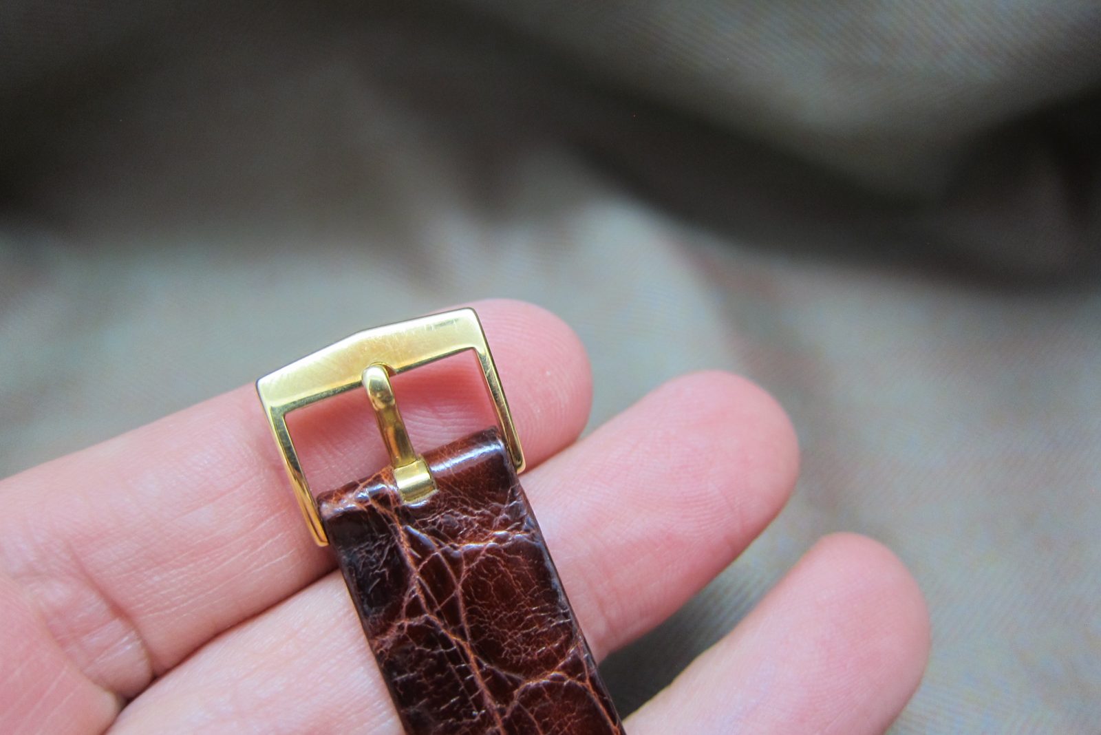 On an alligator skin strap secured by the original 18k buckle.
