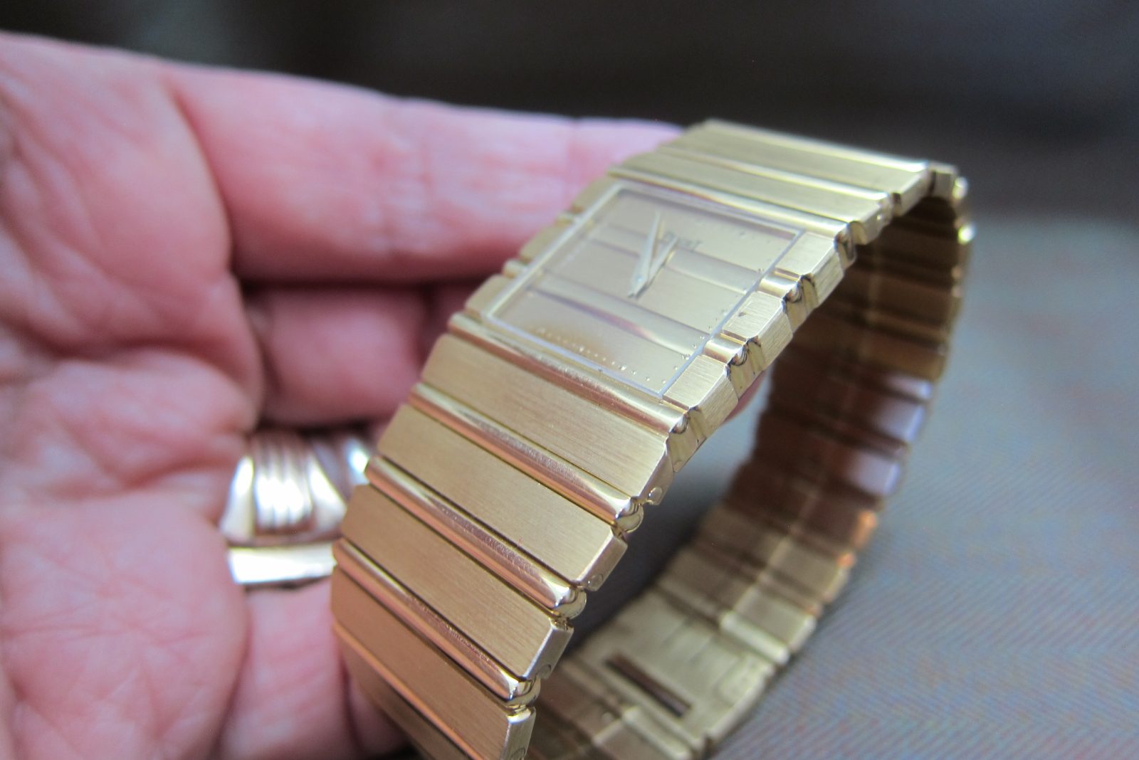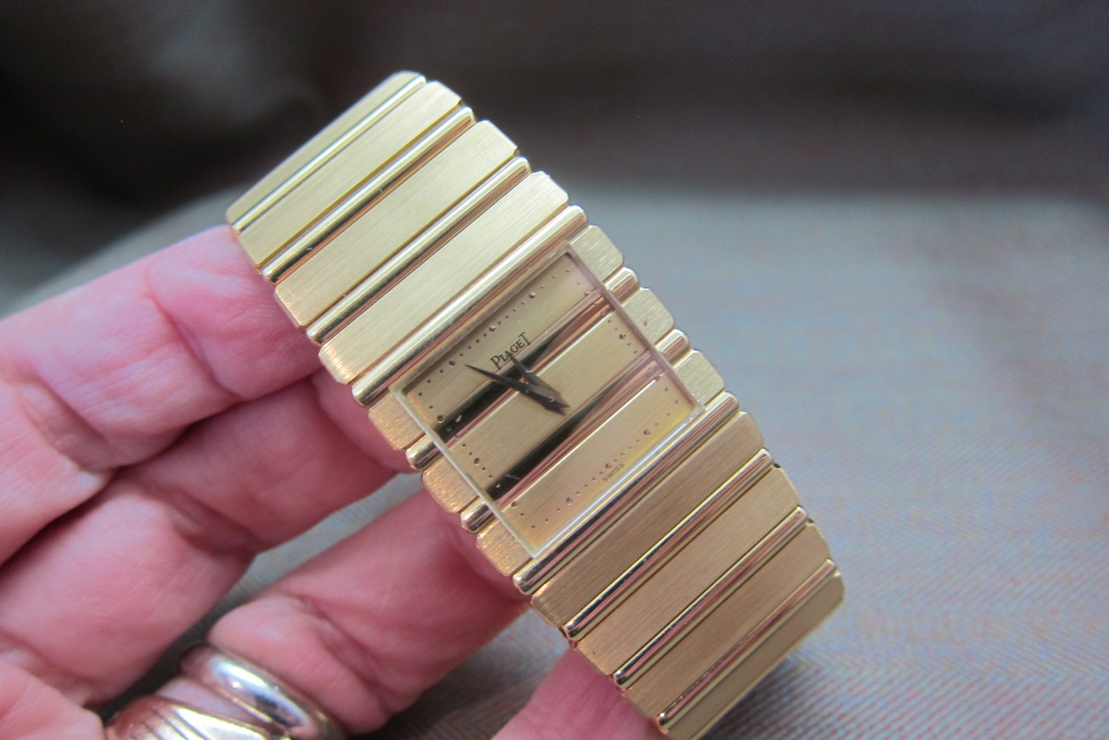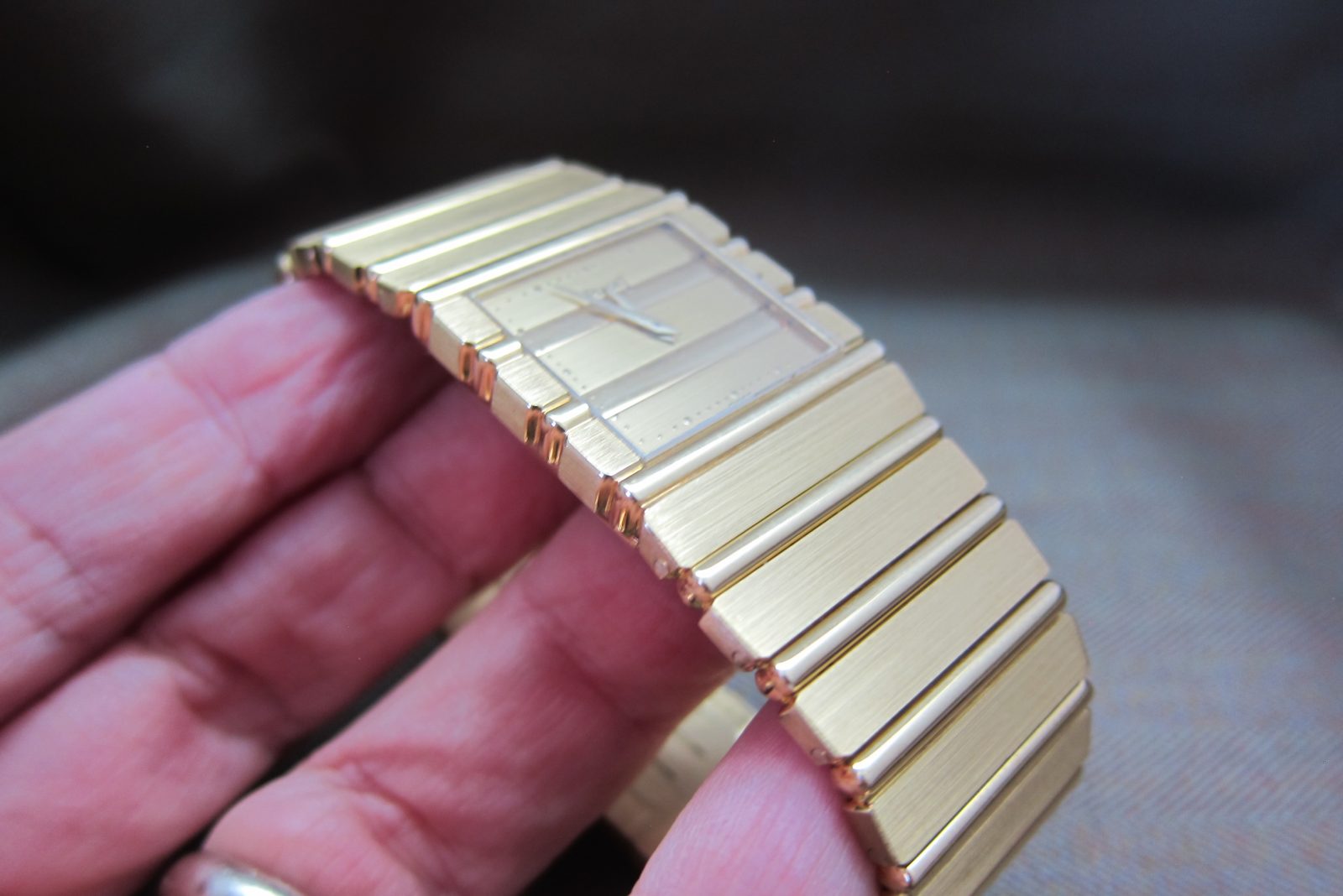 The 18k case measures 25 mm and is in great condition with an engraved hallmark on the back, complete with a engraved serial number and logo on the back. The champagne dial is in excellent condition. Powered by a consistent quartz battery that runs smoothly. Adorned on the iconic and original 18k Polo bracelet, with a total length of 7.25 inches, and will fit 6.75. Simply a gem.