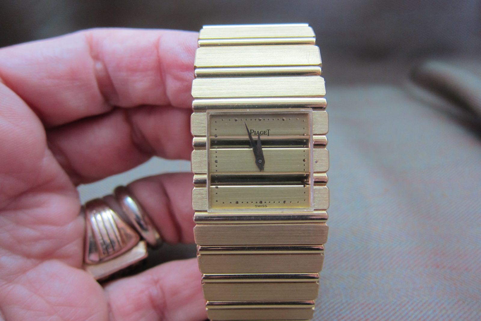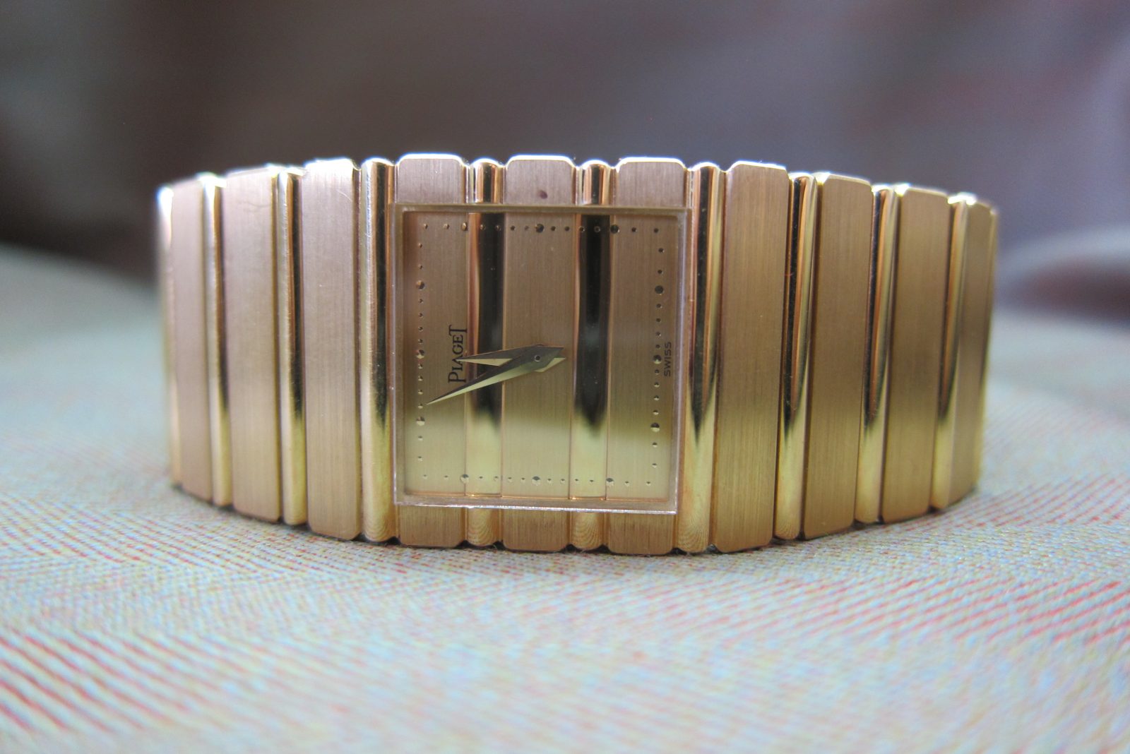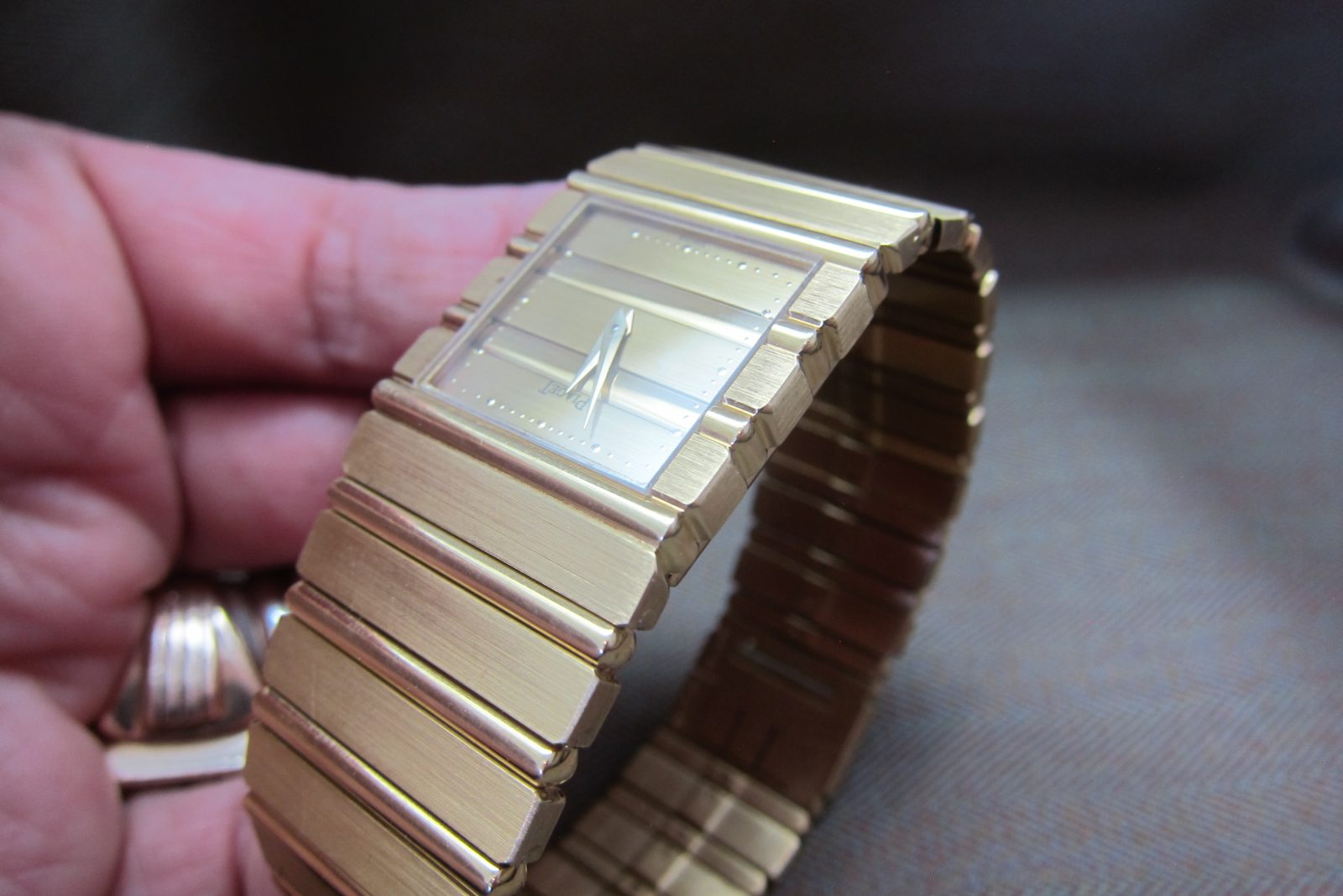 The 18k case measures 25 mm and is in great condition with an engraved hallmark on the back, complete with a engraved serial number and logo on the back. The champagne dial is in excellent condition. Powered by a consistent quartz battery that runs smoothly. Adorned on the iconic and original 18k Polo bracelet, with a total length of 7.25 inches, and will fit 6.75. Simply a gem.