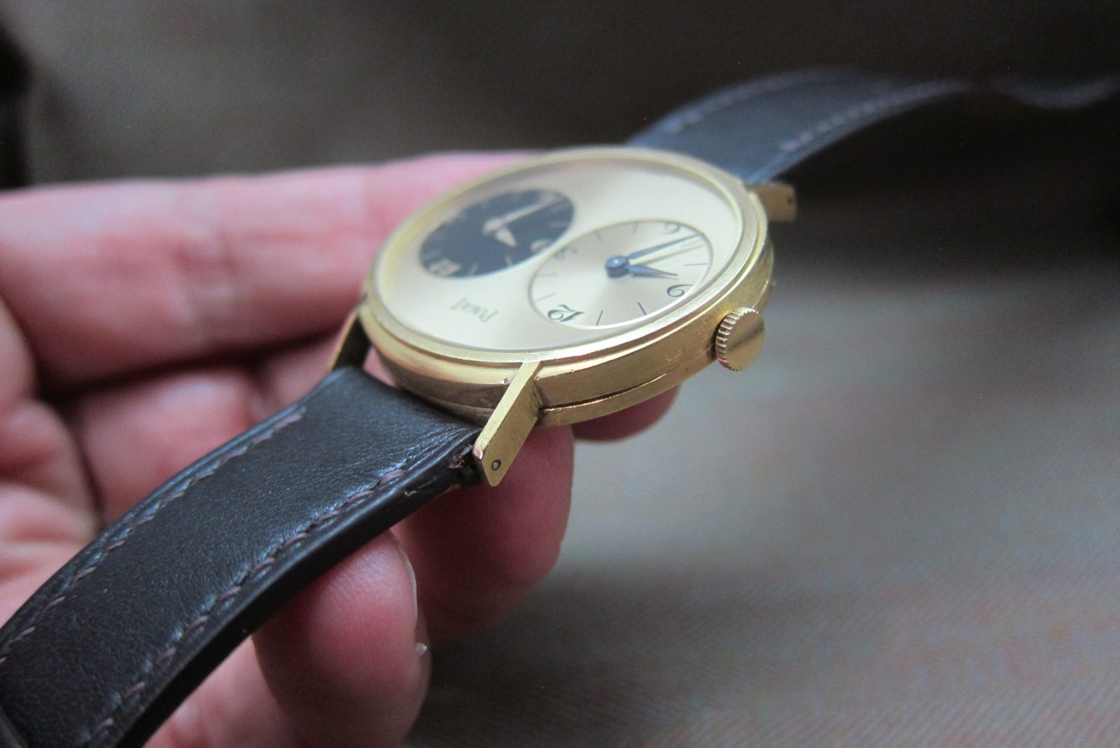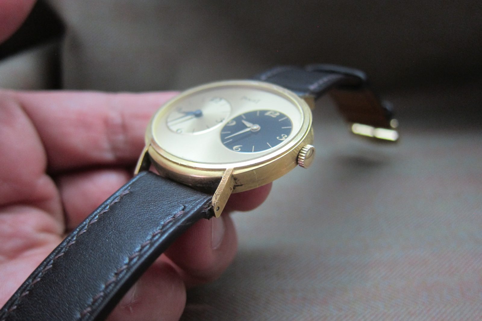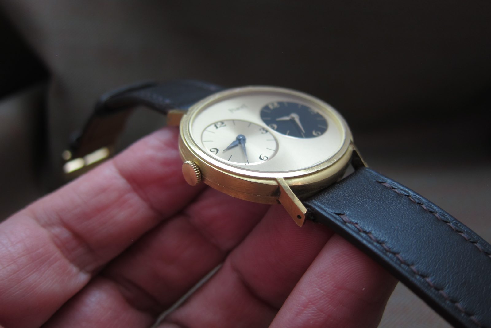 The 18k gold oval-shaped case measures 33 mm and is in excellent overall condition, featuring a deep serial engraving on the caseback and a crisp hallmark. The two crowns slightly differentiate.