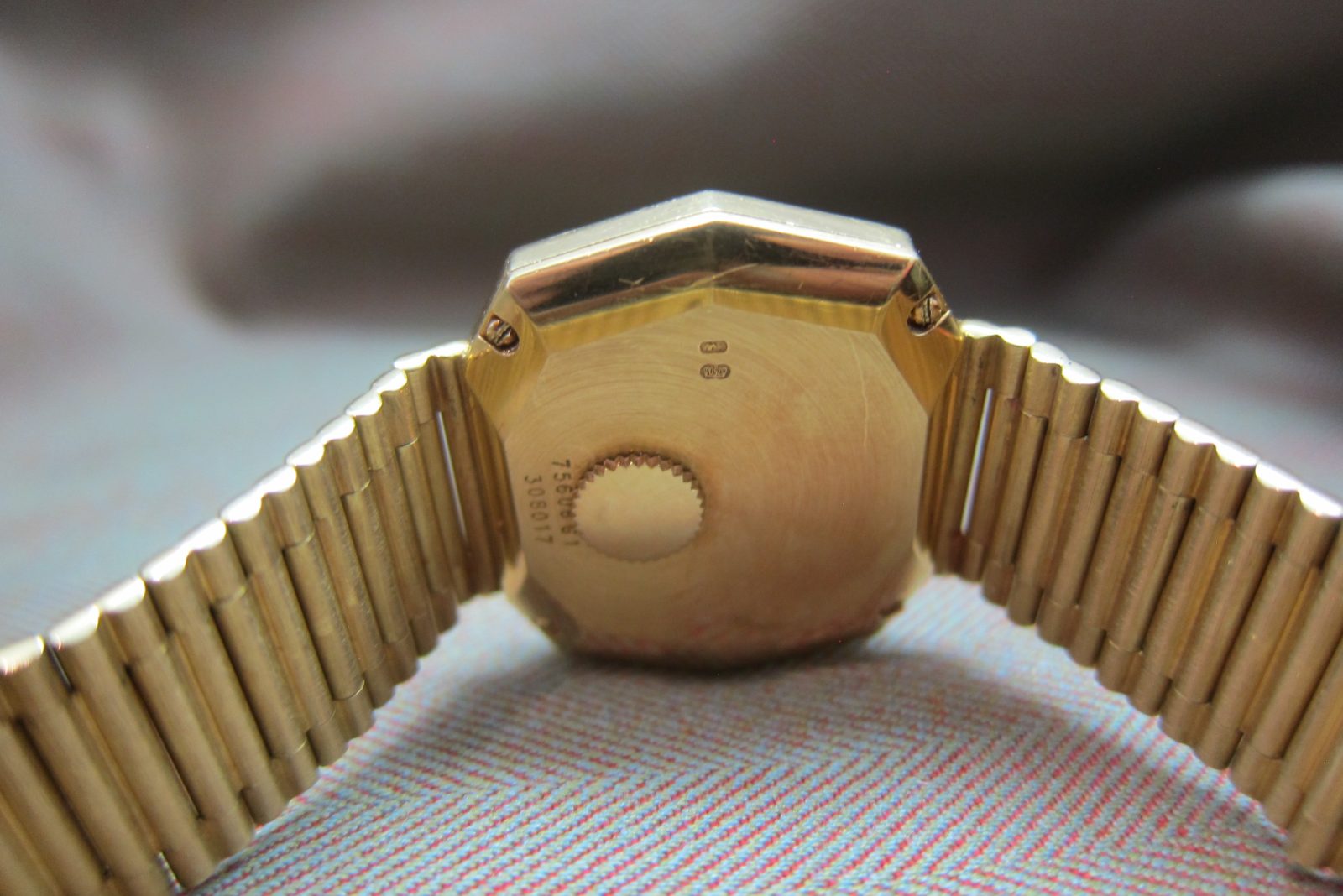 The 18k case measures 30 Ă— 24 mm and is in great condition, featuring crisp hallmarks on the caseback along with its engraved reference number.