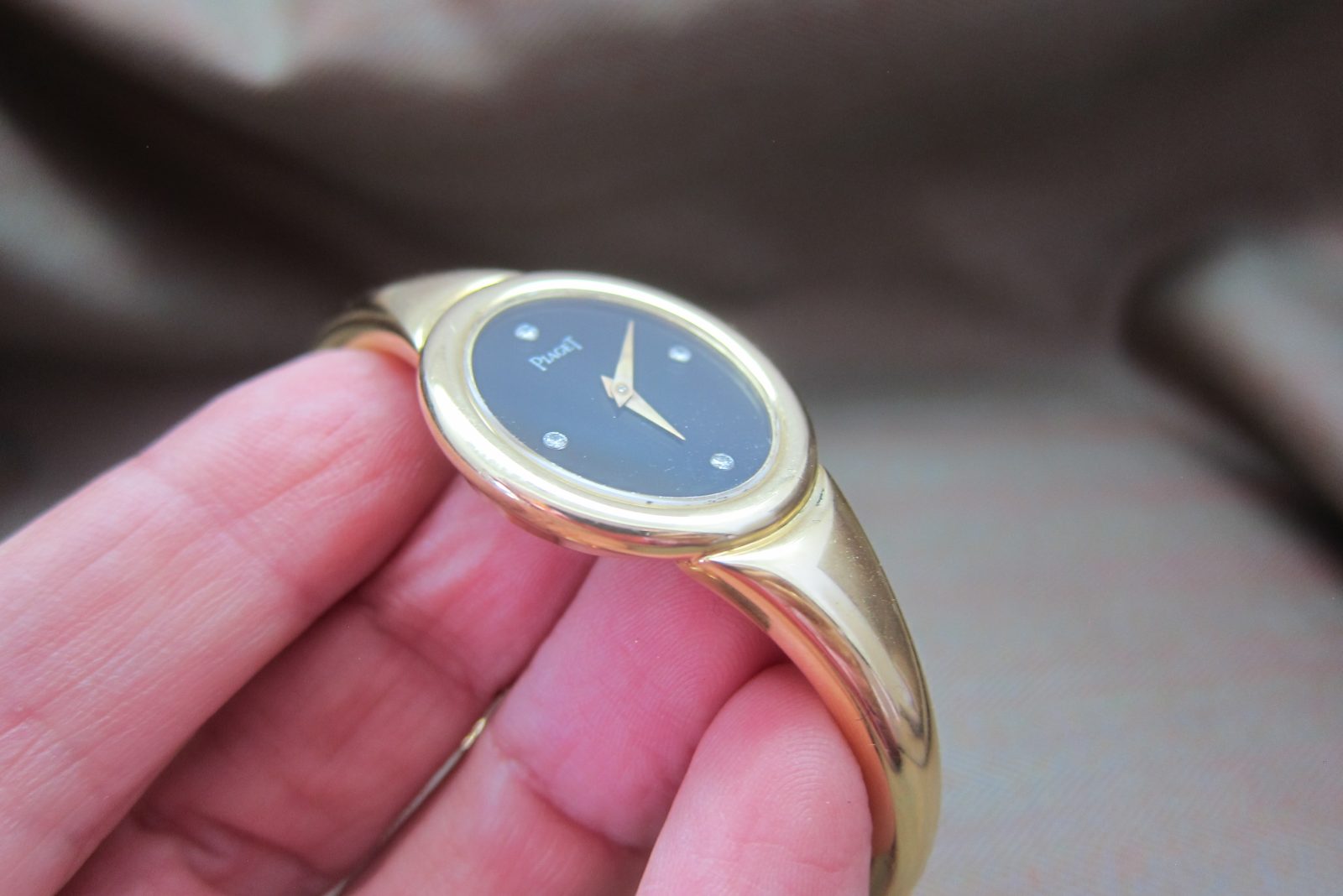 This Piaget 18k oval cuff watch with a mint onyx dial is a perfect fusion of fine watchmaking and exquisite jewelry design. Its sleek oval form, luxurious 18k gold construction, and striking onyx dial make it a statement piece that embodies elegance, sophistication, and timeless style.