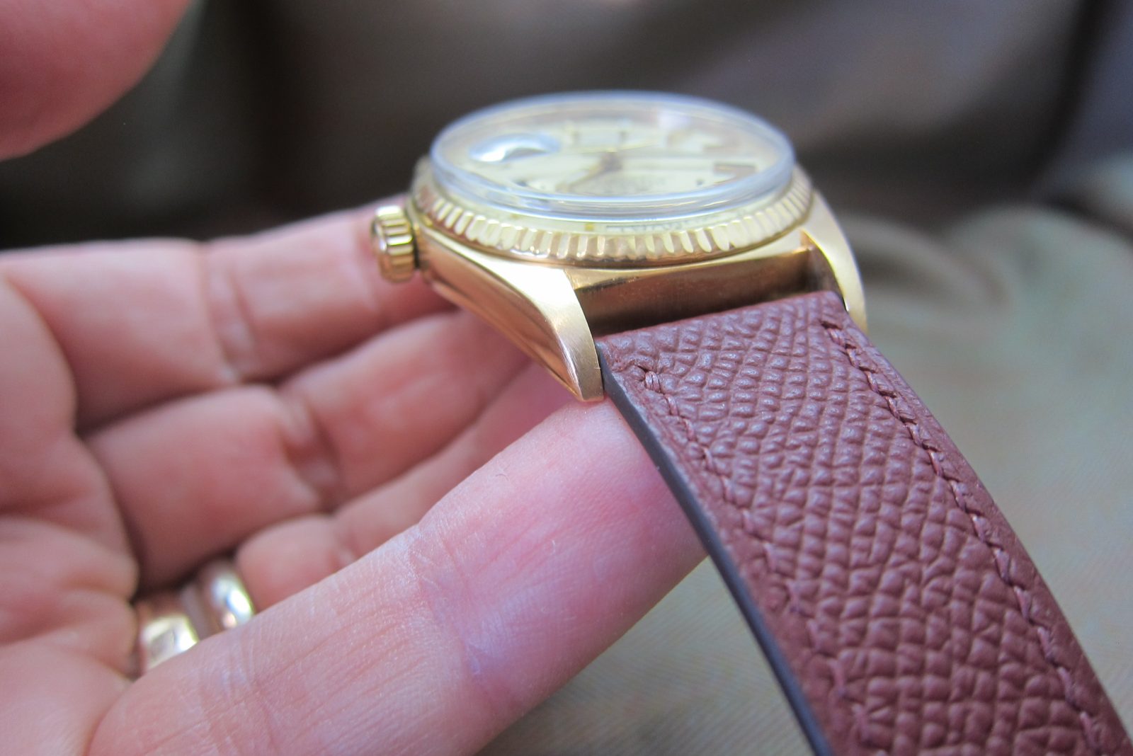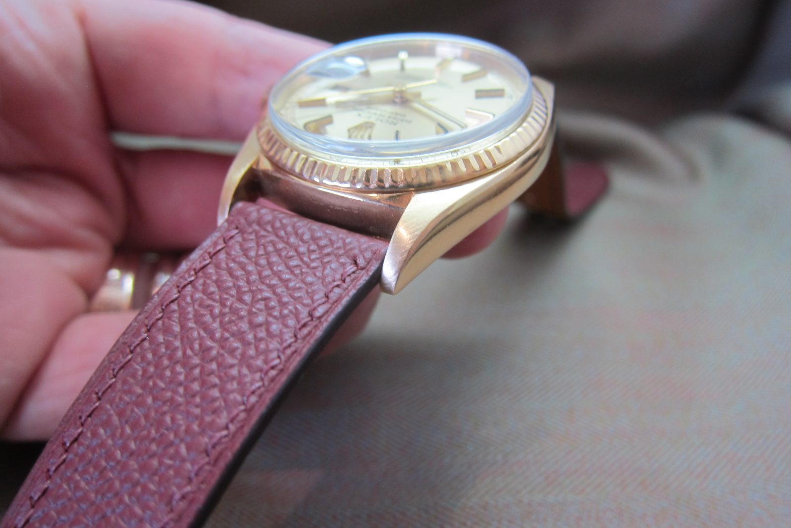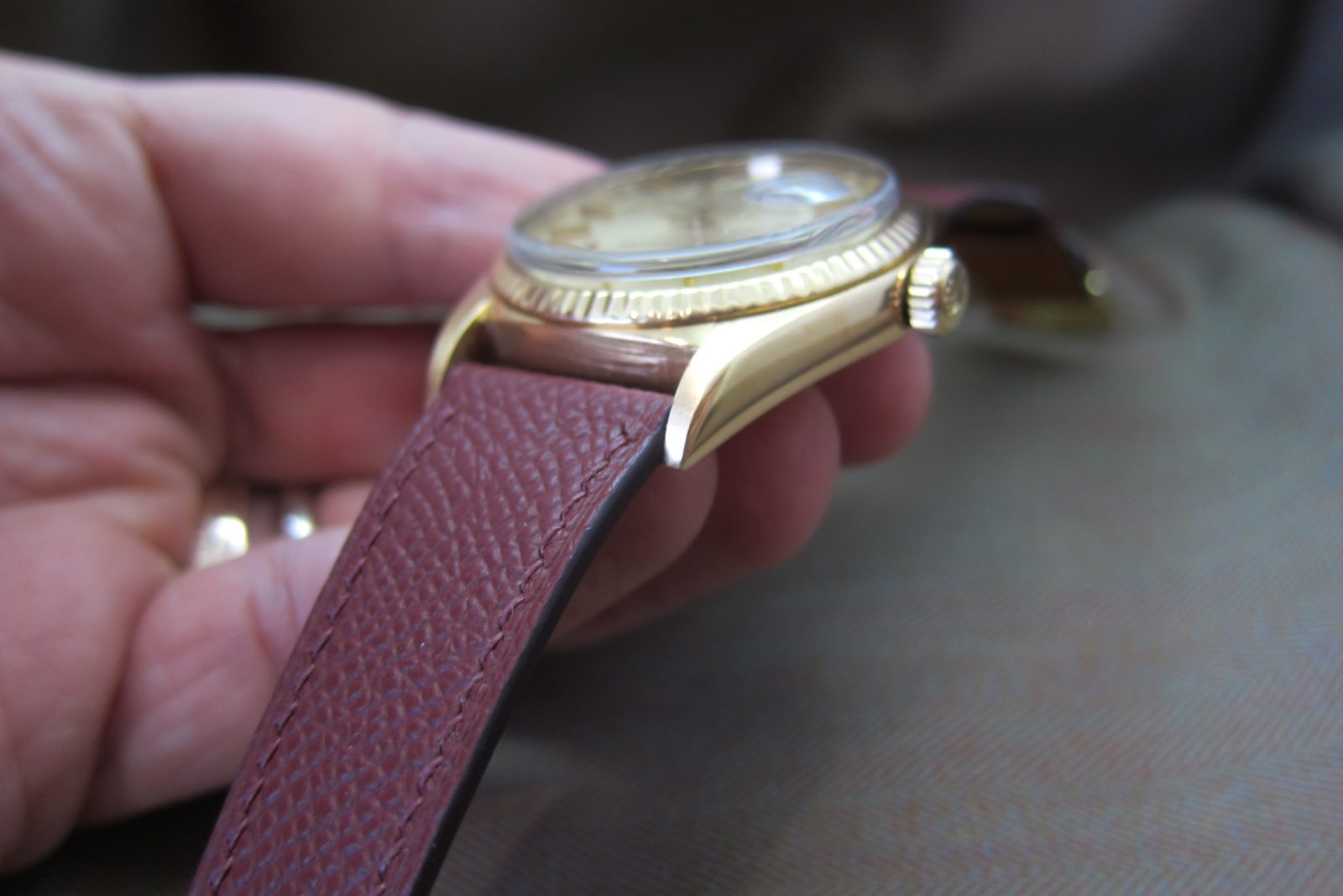 On a generic burgundy calf leather secured by a generic gold-tone buckle.