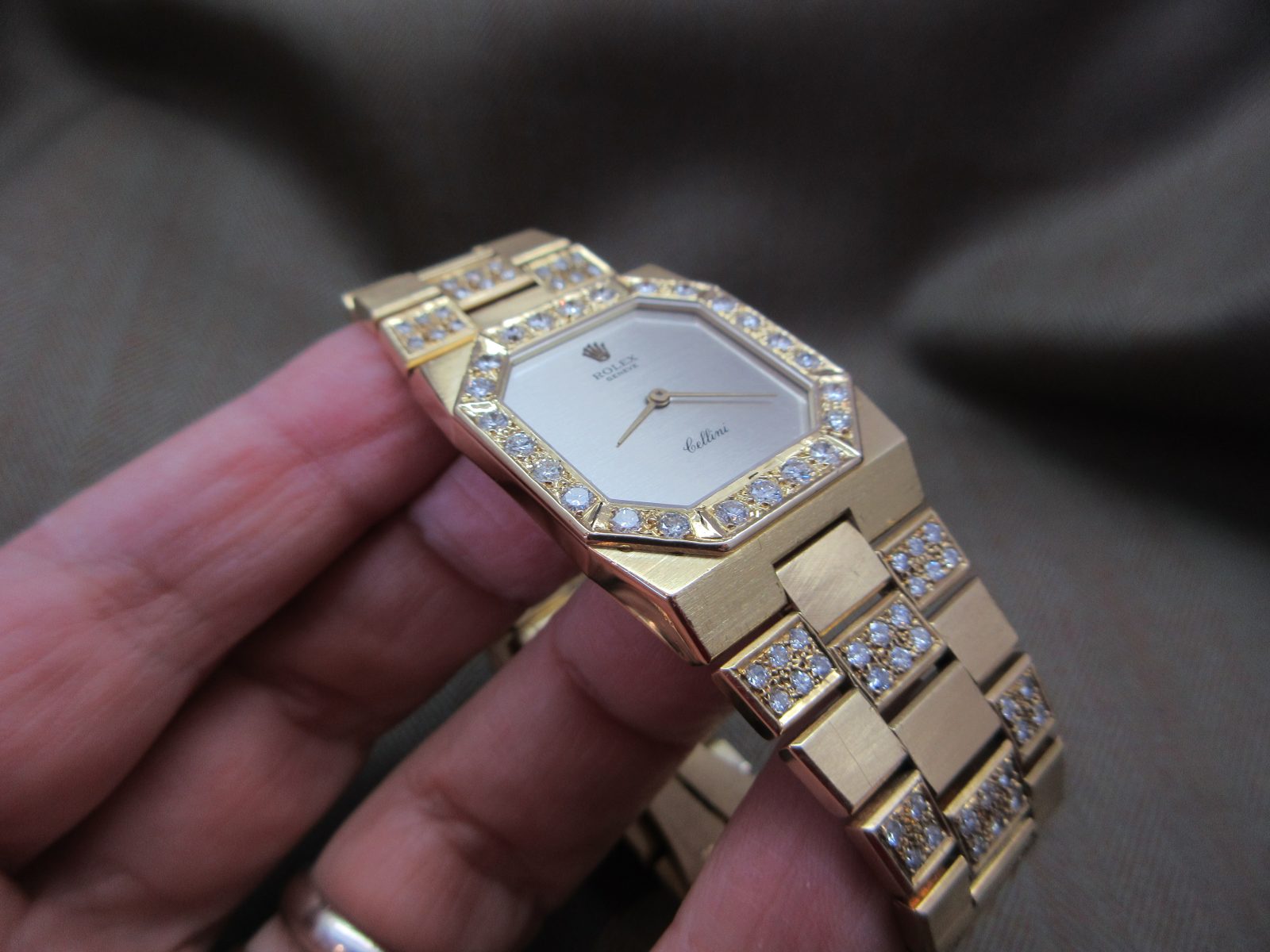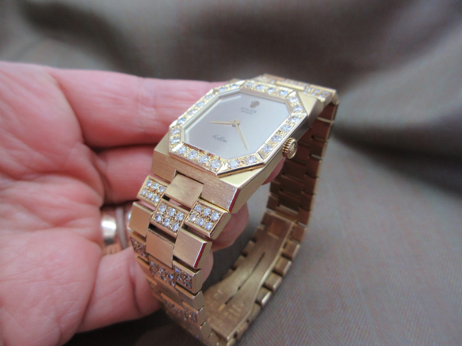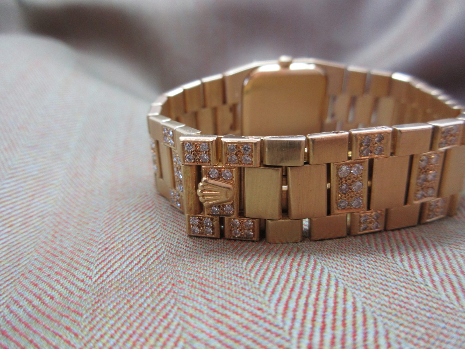 On its original 18k bracelet with aftermarket diamond setting and the original Rolex clasp, fitting a size 7.