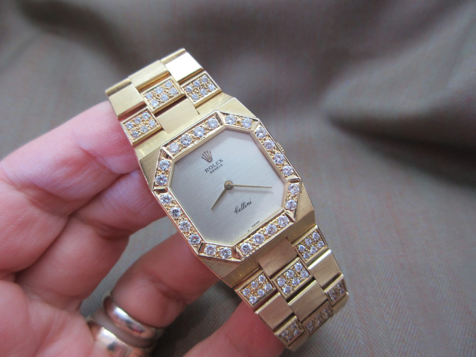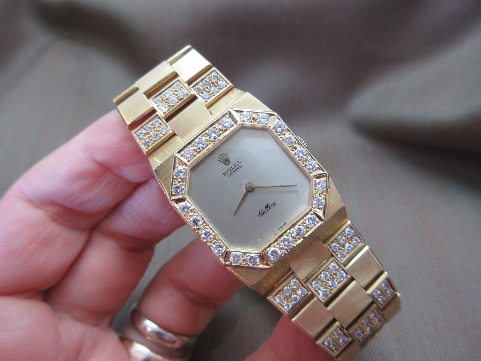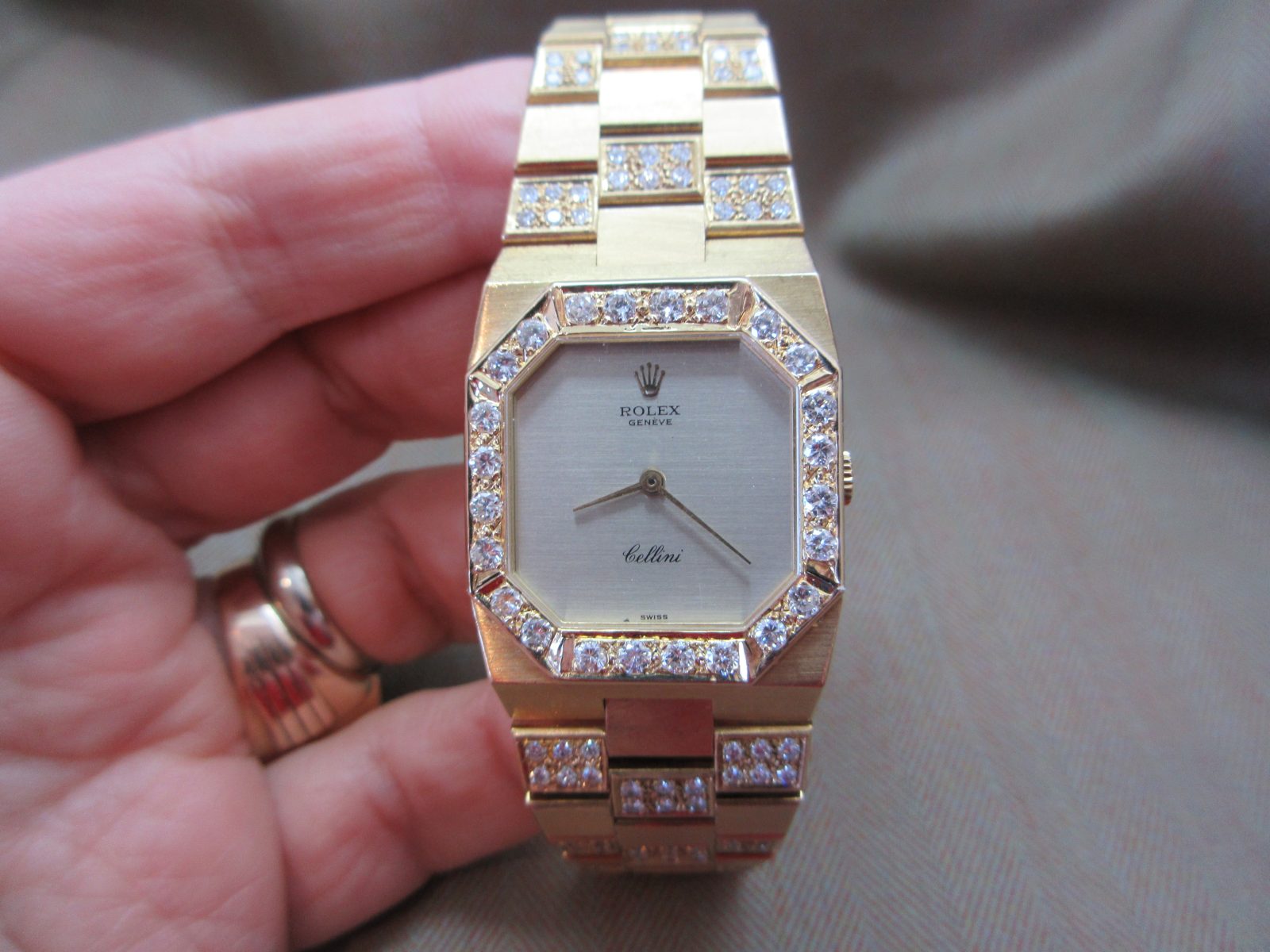 On its original 18k bracelet with aftermarket diamond setting and the original Rolex clasp, fitting a size 7.