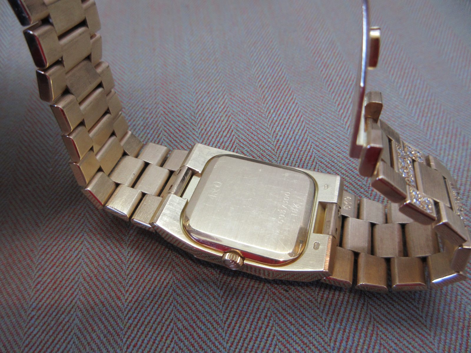 The 18k case measures 26 × 28 mm and is in great condition, featuring an engraved reference number, serial number, and hallmark and finished with an aftermarket diamond-set bezel.