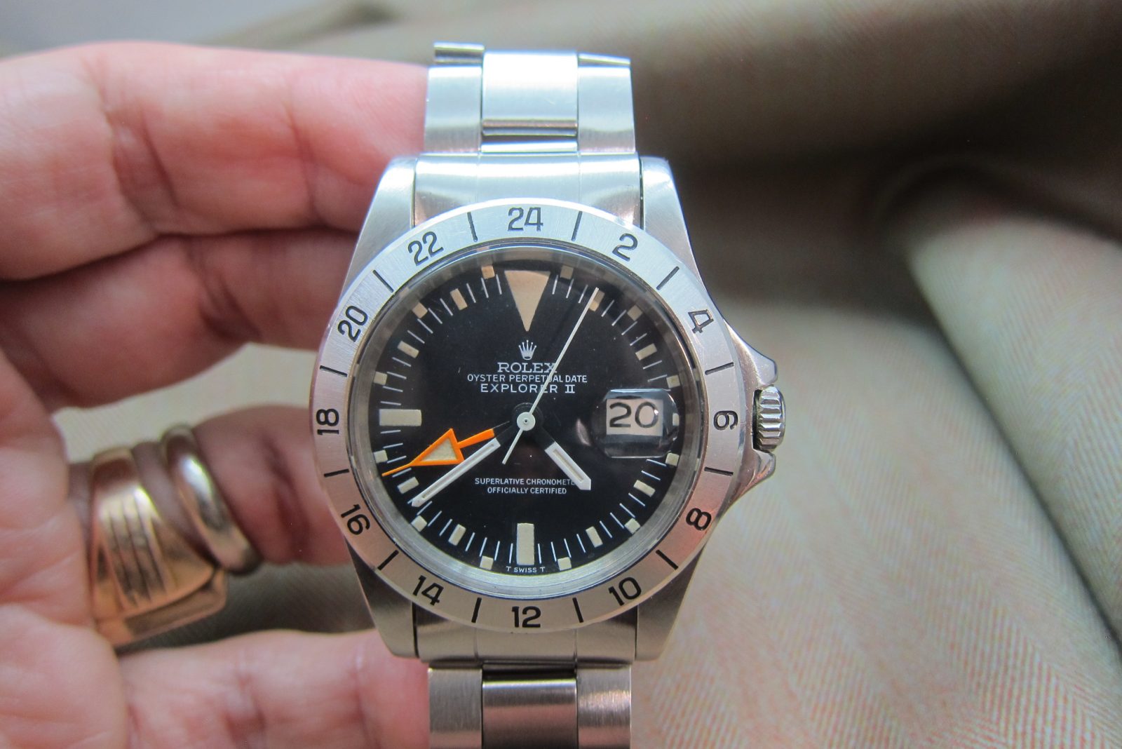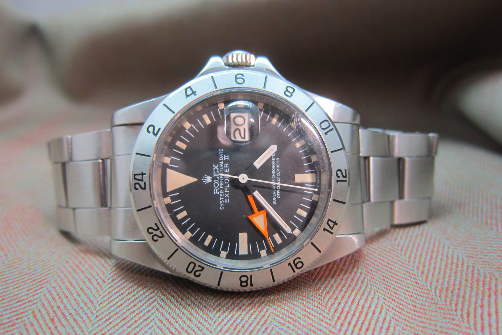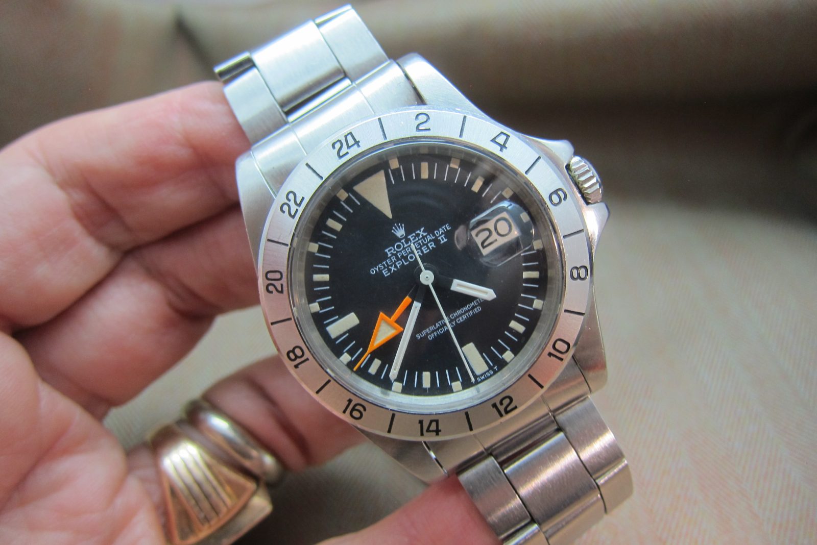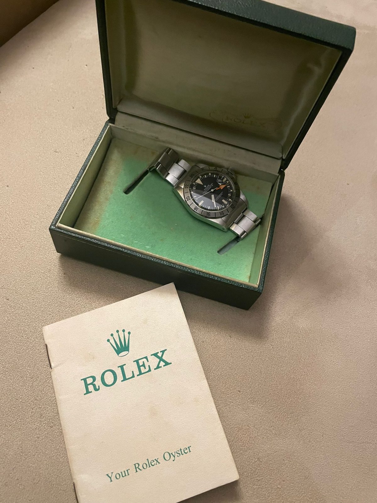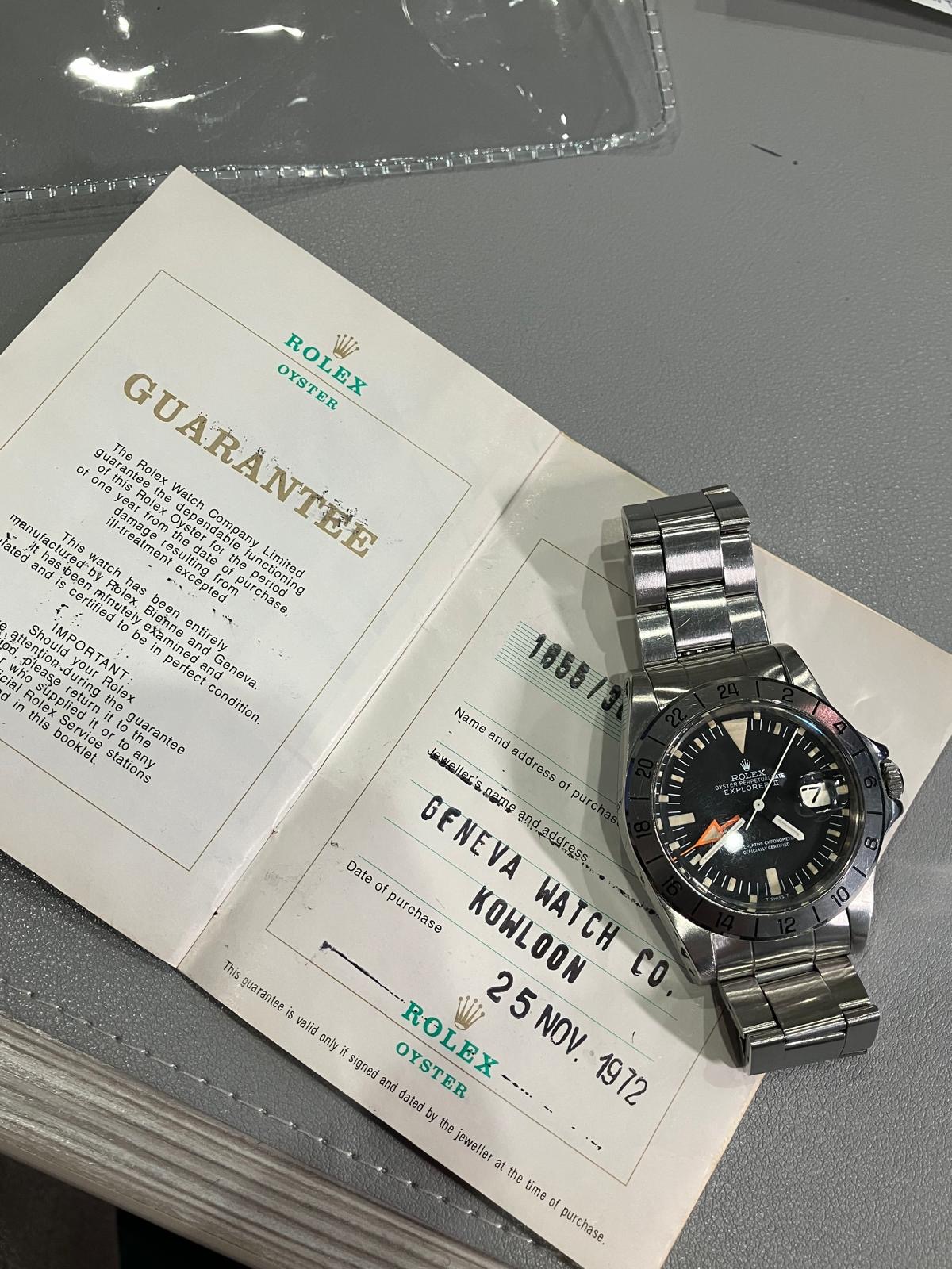 Rolex Explorer II Ref. 1655, early 3M serial. Features the Mark I dial, signature stubby orange 24‑hour hand, and full vintage character, and comes with box and papers. A solid and honest example from 1972.
