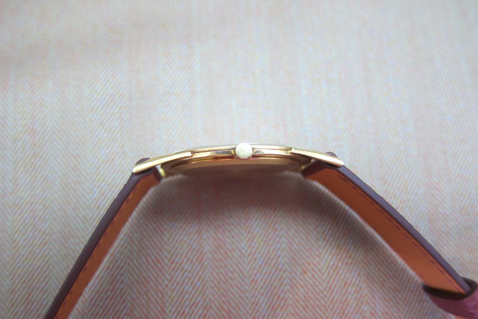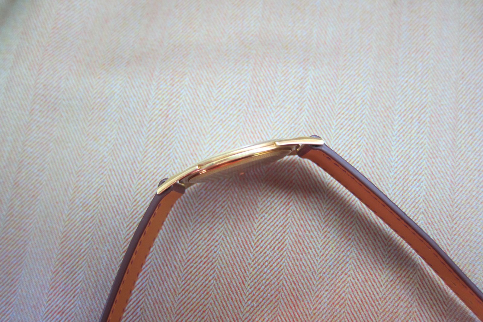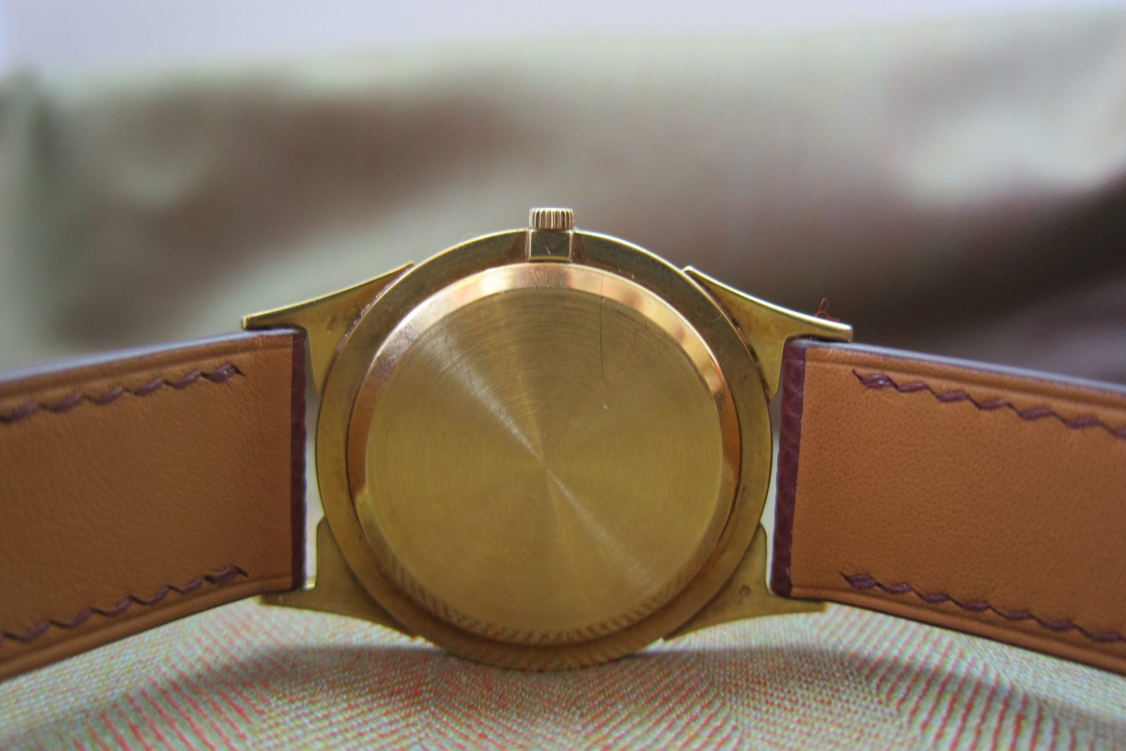 The 18K case measures 32 x 39mm and is in great condition, featuring a charming oxidation on its bezel and crisp hallmarks on the back of the case.
