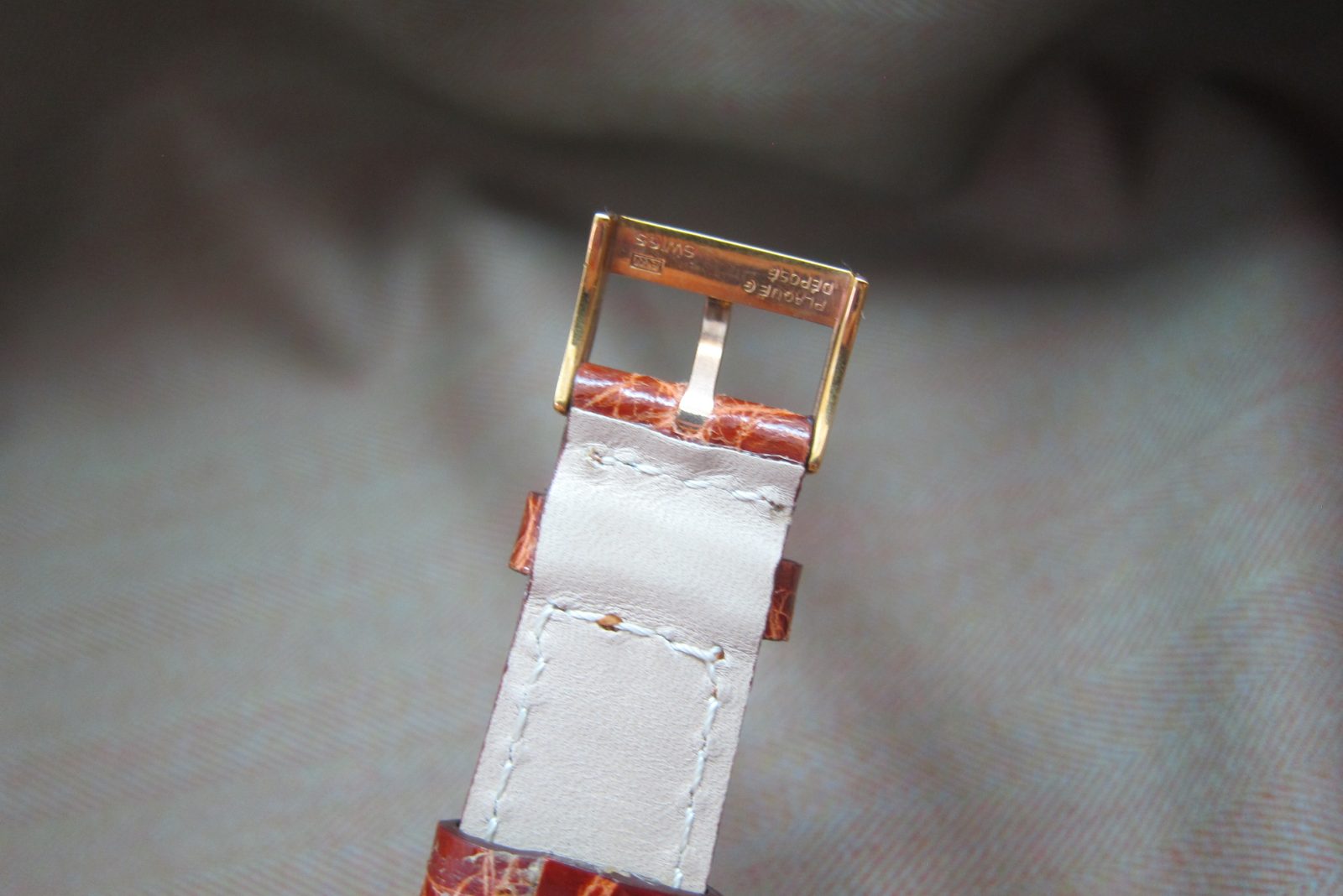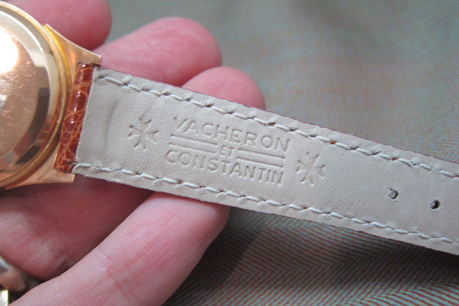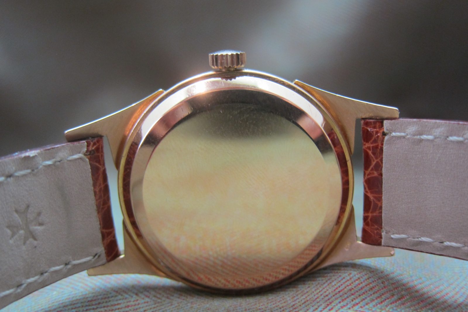 The 18k rose gold case measures 33 x 43 mm and is in excellent condition, complete with a hallmark on the caseback.