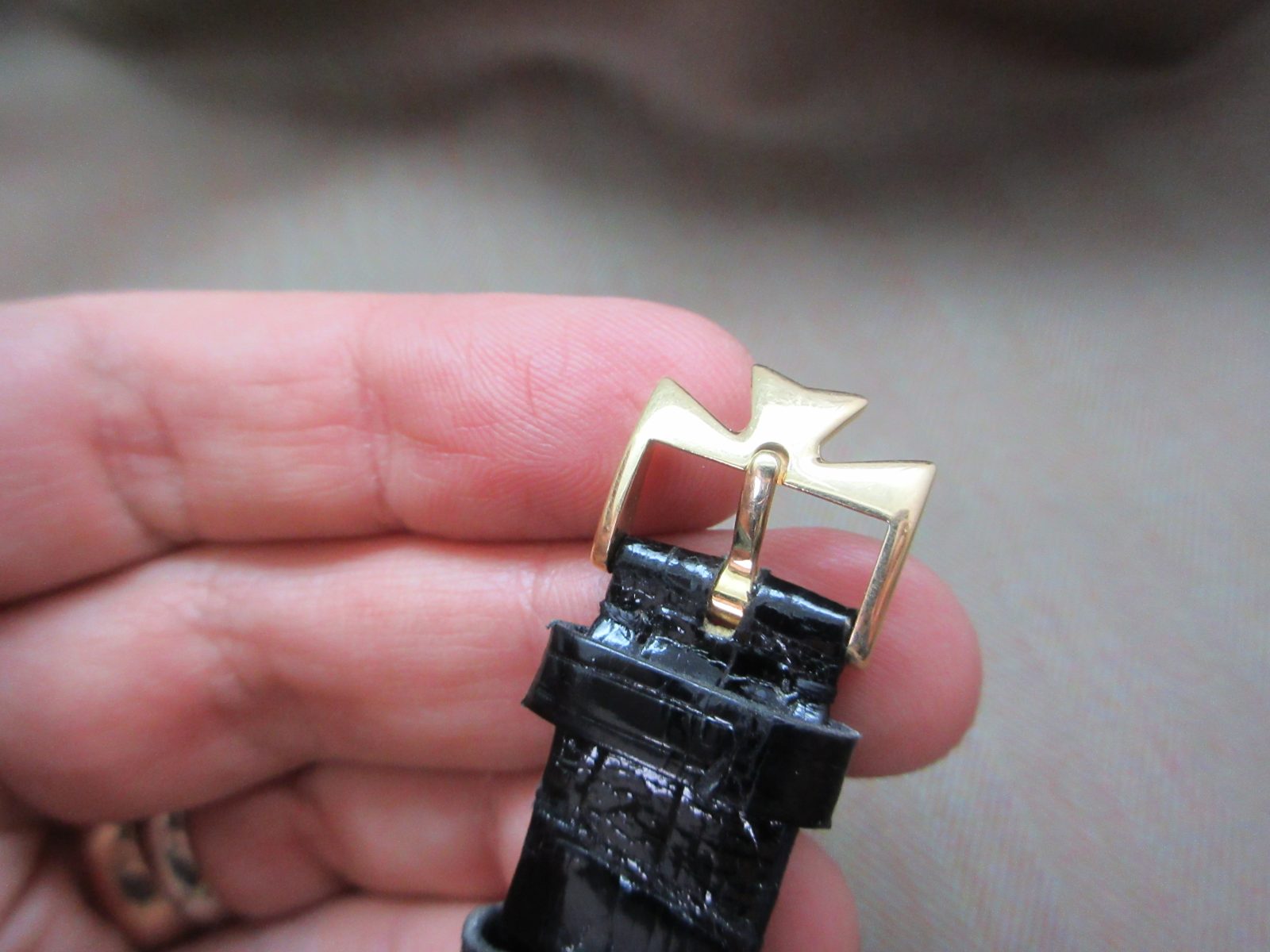 On a generic alligator skin strap secured by the original 18k Vacheron Constantin Maltese cross buckle.