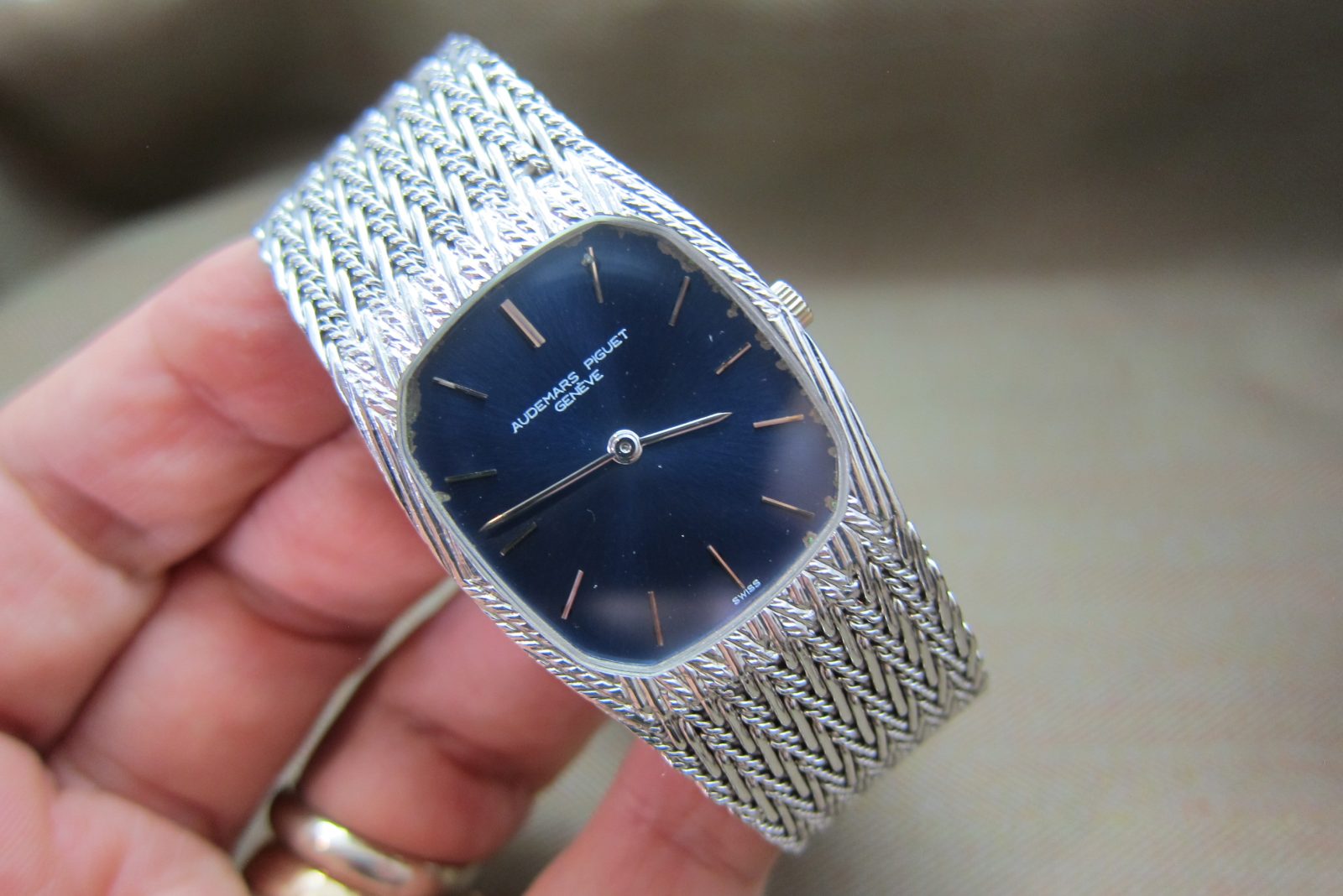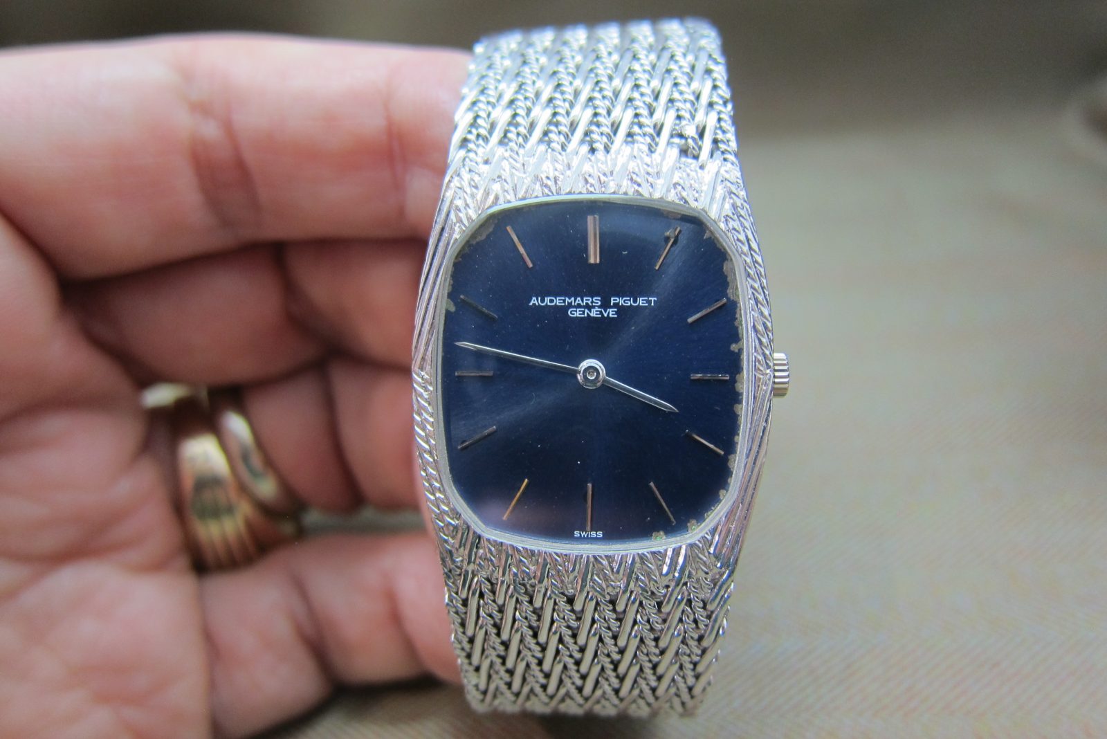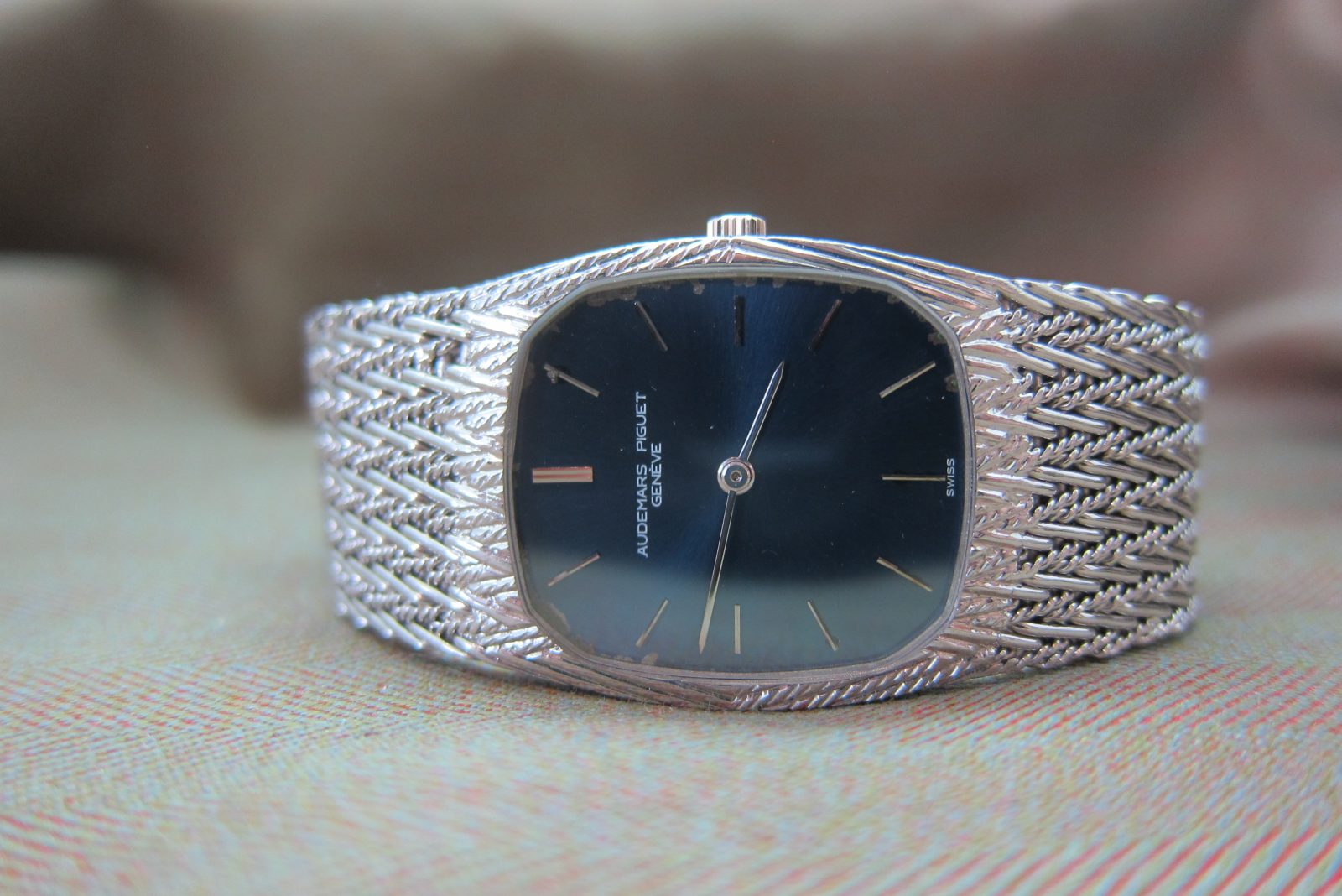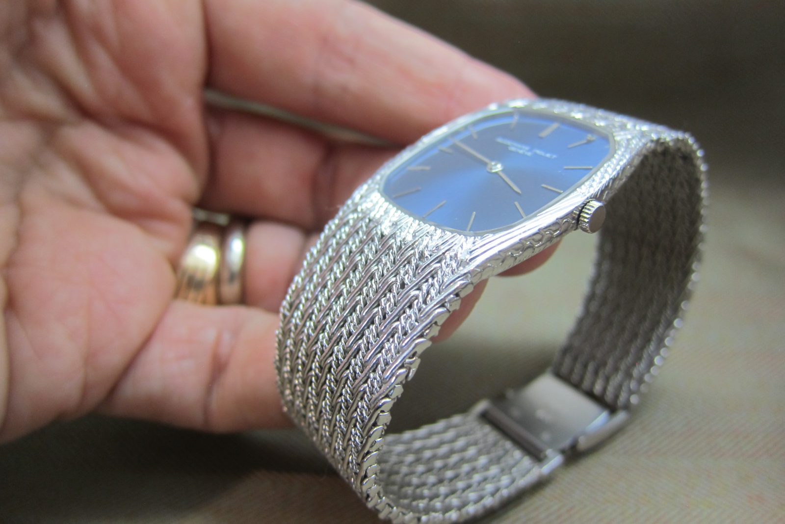 On its original woven 18k white gold bracelet, secured by the original 18k buckle, with a total length of 7.5 inches.