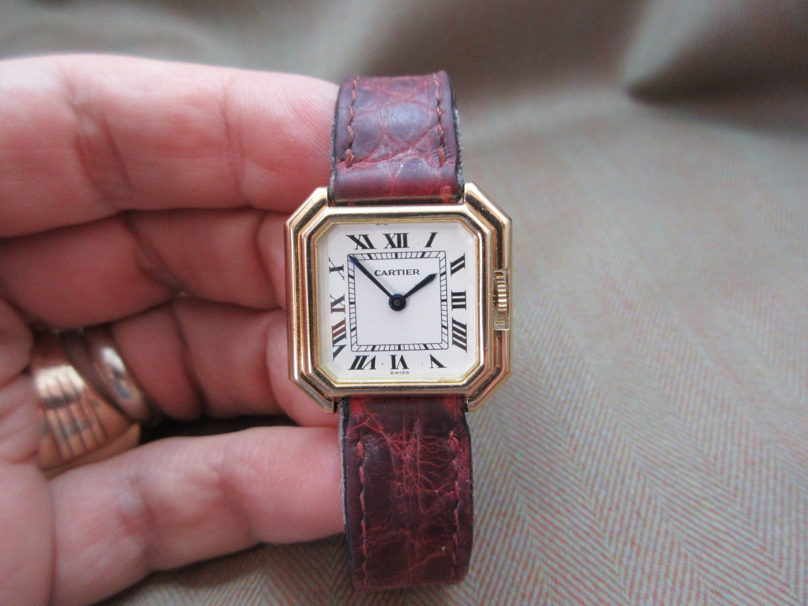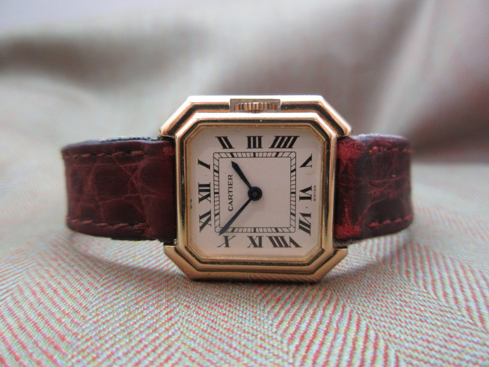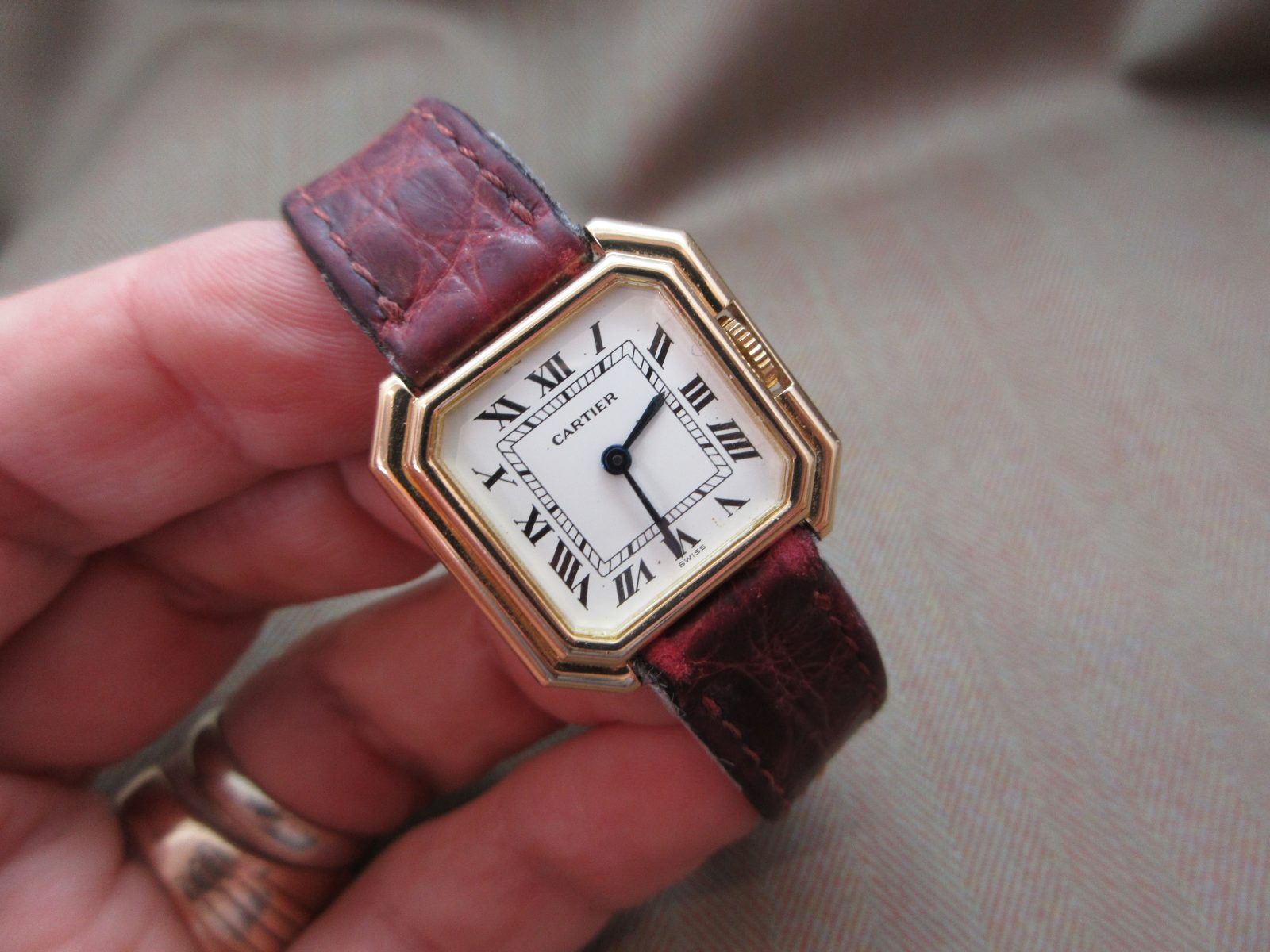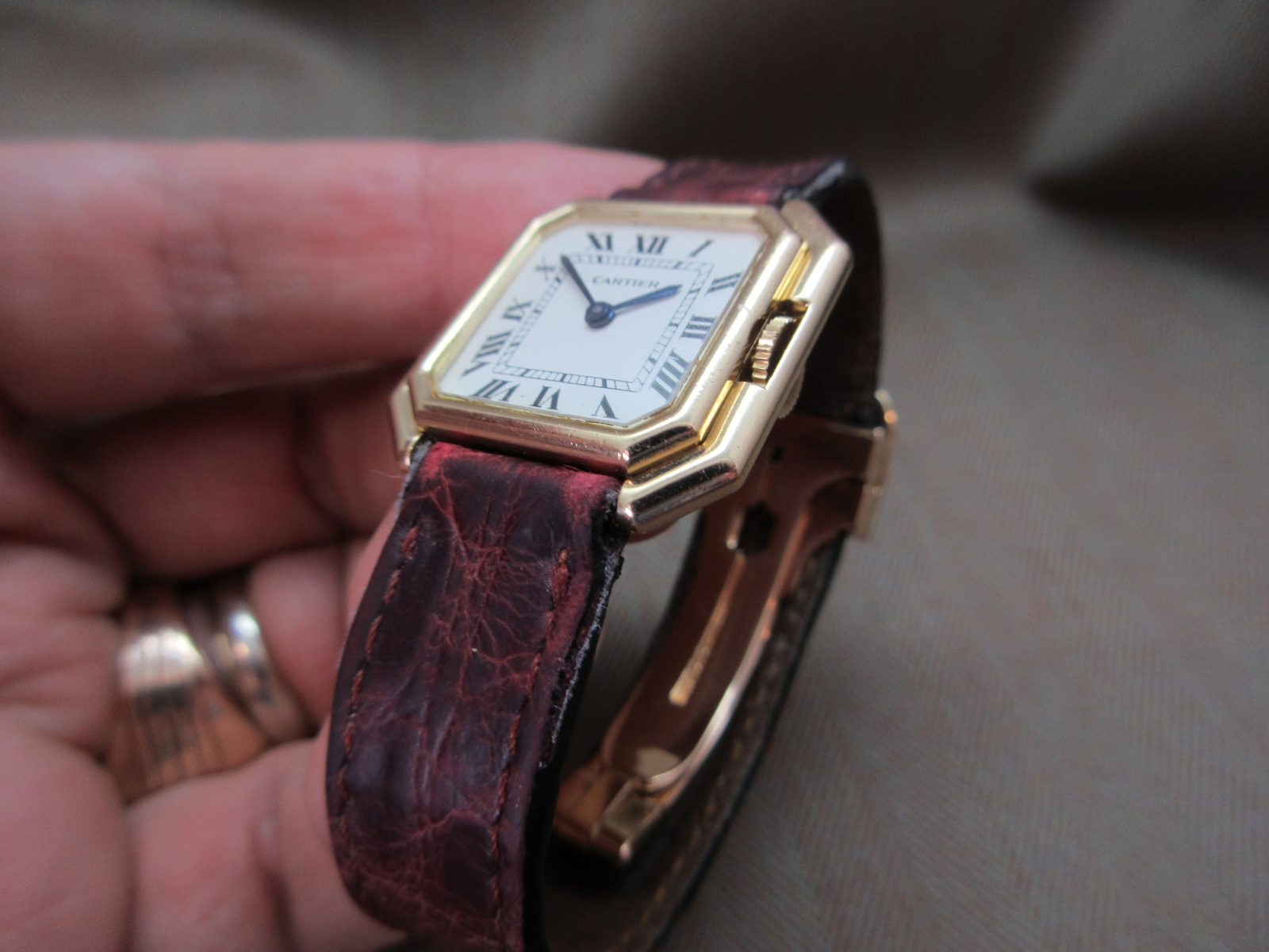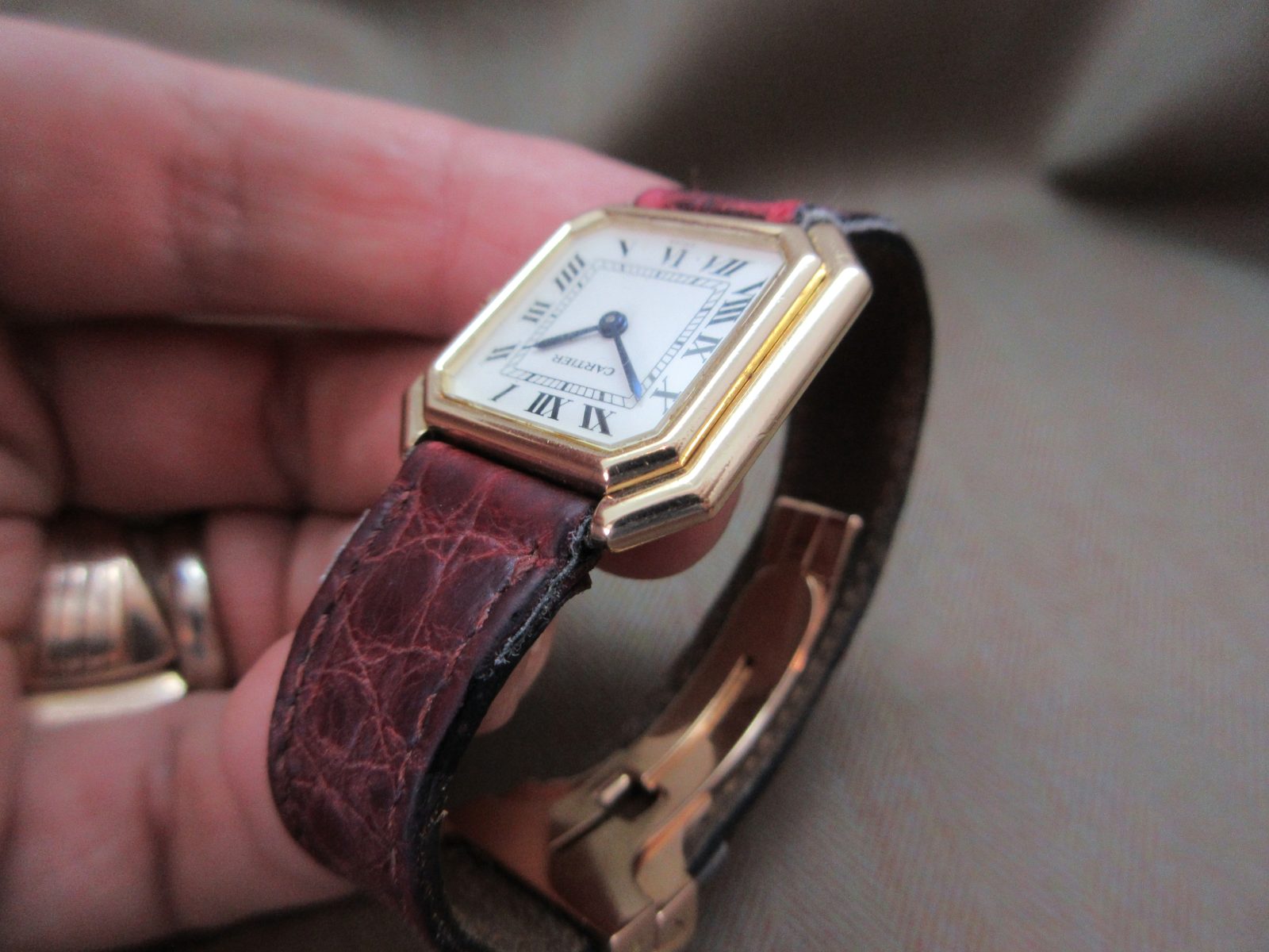 On a generic crocodile skin strap, secured by the original 18k deployant buckle, fitting a size 5.5.