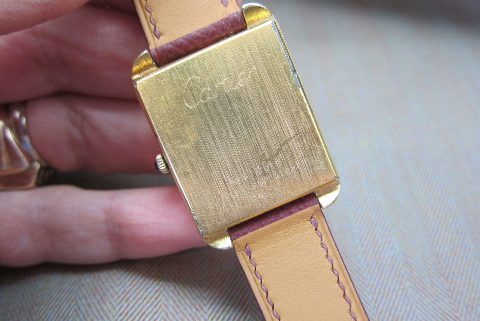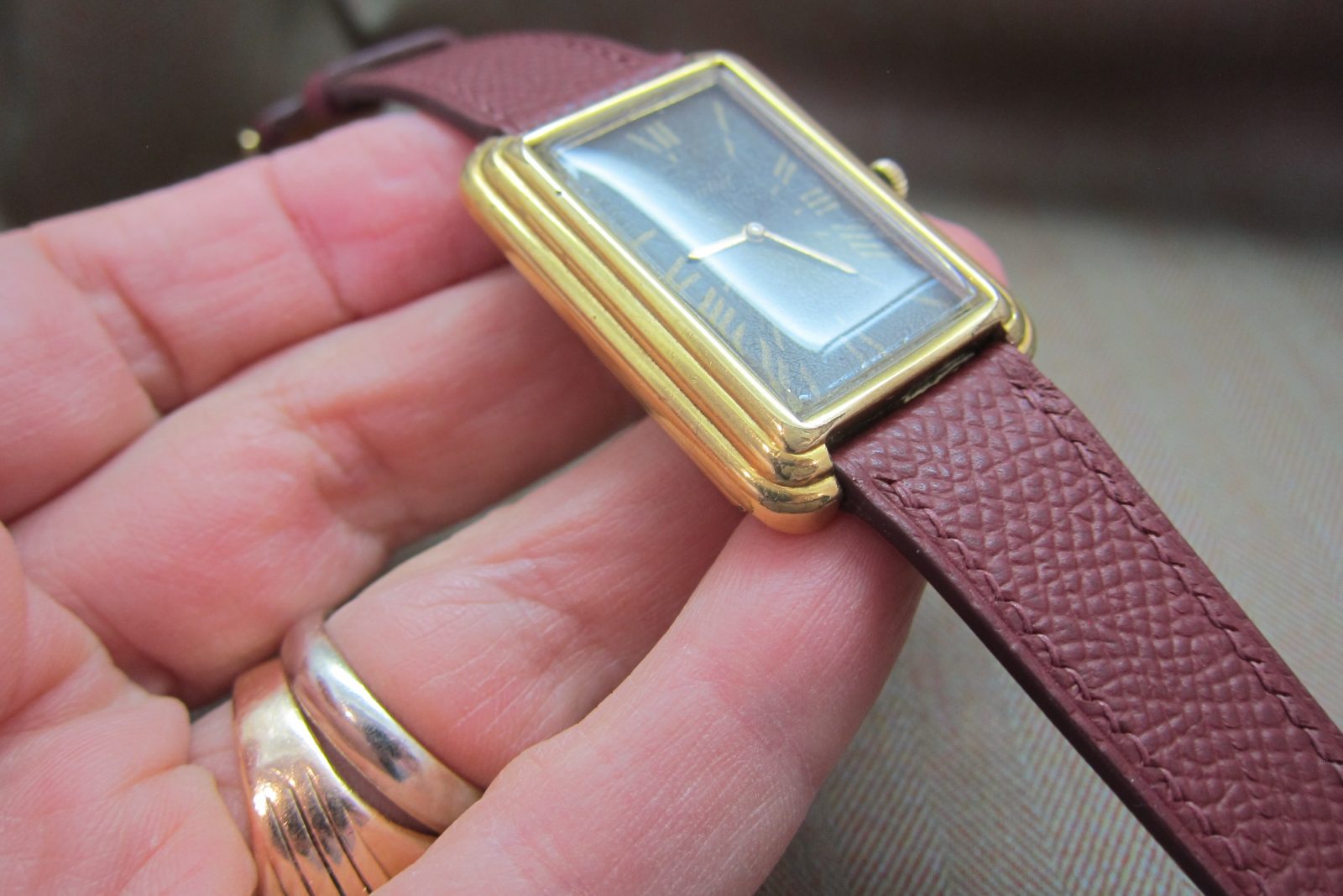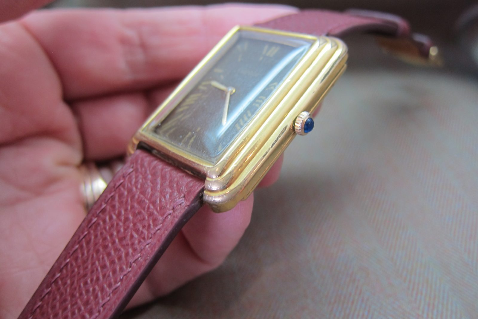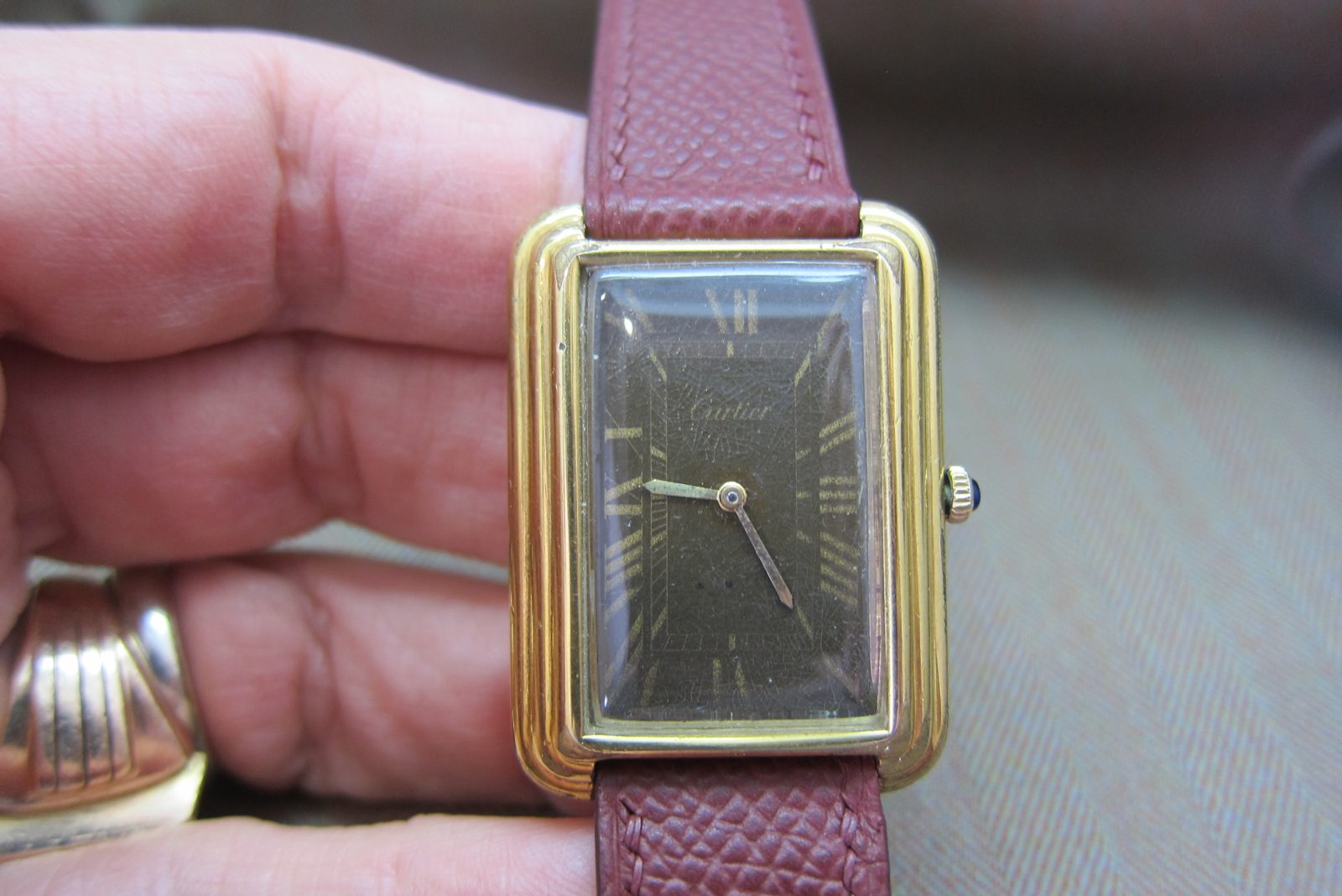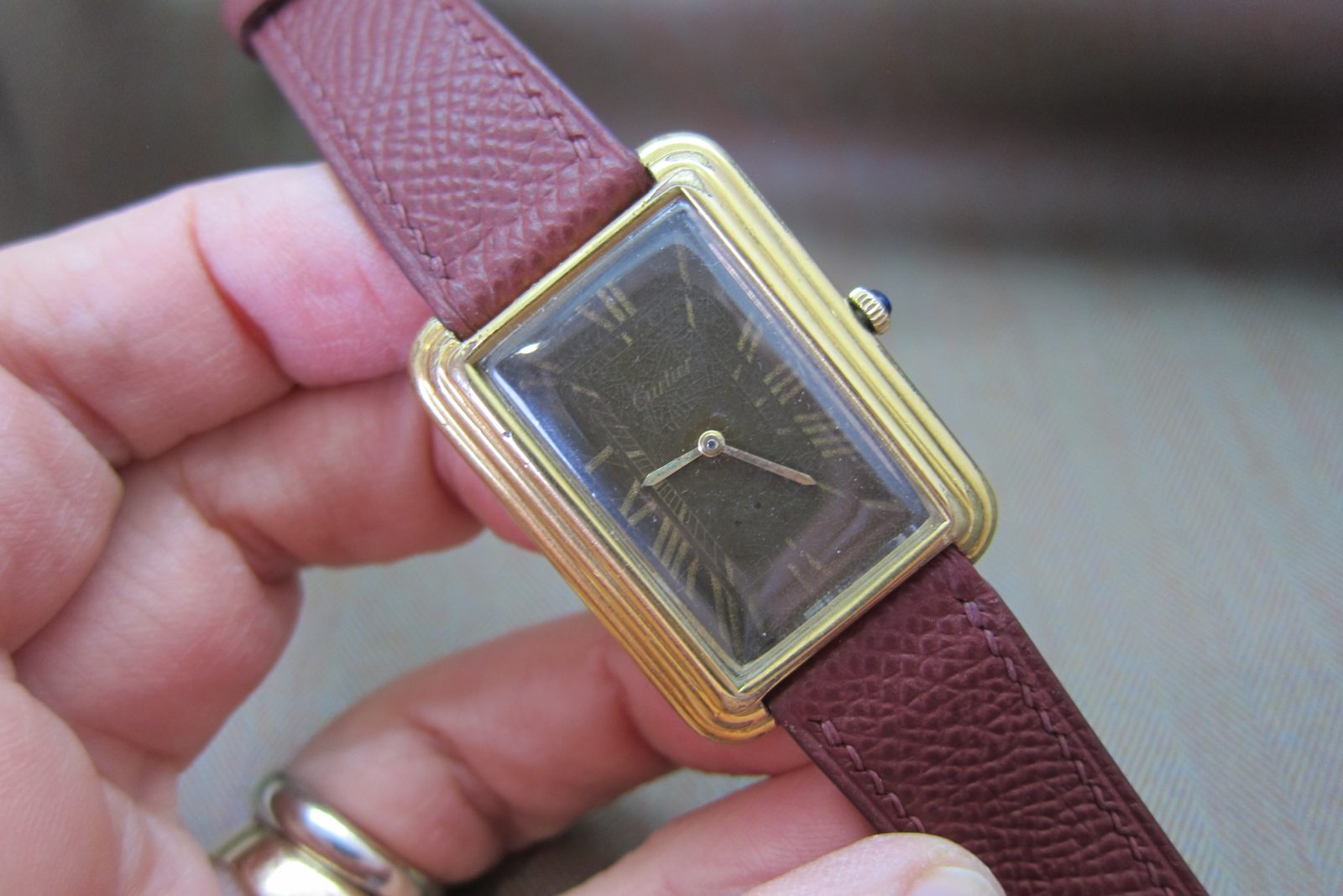 A really fun plated Cartier with a very special tropical dial and stepped bezel!