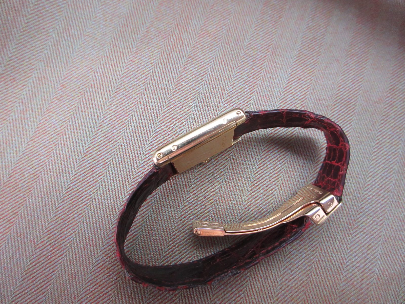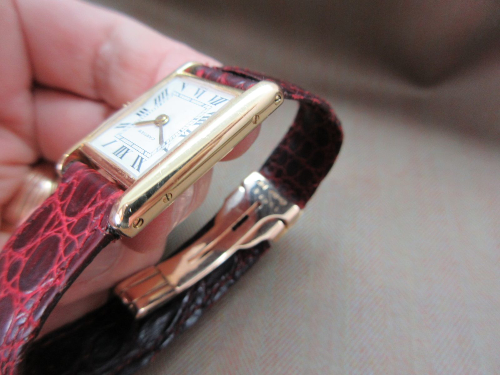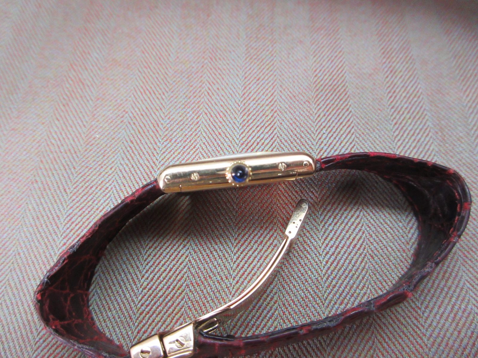 On a generic strap secured by the original 18k Cartier deployant clasp. Fits a size 6.5.