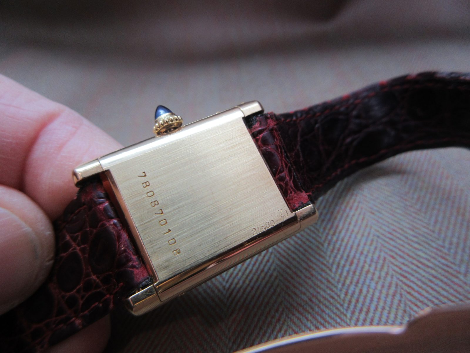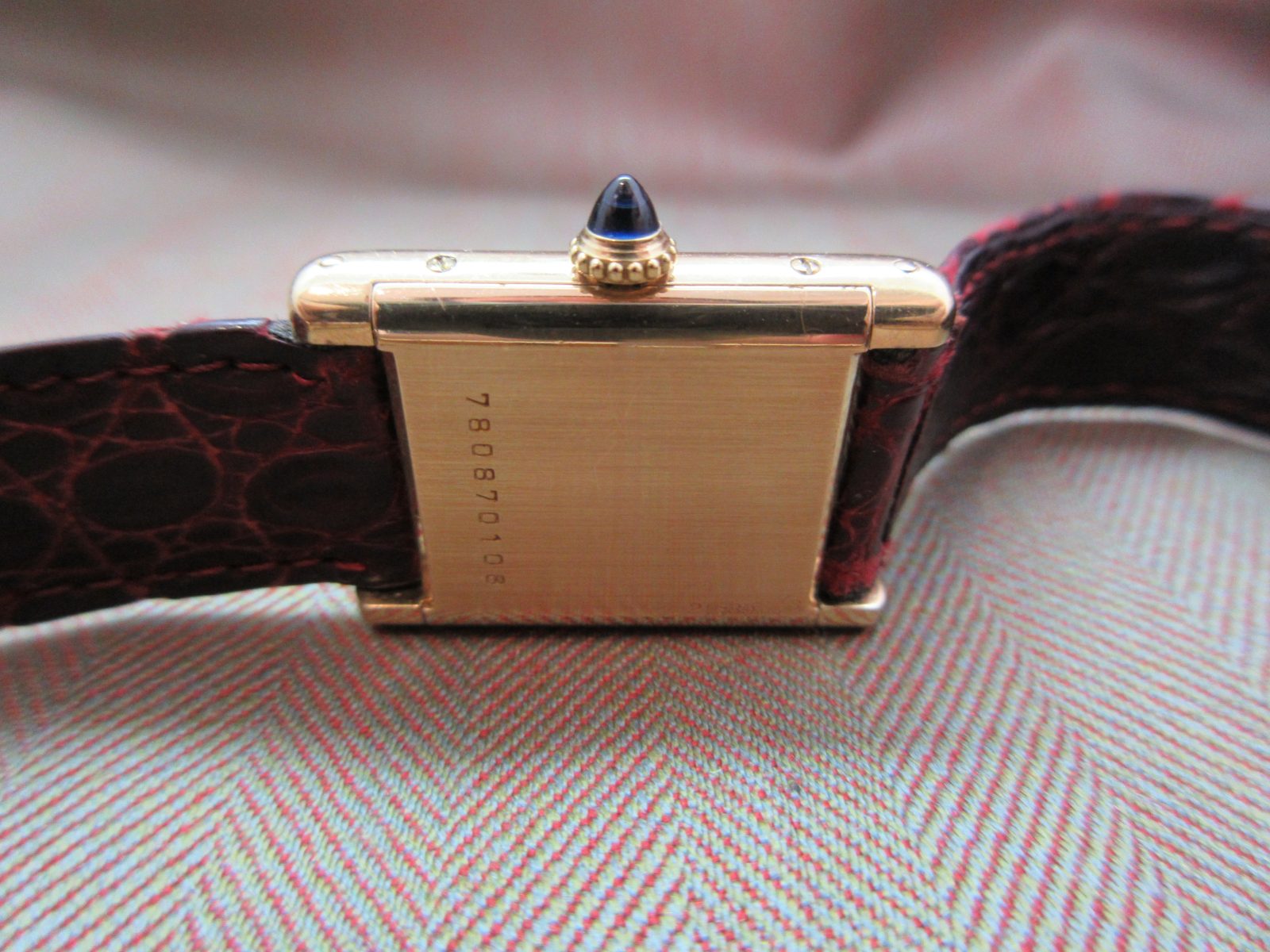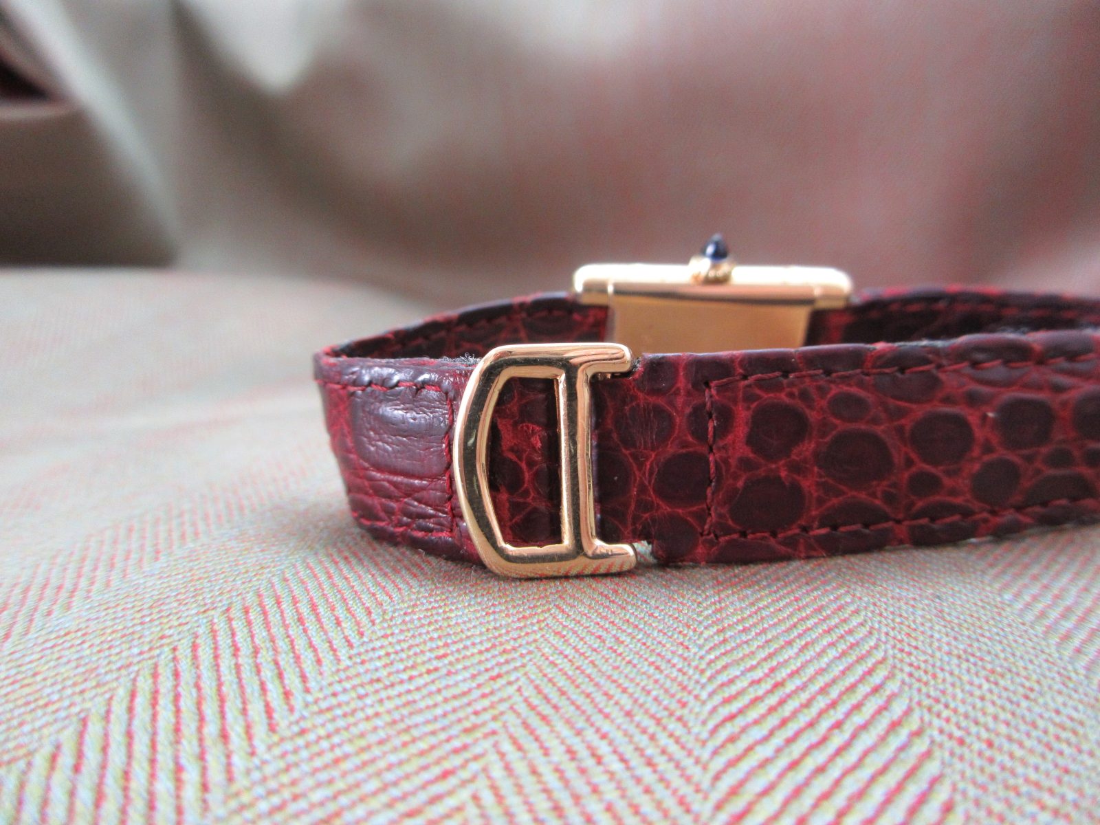 On a generic strap secured by the original 18k Cartier deployant clasp. Fits a size 6.5.