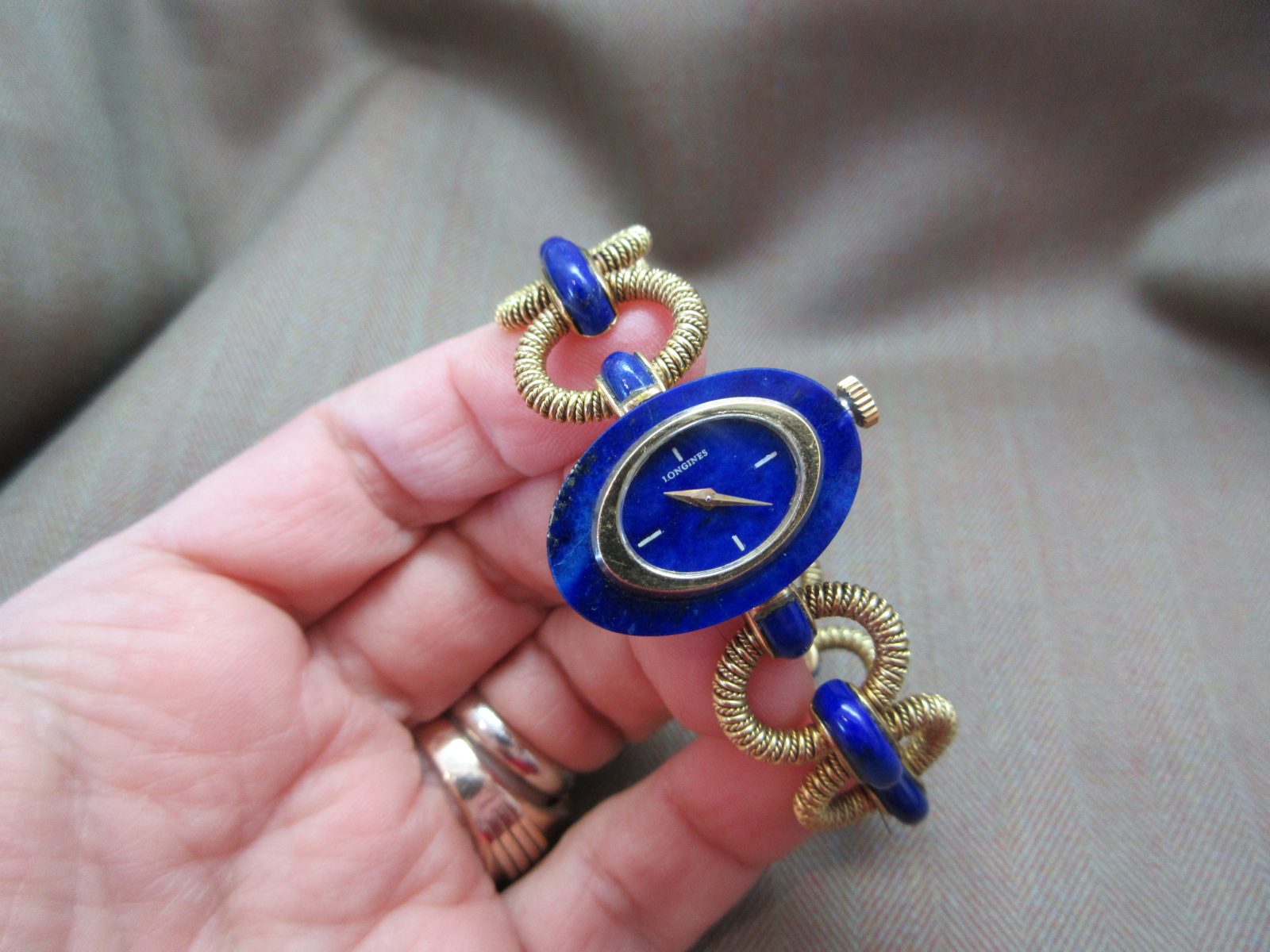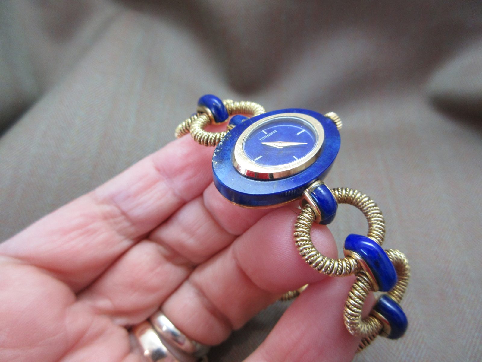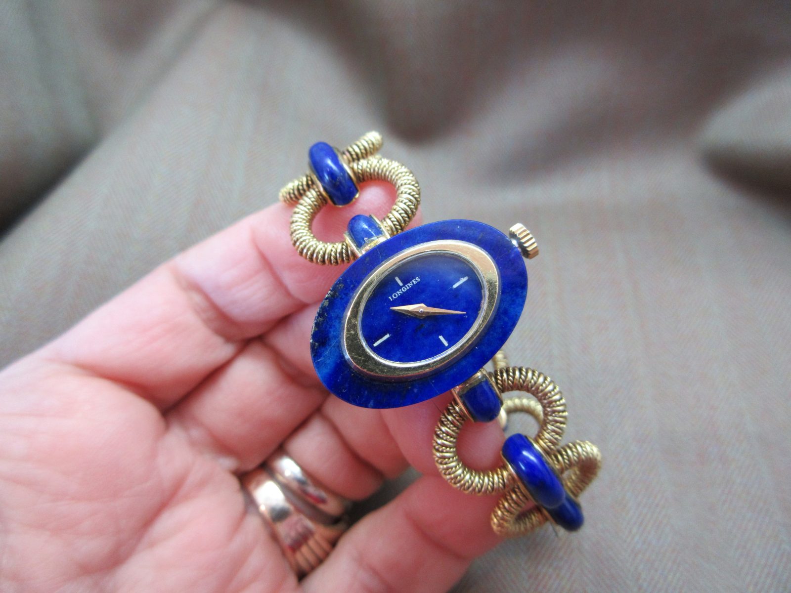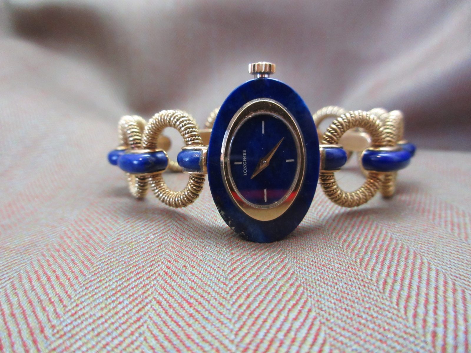 An eye-catching Longines bracelet watch featuring a rich lapis dial with matching inlay throughout the bracelet, finished with an intricate, almost sculptural design—an insane piece of art.