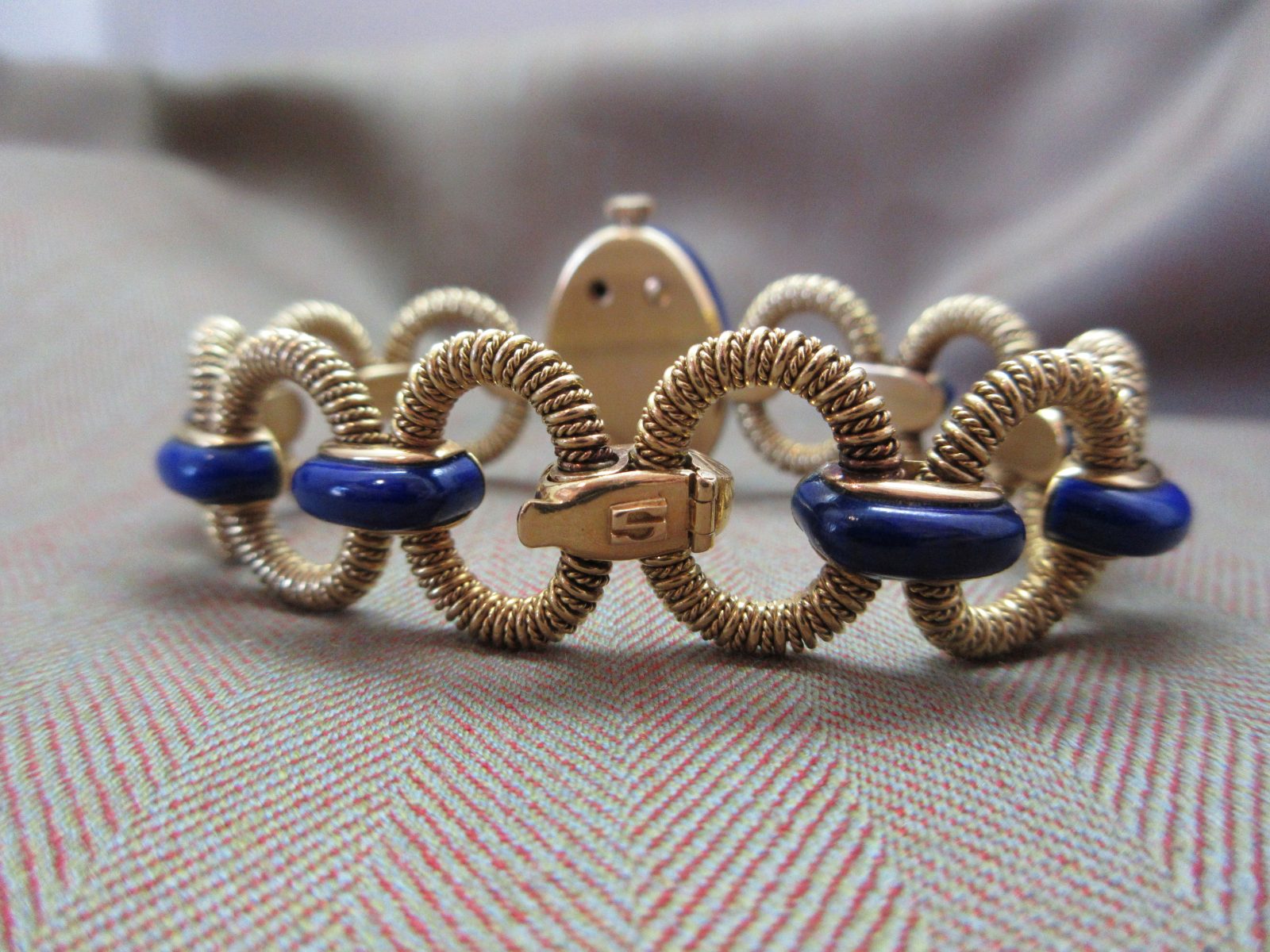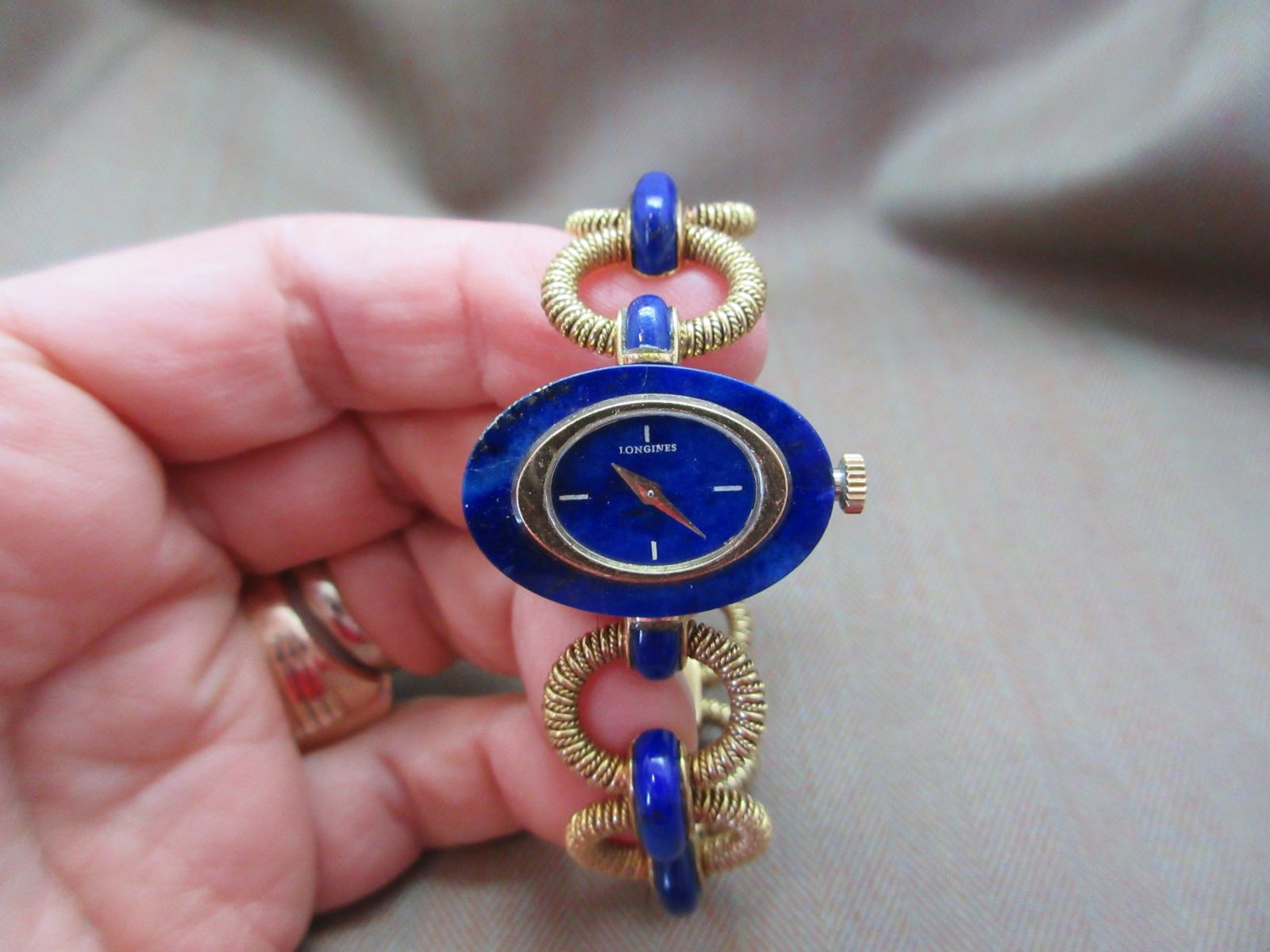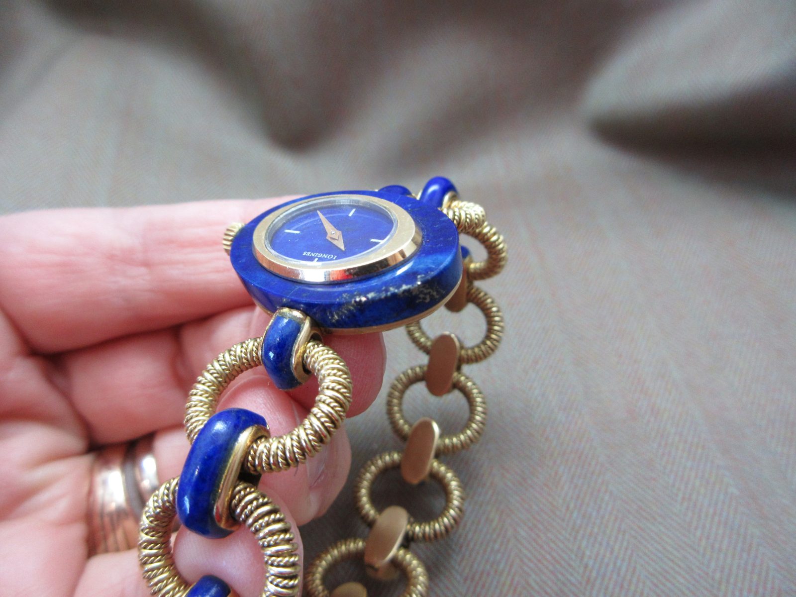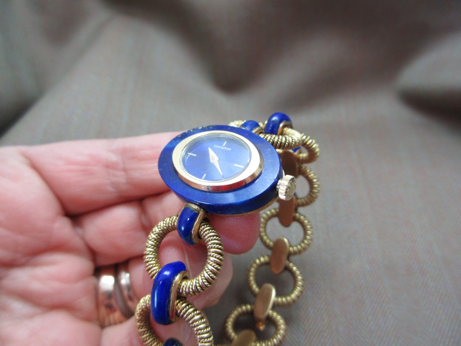 An eye-catching Longines bracelet watch featuring a rich lapis dial with matching inlay throughout the bracelet, finished with an intricate, almost sculptural design—an insane piece of art.