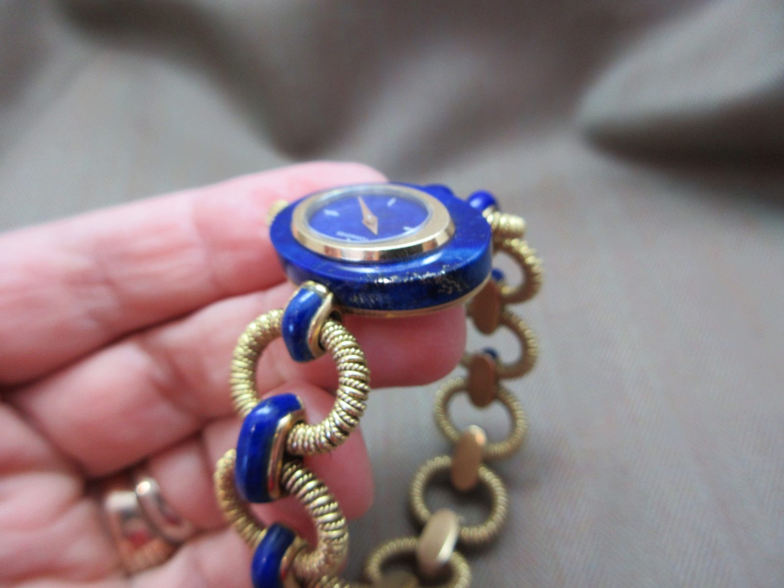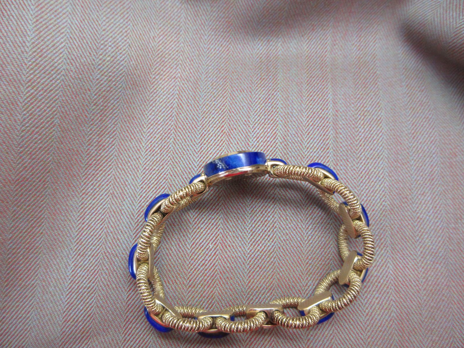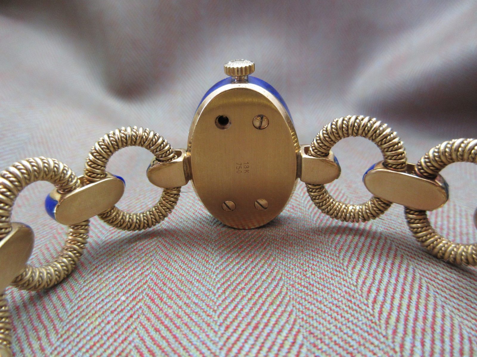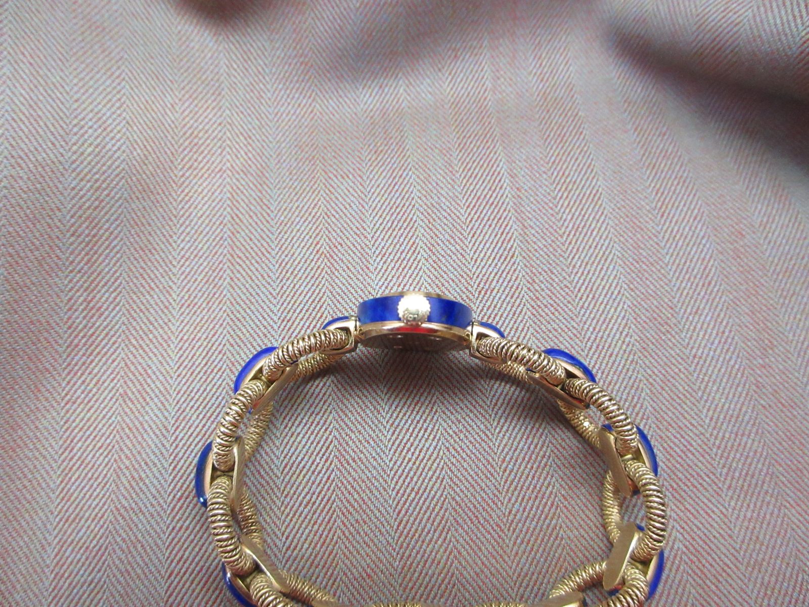 The 18k case measures 27 x 19 mm and is in great condition, featuring a hallmark on the caseback and completed with a stunning lapis bezel.