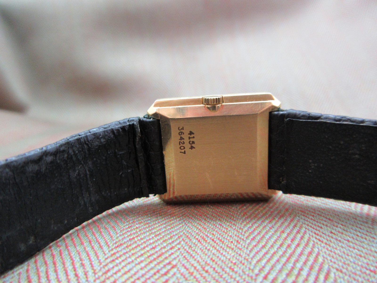 The 18k case measures 20 × 23 mm and is in great condition, with the reference number engraved on the caseback and the ribbed finish continuing throughout the case and bezel.
