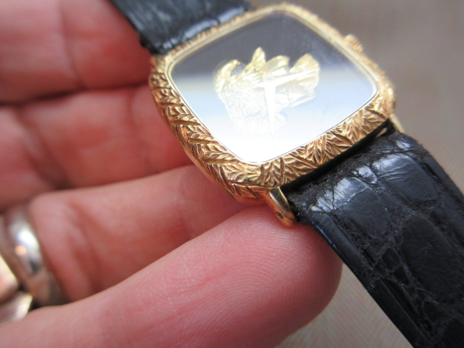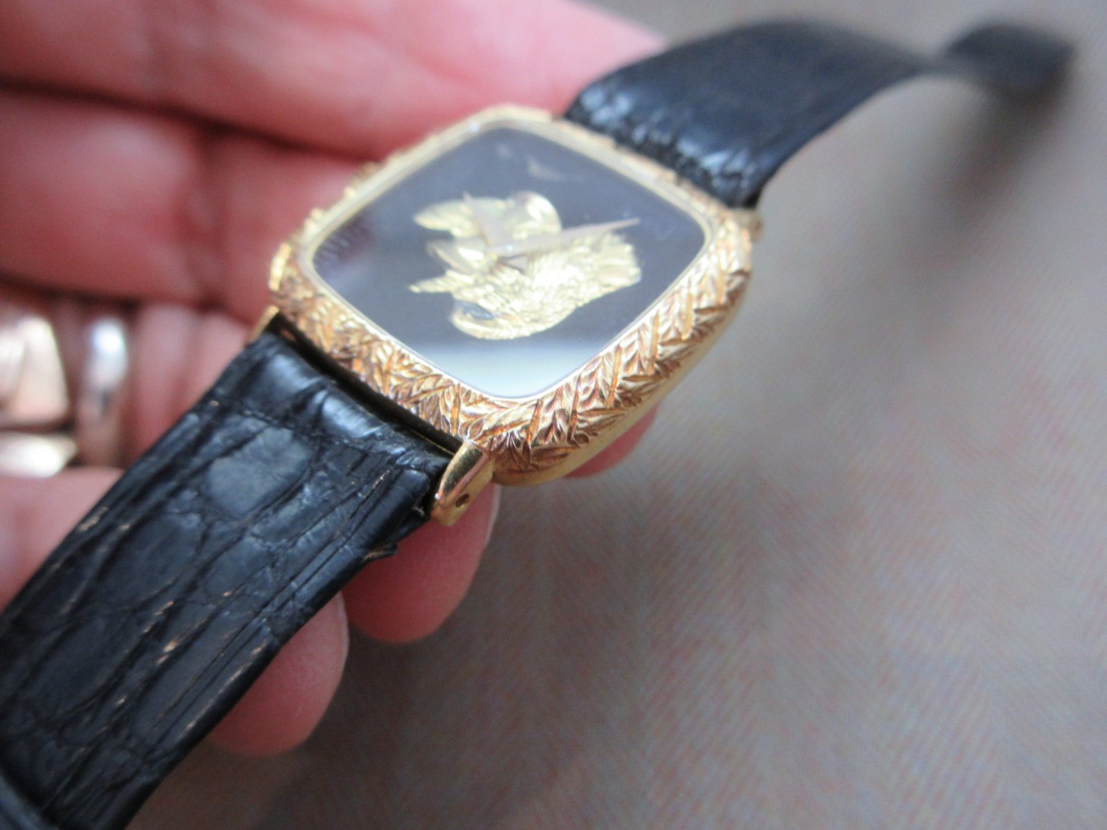 The dial is in great condition, with the Piaget & Hans Erni signature lightly faded and a champagne dove motif on the dial.