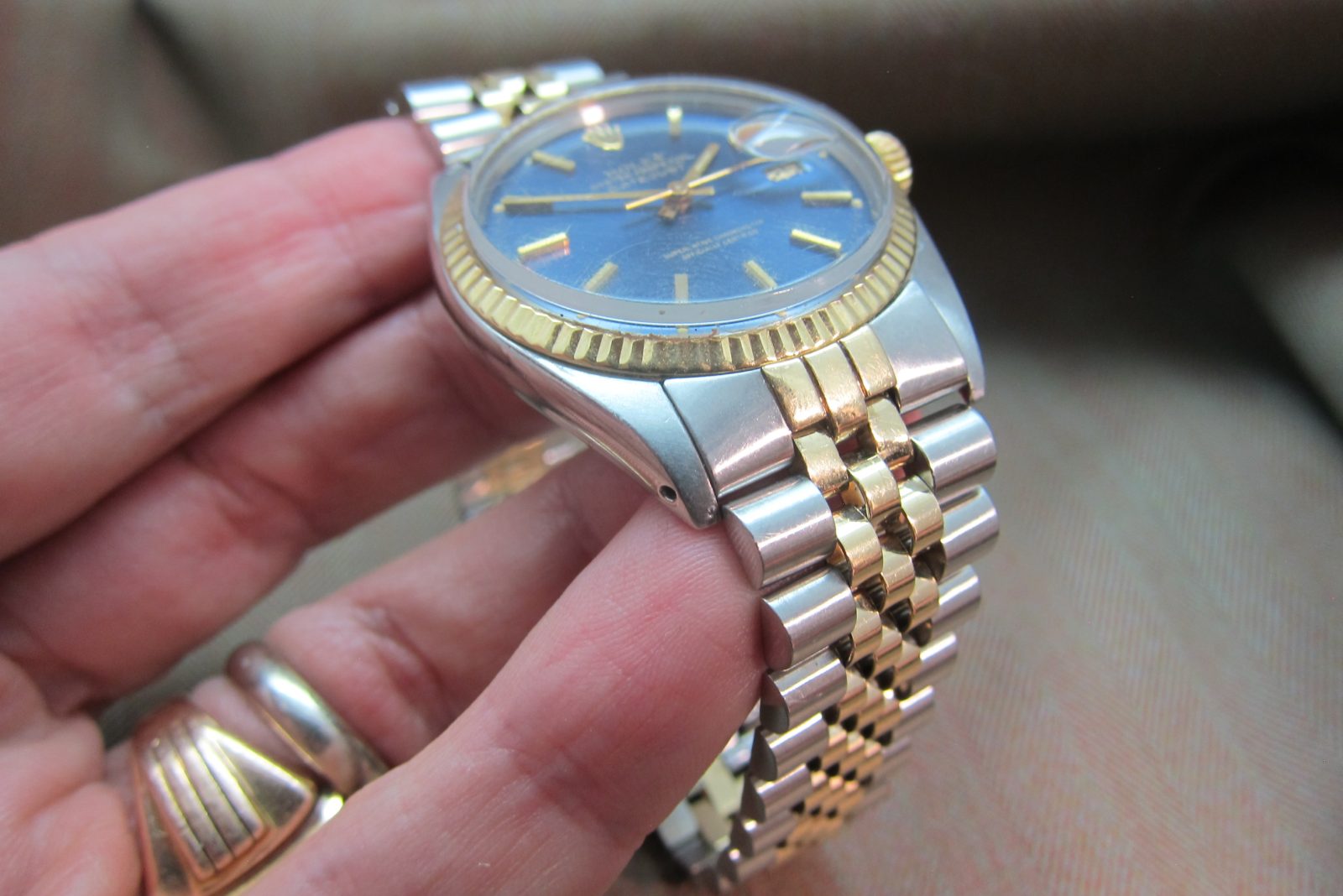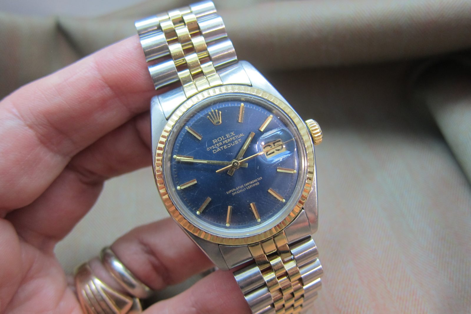 Rolex Datejust 1601 in two-tone with a striking blue dial, dated to around 1976. A classic Datejust elevated by its vibrant dial, combining timeless design with subtle standout character.