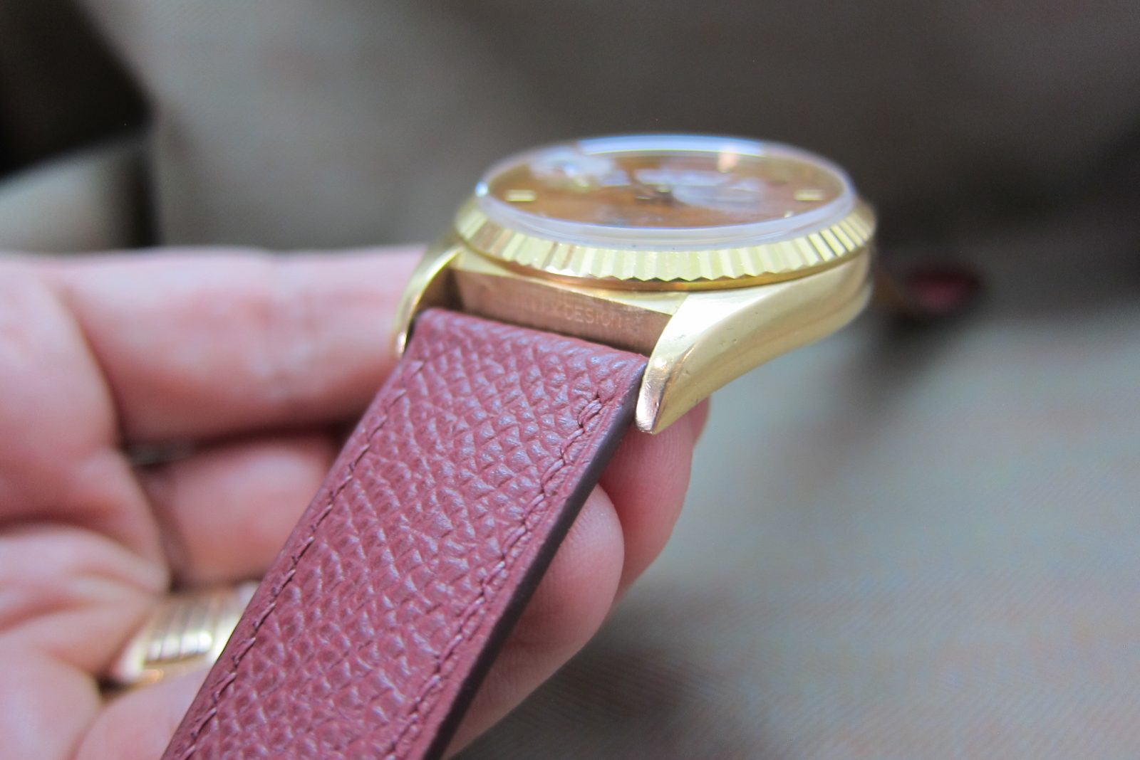 On a generic burgundy lizard skin strap, secured by a gold-tone buckle.