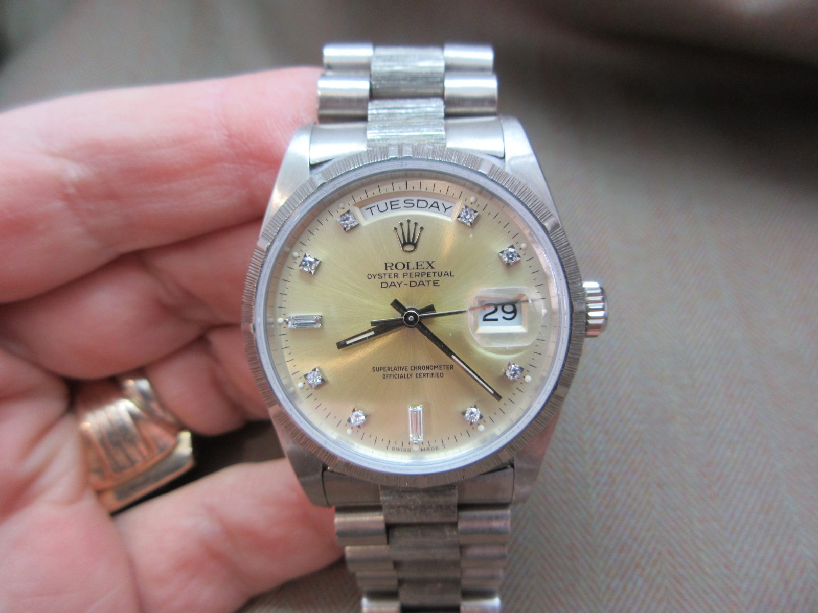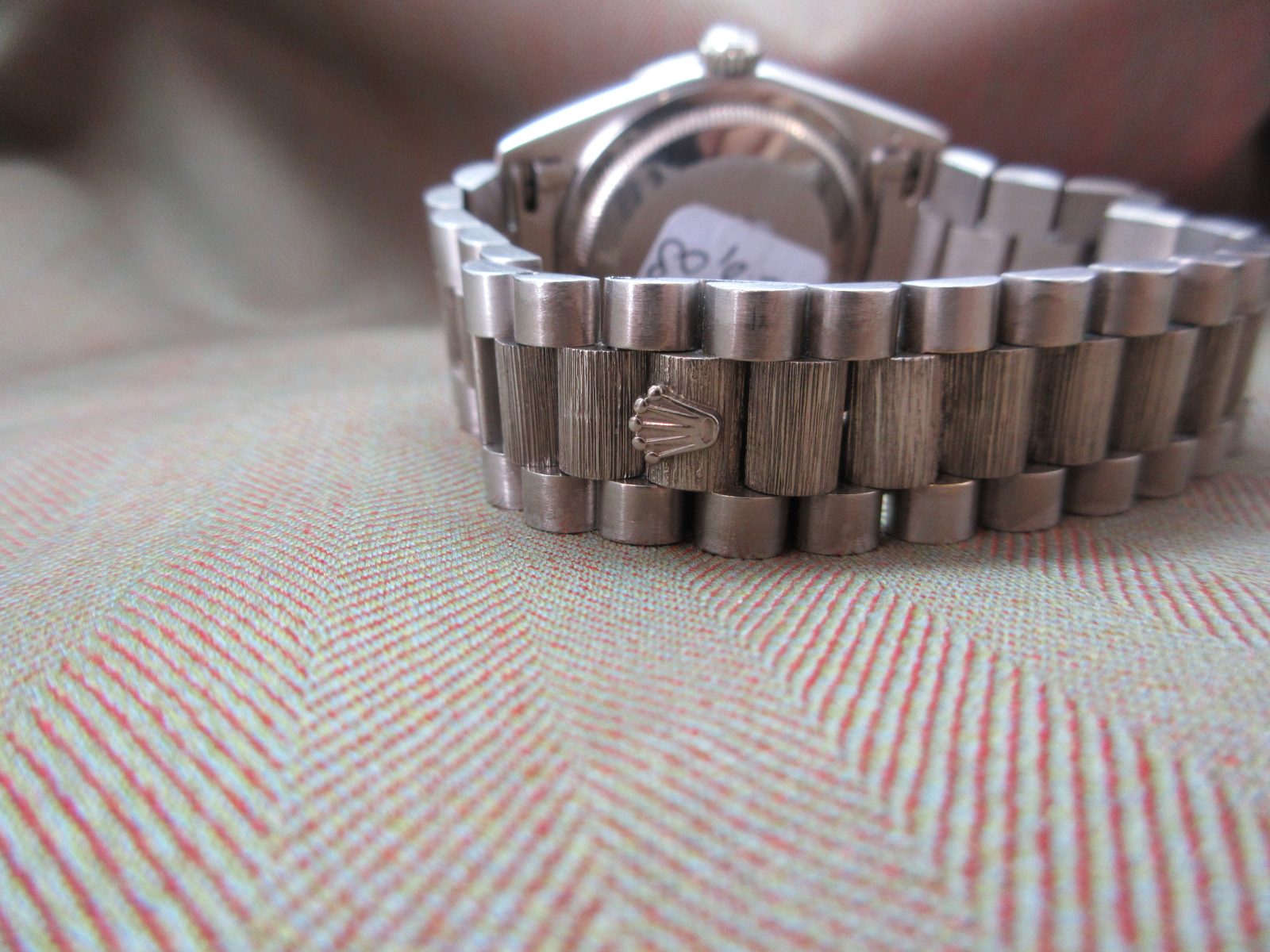 On its original 18k presidential bracelet with a bark finish, secured by the original Rolex clasp, fitting a wrist size of 7 inches.