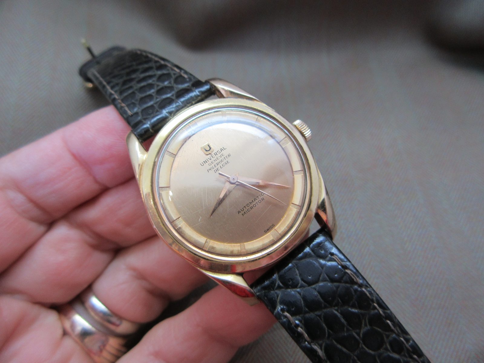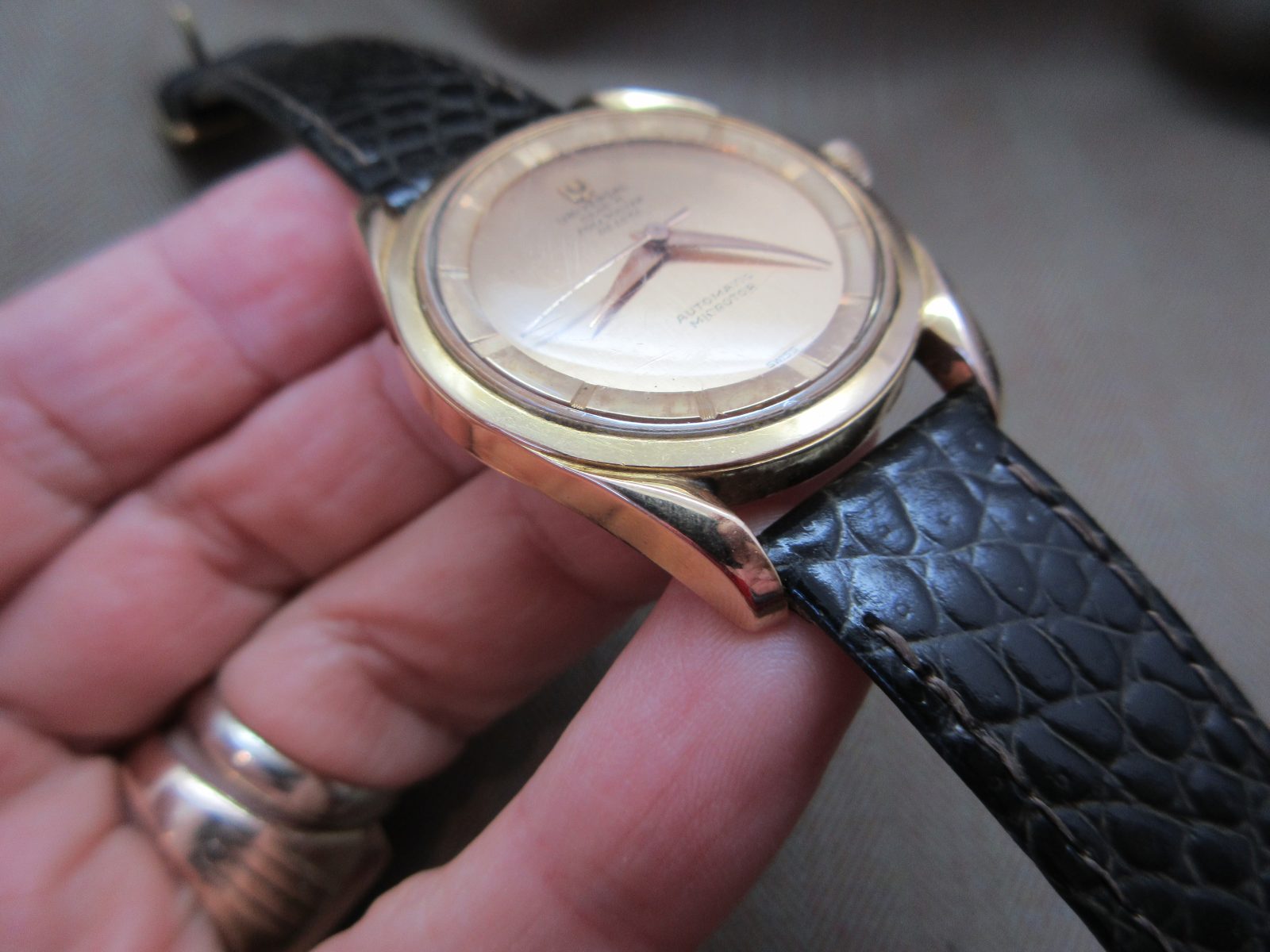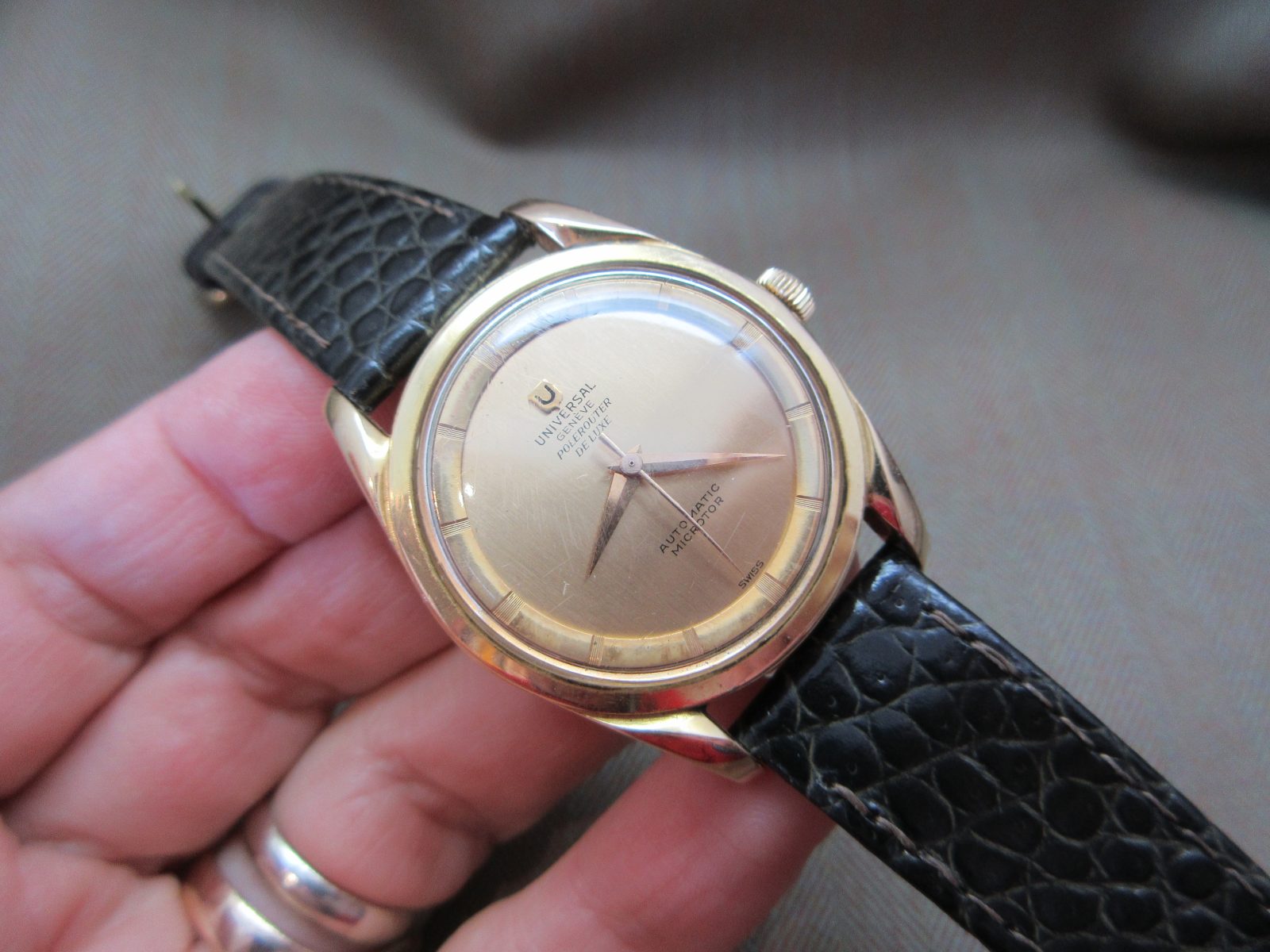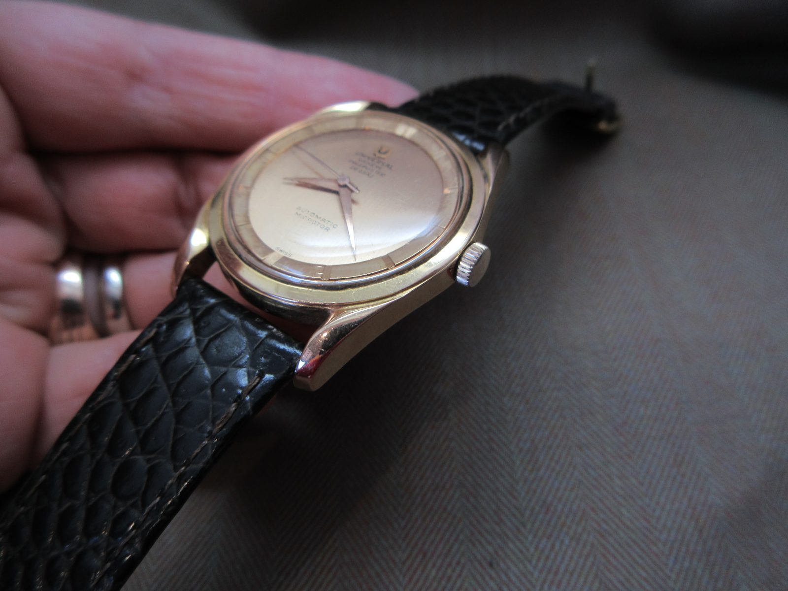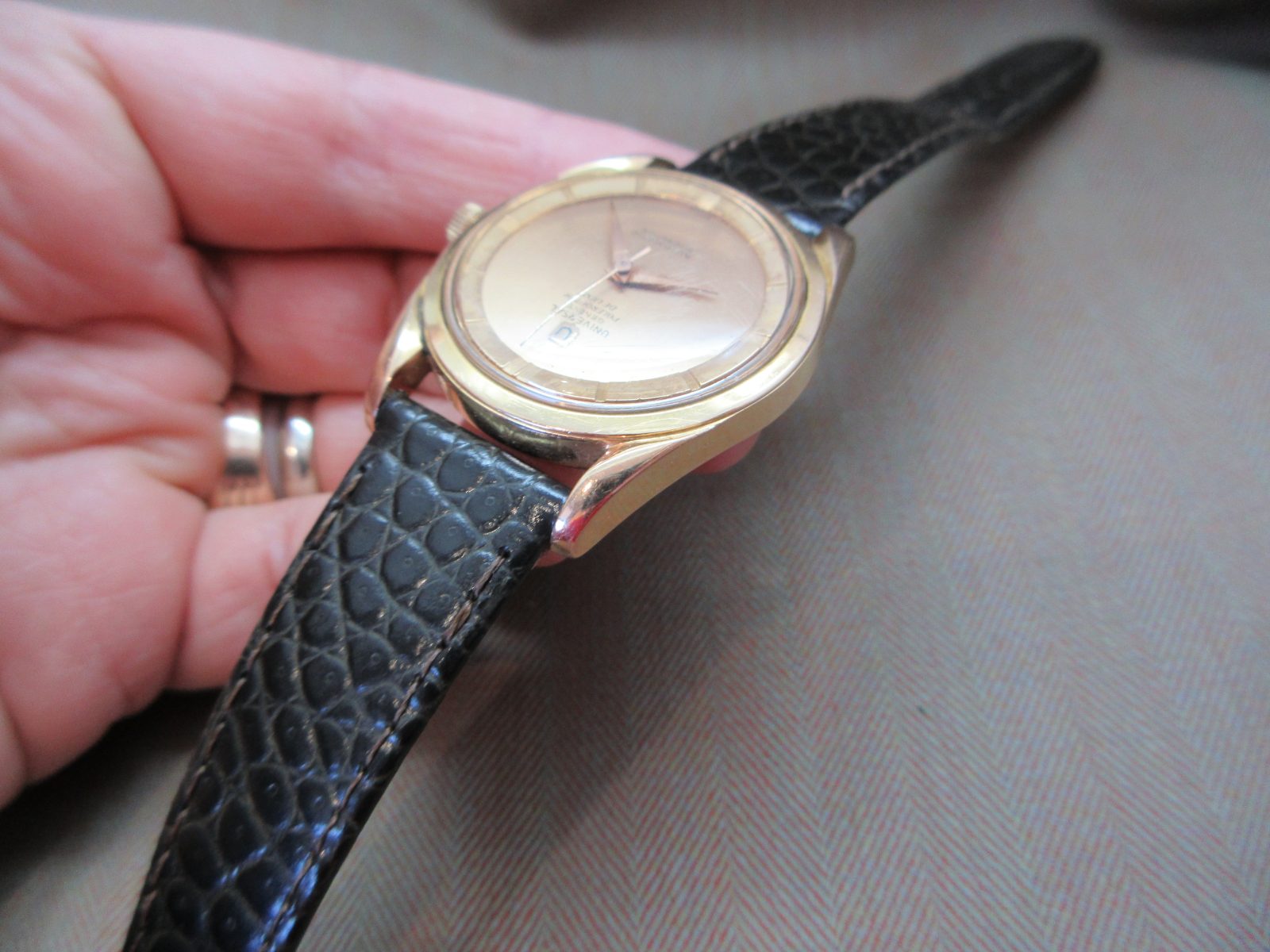 On a generic lizard skin strap secured by a generic gold-tone buckle.