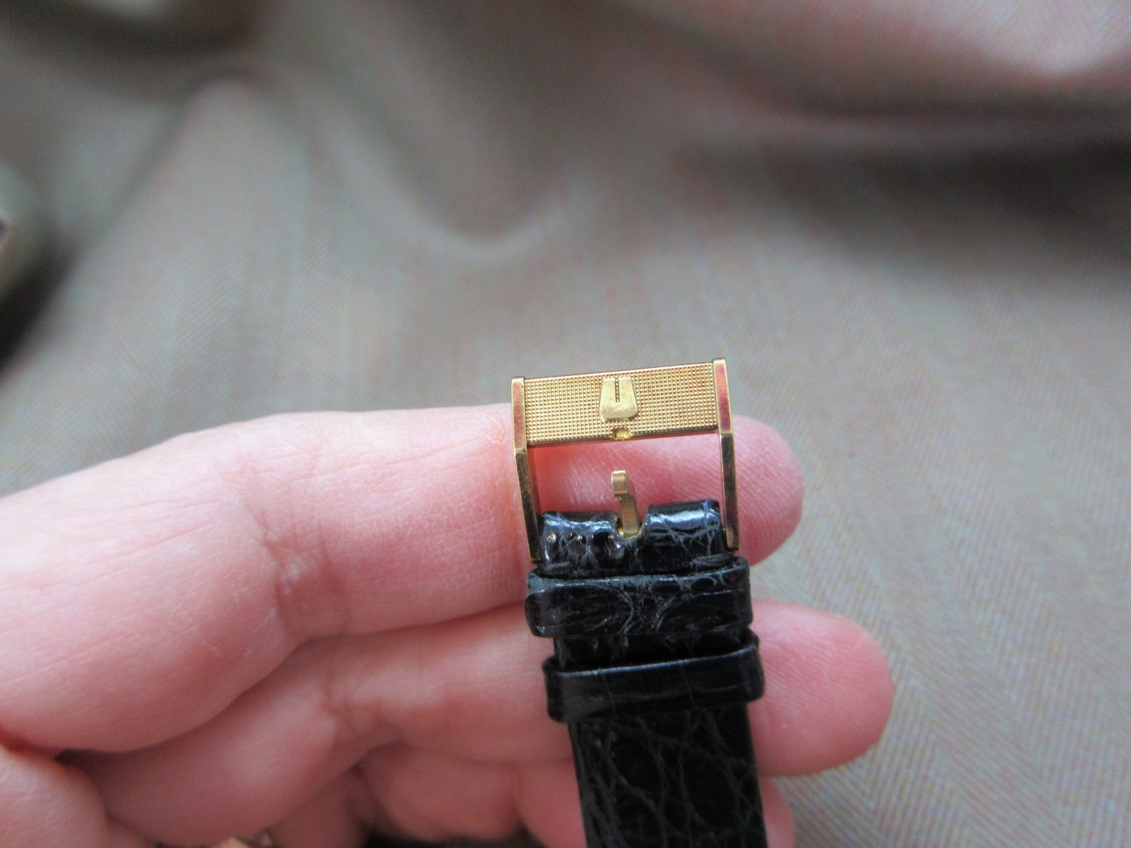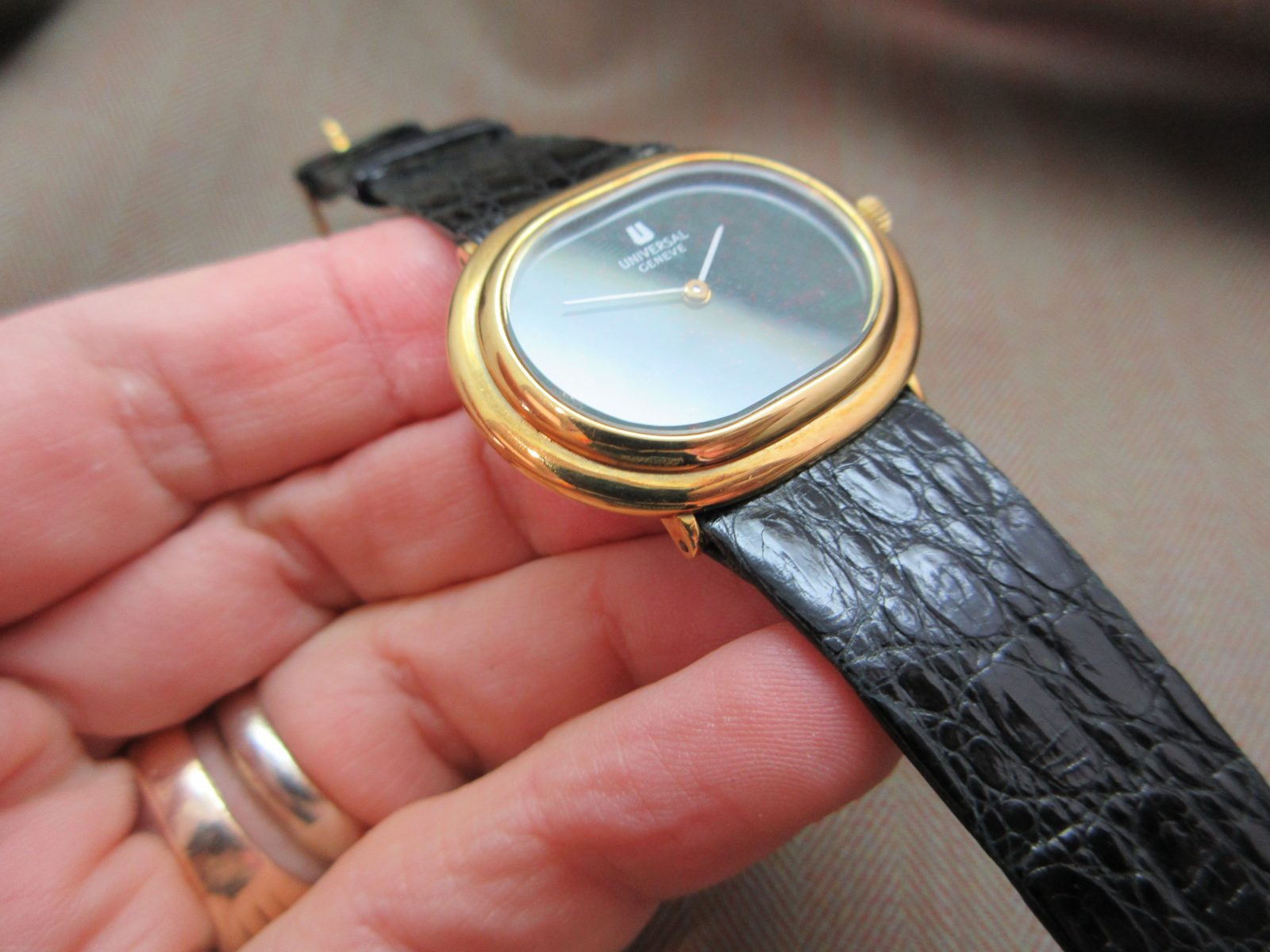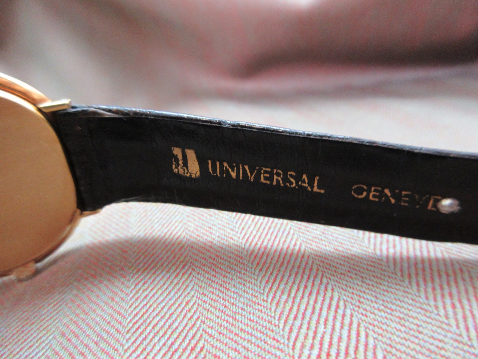 On its original crocodile skin strap, secured by the original Universal-signed buckle.