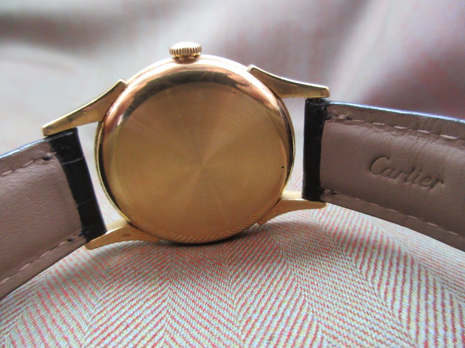 On a Cartier-signed alligator strap, secured by a Cartier ardillon buckle.