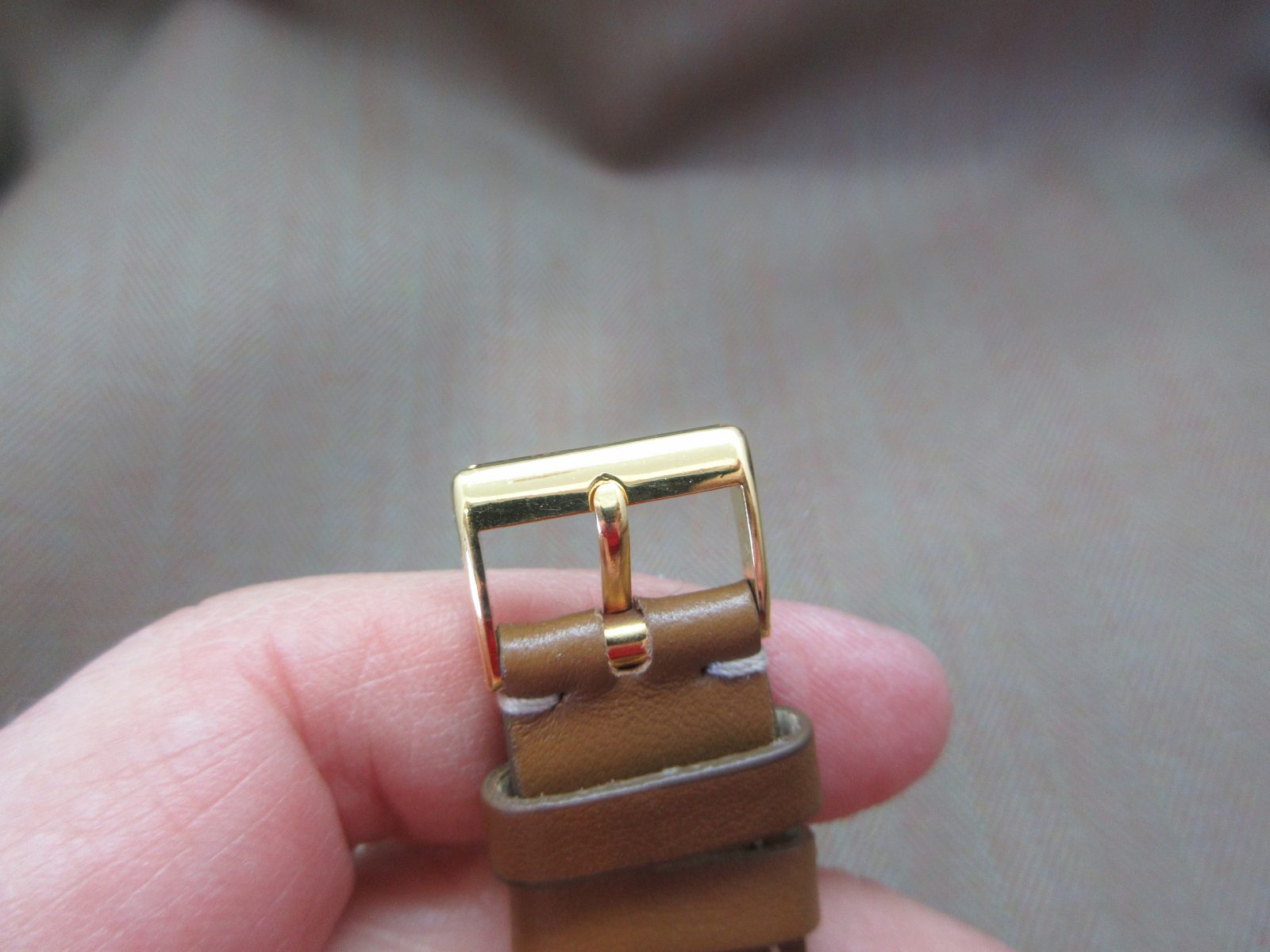 The two-tone triple calendar dial is in nice condition with applied dagger markers.